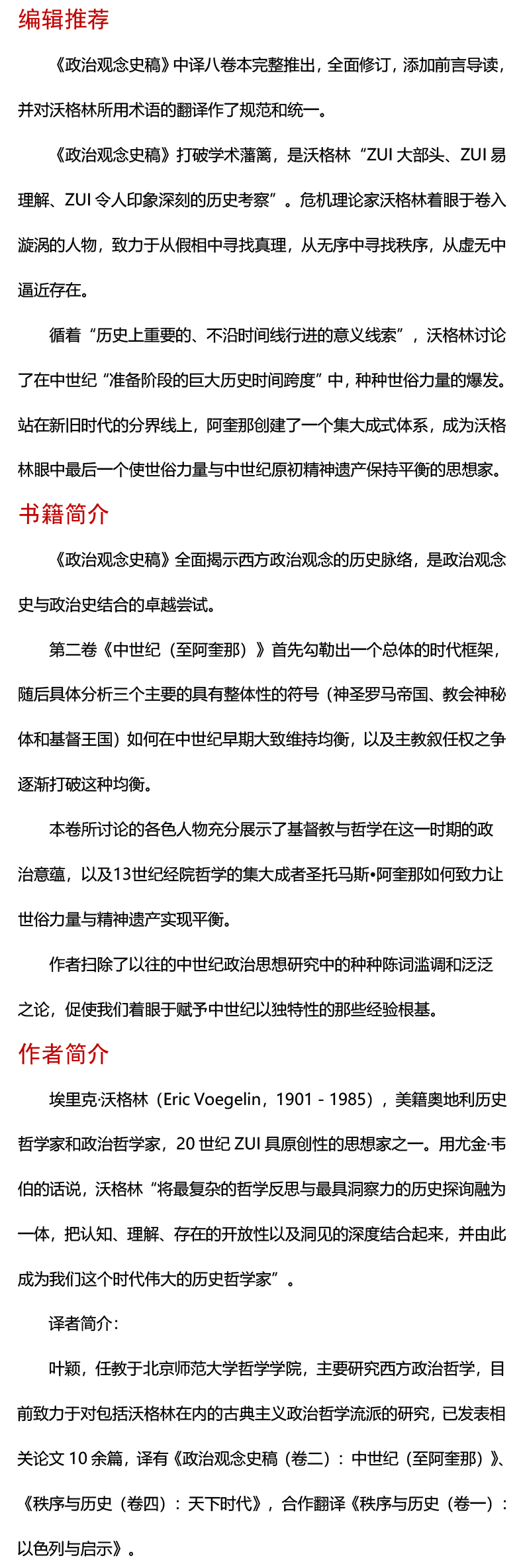 政治观念史稿卷二 中世纪至阿奎那 精装修订版 全新中译本 沃格林毕生之作真正核心 政治观念史哲学