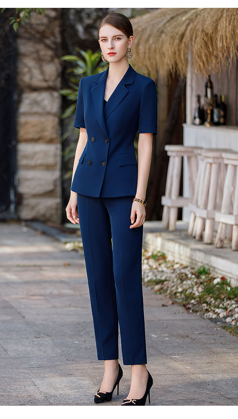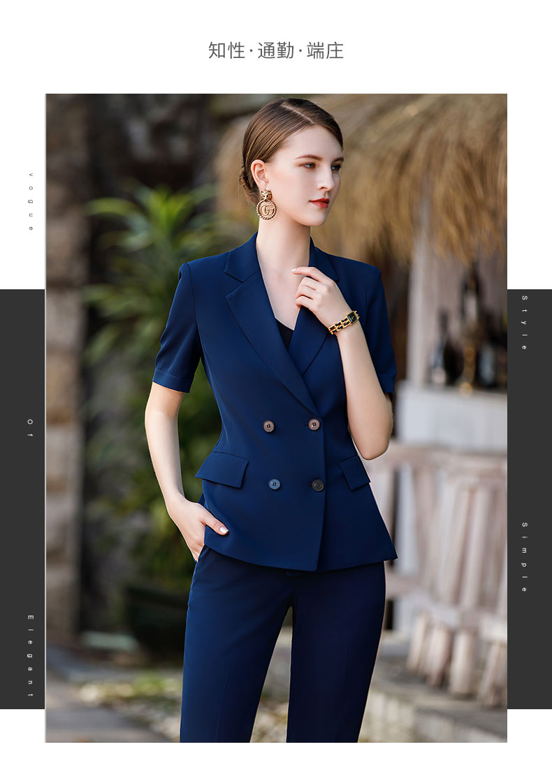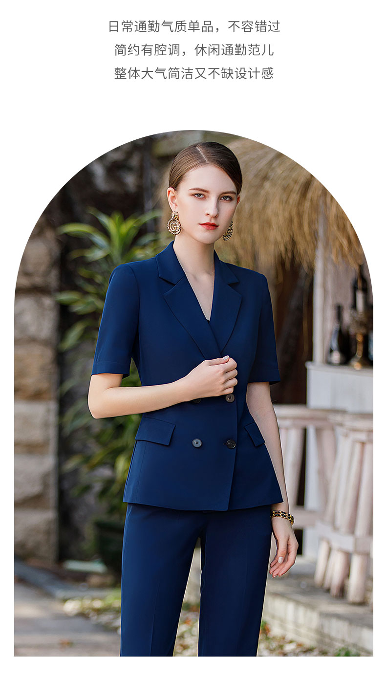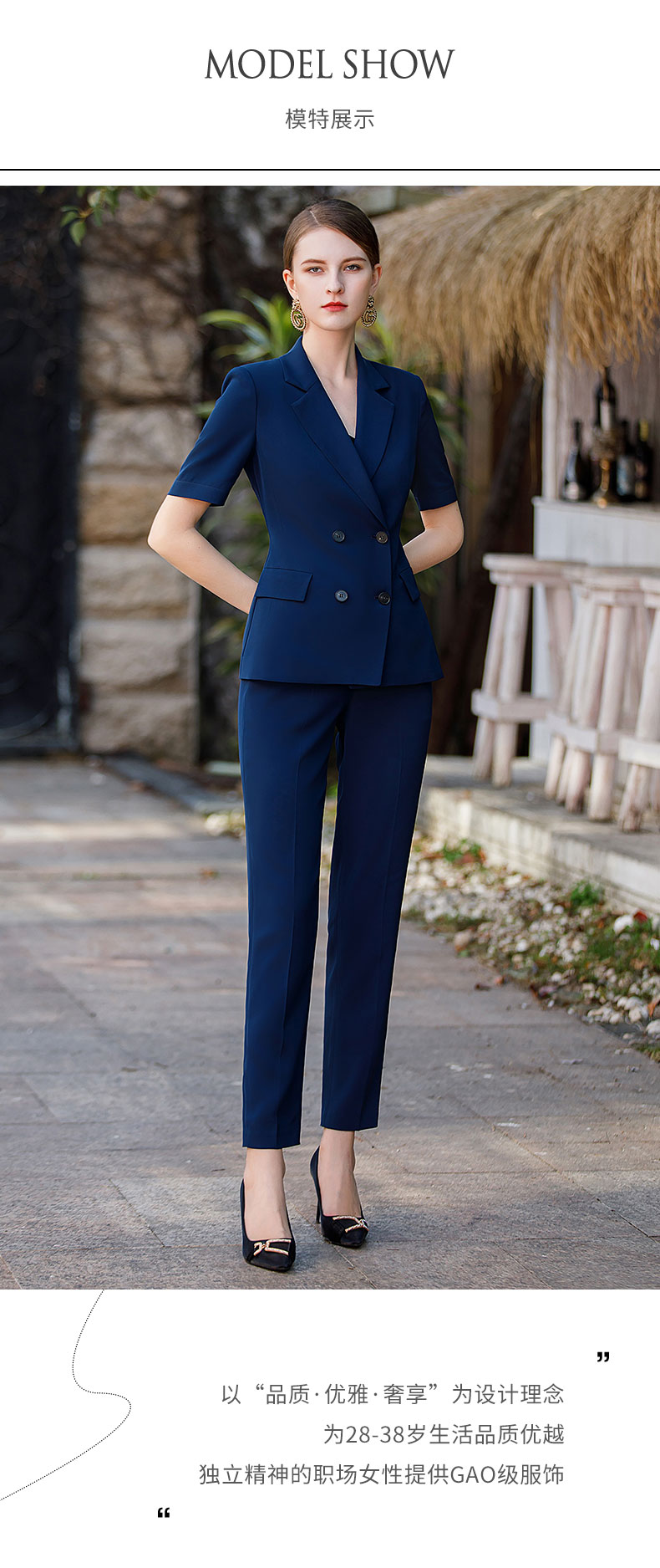 AD高端职业装正装女总裁商务套装藏青色短袖西服双排扣气质工作服