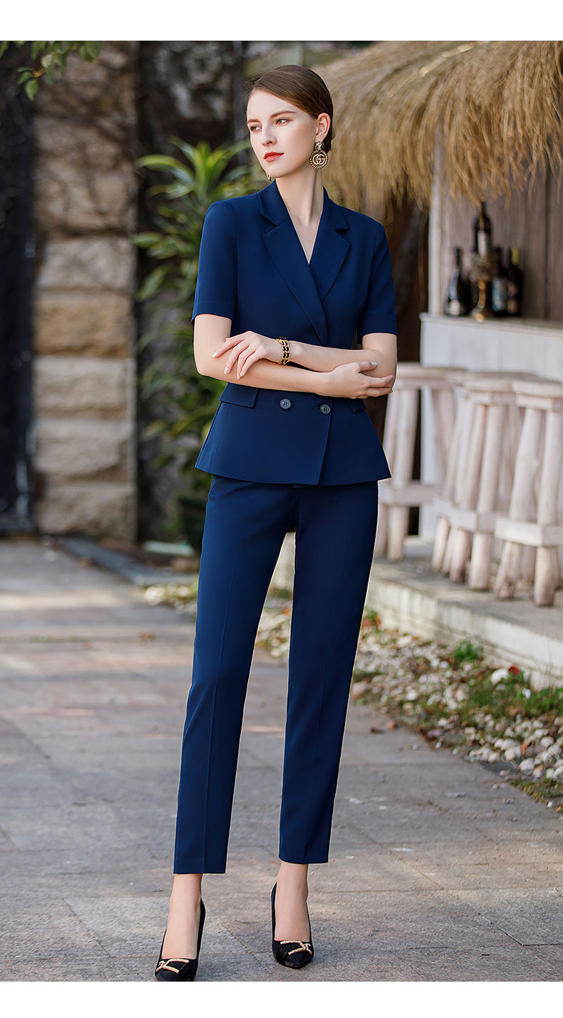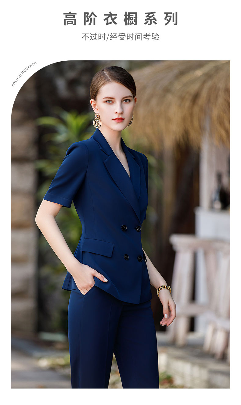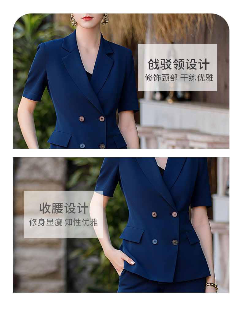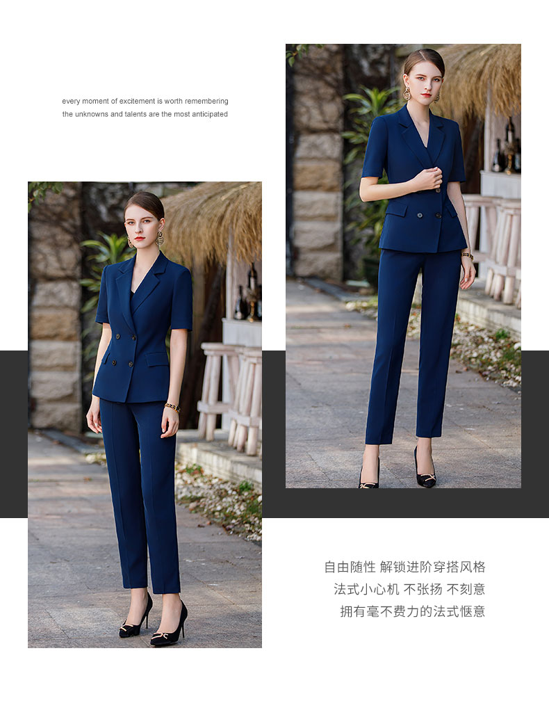 AD高端职业装正装女总裁商务套装藏青色短袖西服双排扣气质工作服