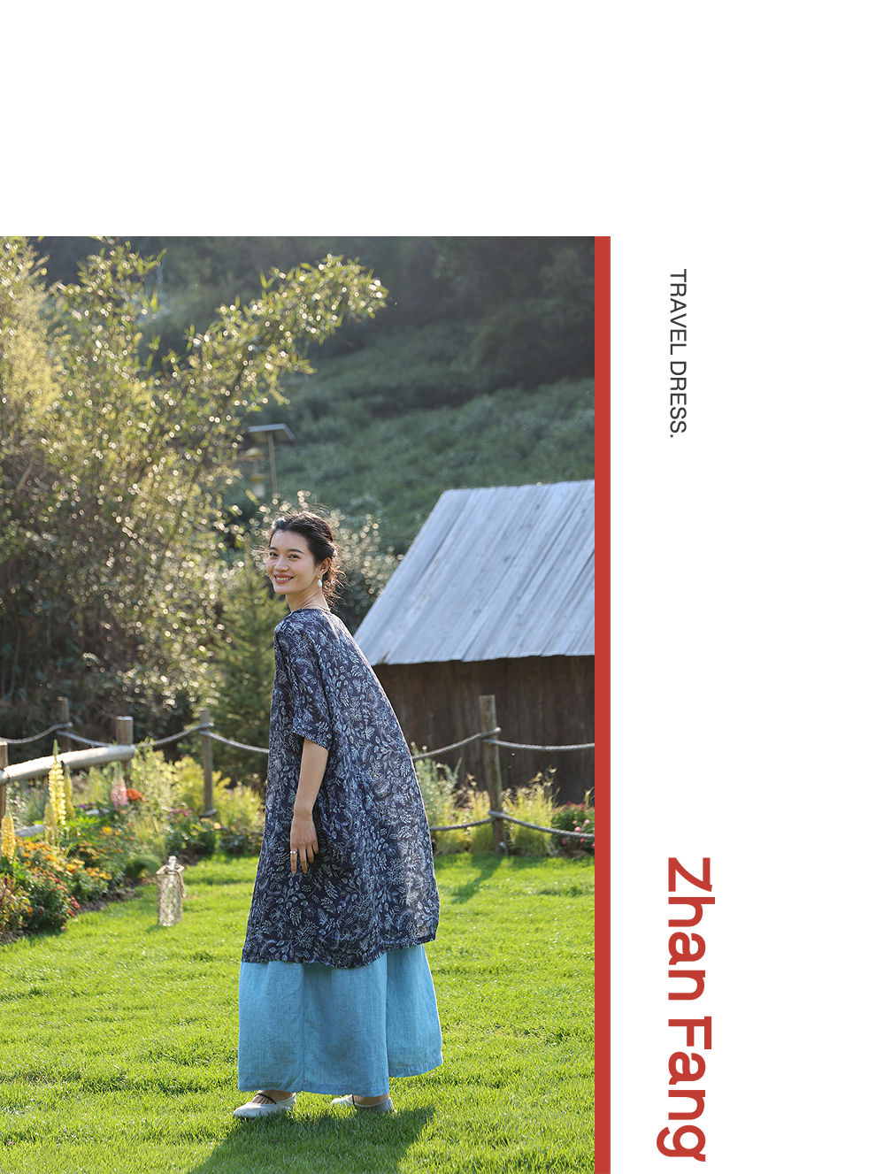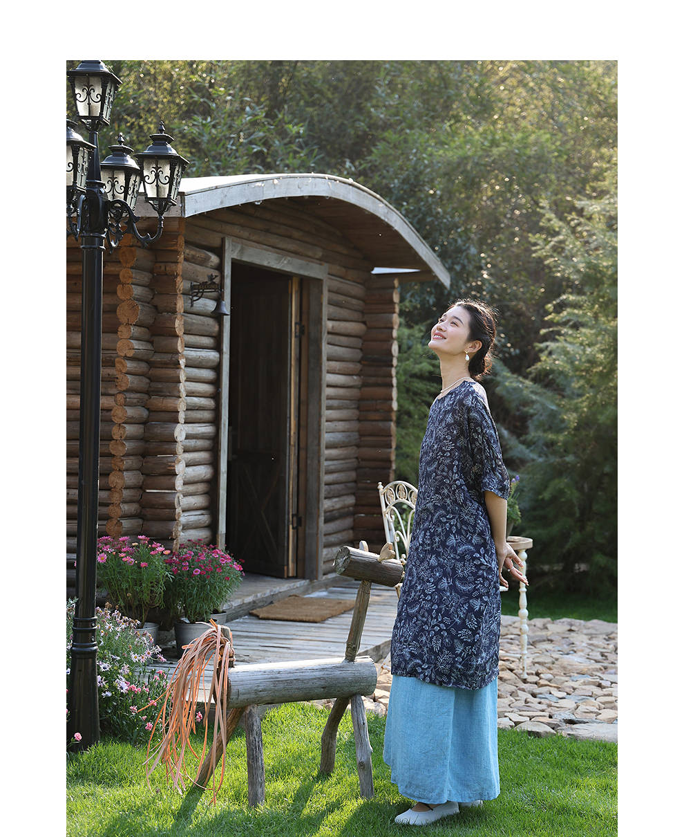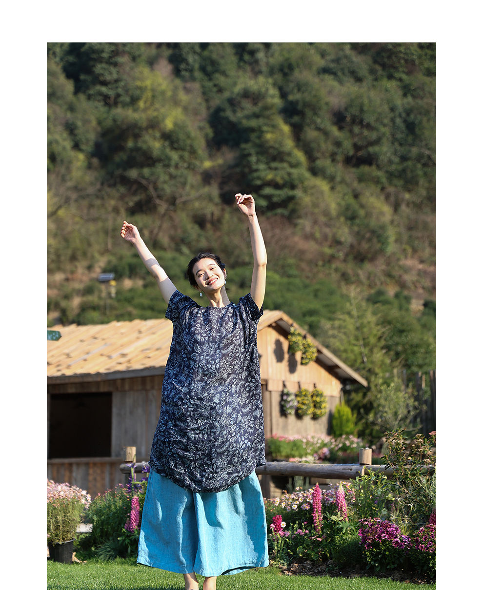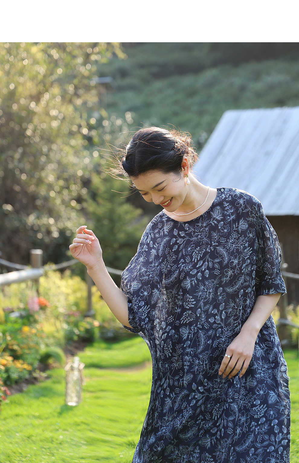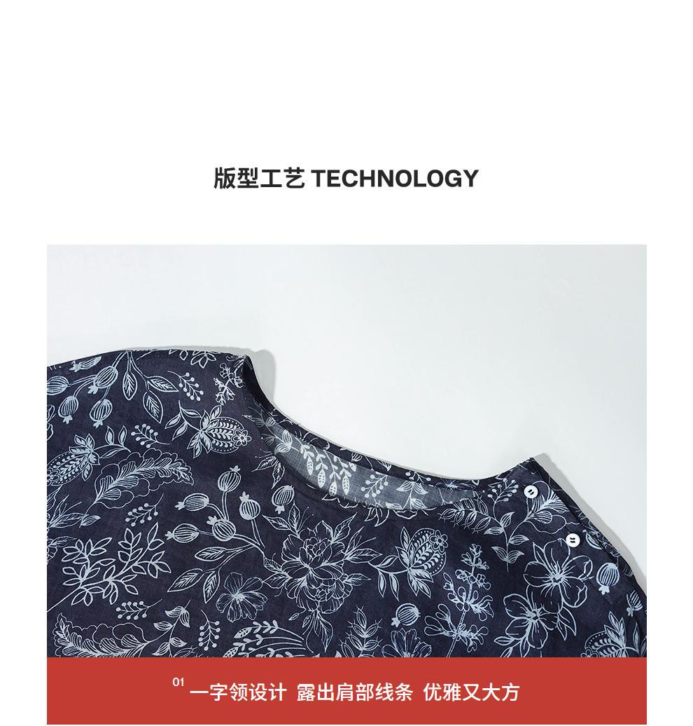 绽放243朵/繁花连衣裙砂洗苎麻蓝花连身蝙蝠袖一字领印花中袖裙子