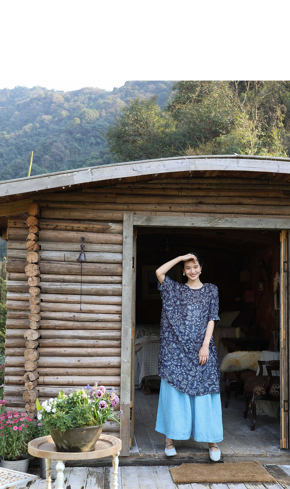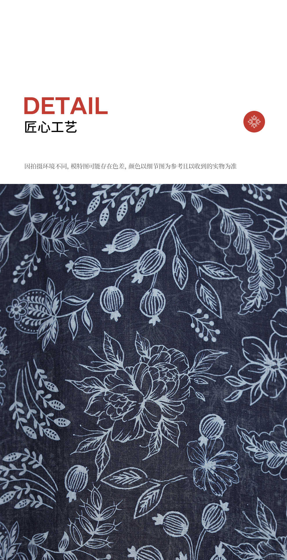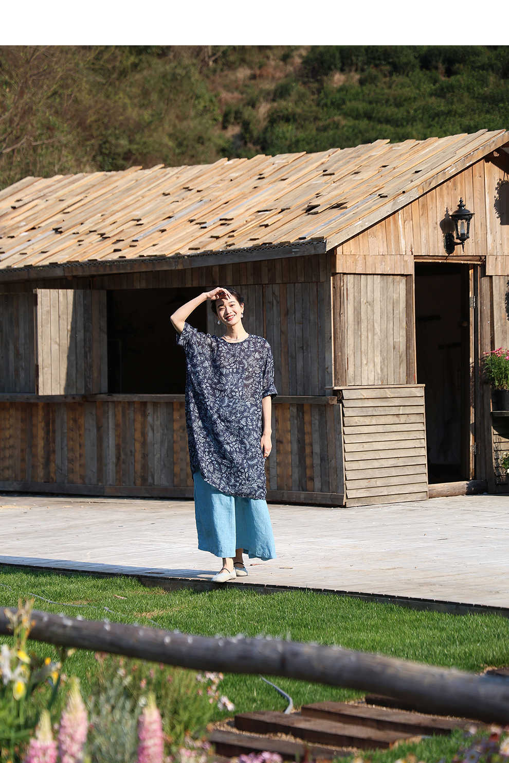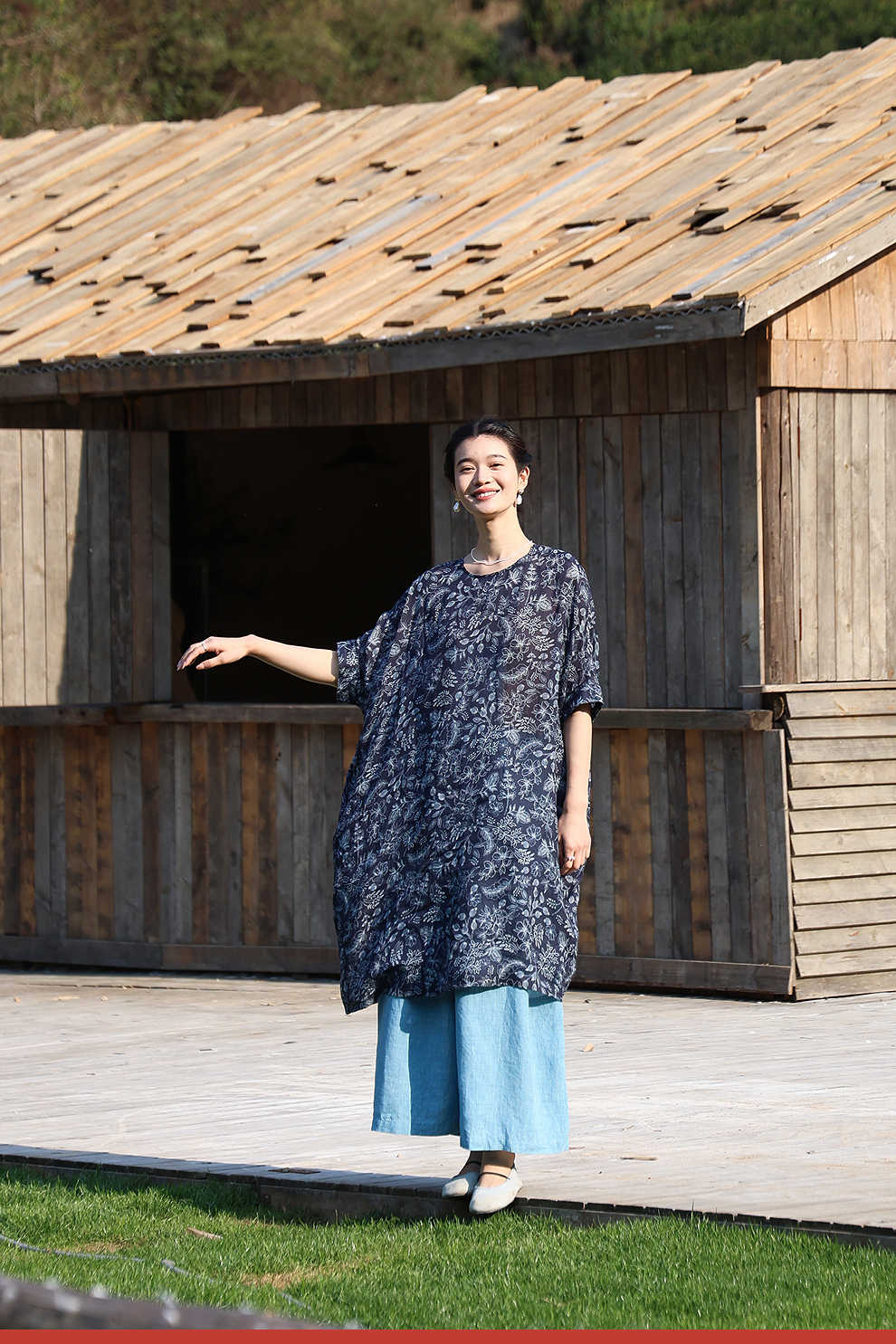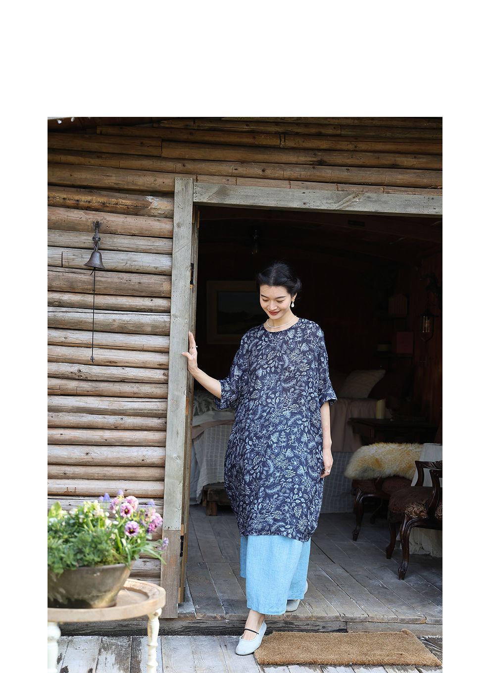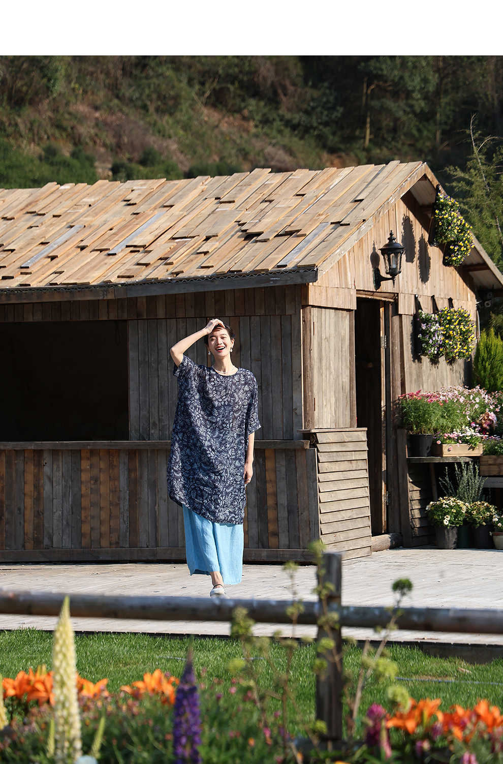 绽放243朵/繁花连衣裙砂洗苎麻蓝花连身蝙蝠袖一字领印花中袖裙子