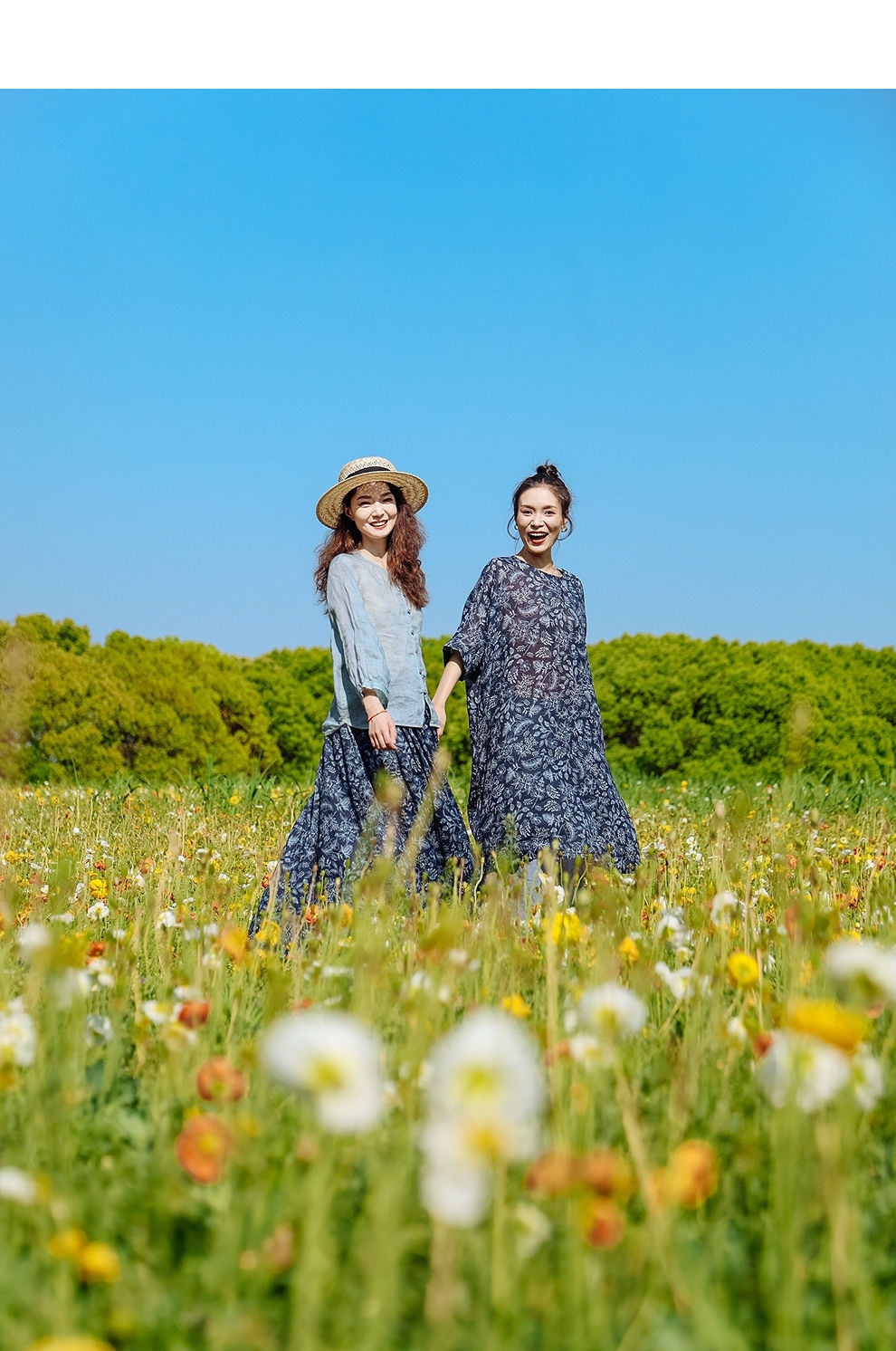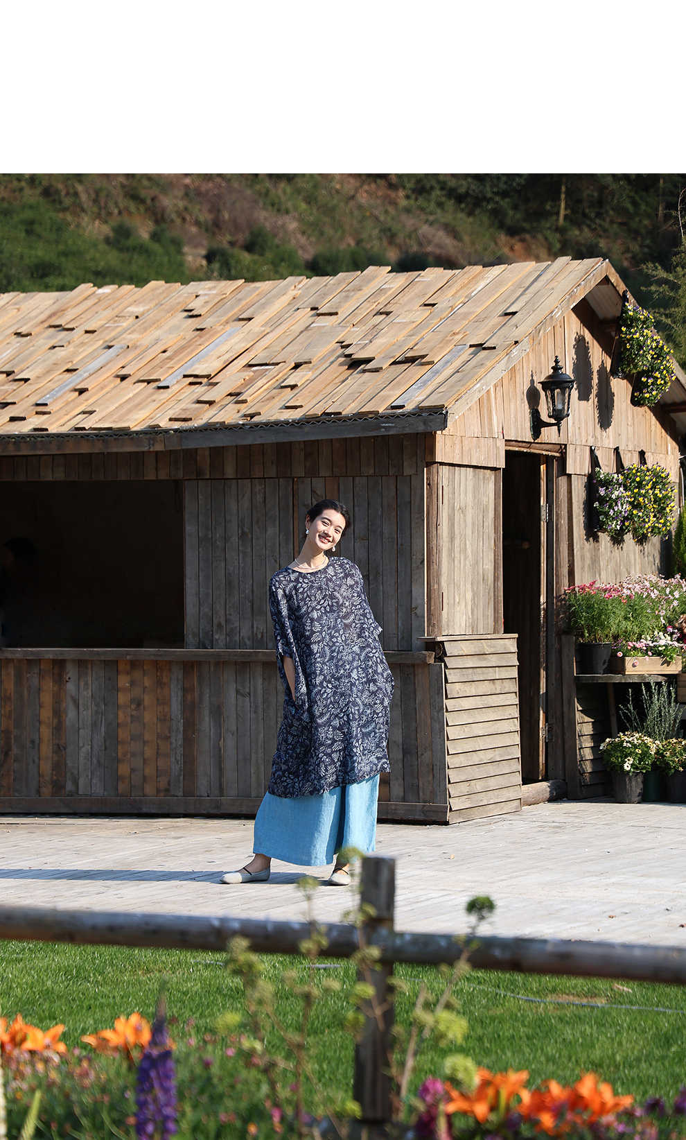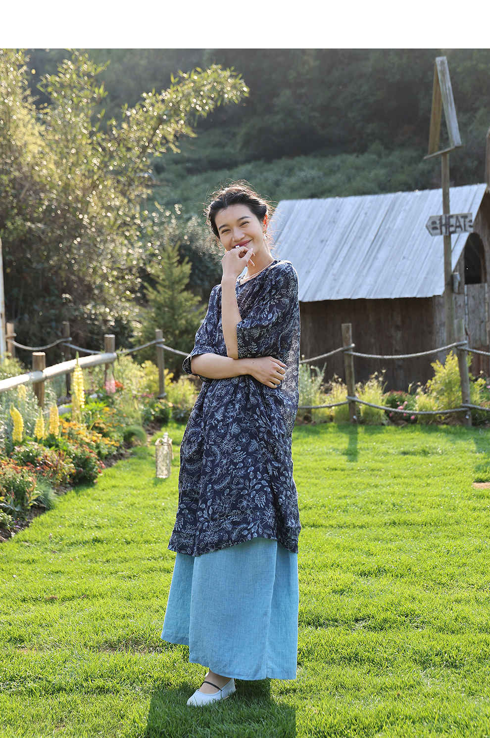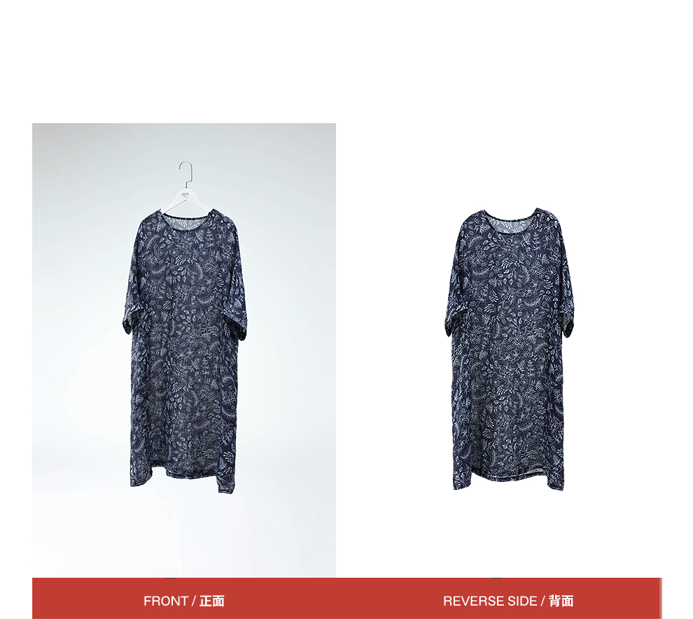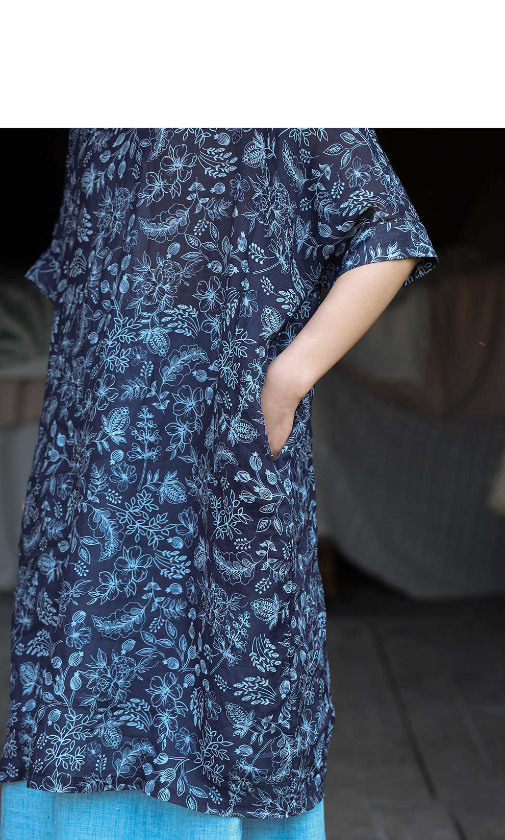 绽放243朵/繁花连衣裙砂洗苎麻蓝花连身蝙蝠袖一字领印花中袖裙子