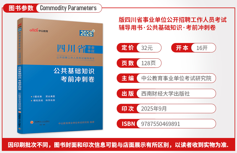 《中公版2026四川省事业单位公开招聘工作人员考试辅导用书:公共基础知识考前冲刺卷》严格依据四川省事业单位考试公共基础知识科目真题编写。本书具有以下特点: 1.针对性强。本书内含5套冲刺卷,题型题量以及考点分布均根据四川省事业单位考试公共基础知识科目的历年真题设置,是一本针对四川省事业单位考试公共基础知识科目的考前冲刺试卷。 2.题型覆盖广。本书题型覆盖广、题量丰富,考生可根据此模拟实战,获得答题经验,开阔答题思路,了解考试的重难点,提高备考效率,达到事半功倍的效果。
