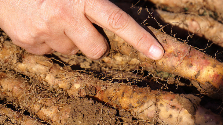 4、垆土土质坚硬,黏性大,山药在地下自然生长,所以它会长的弯弯扭扭,遇到更坚硬的土块或石头就会形成分叉的情况。