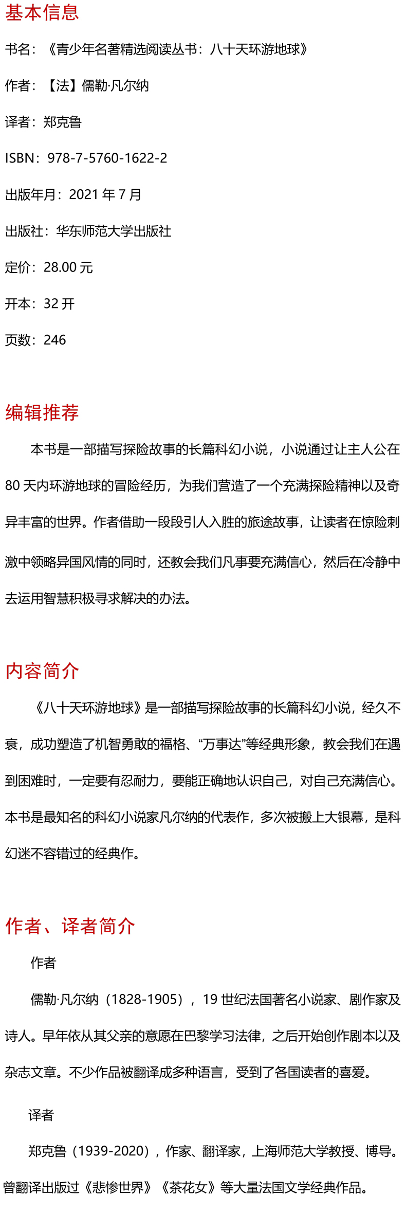八十天环游地球 青少年名著精选阅读丛书 凡尔纳经典科幻小说 青少年成长必读冒险书 郑克鲁翻译