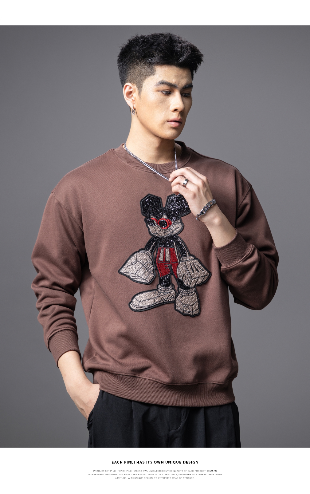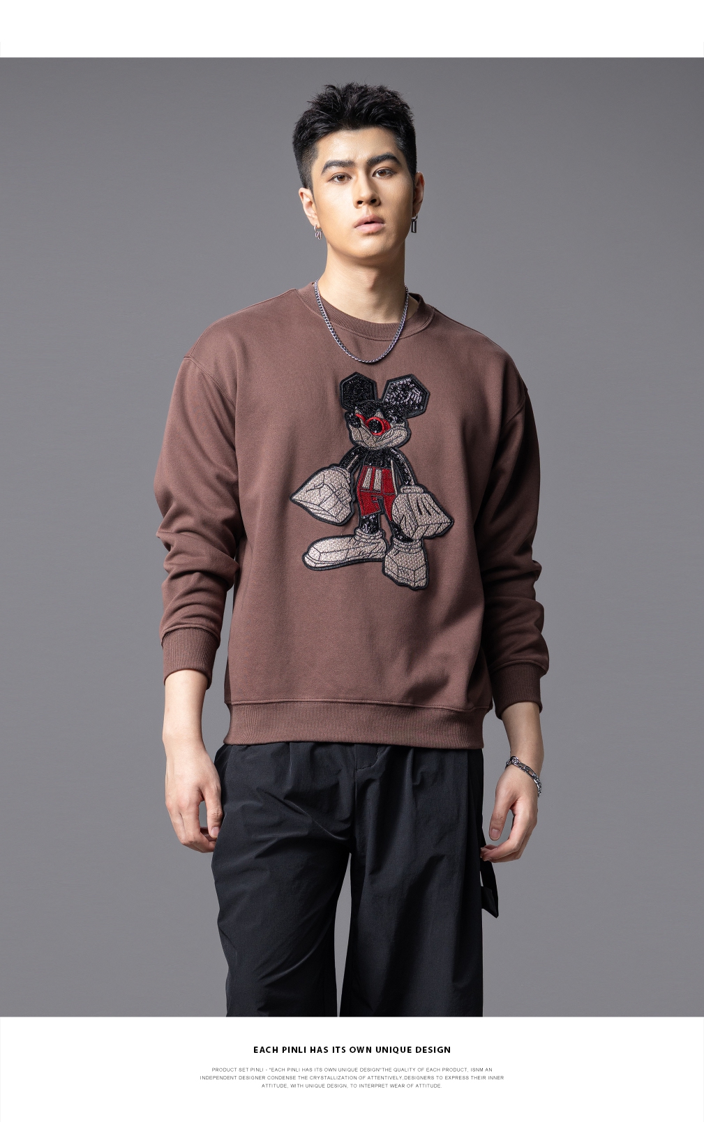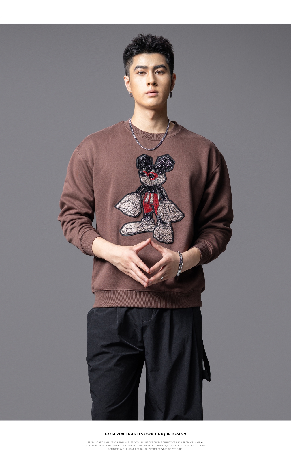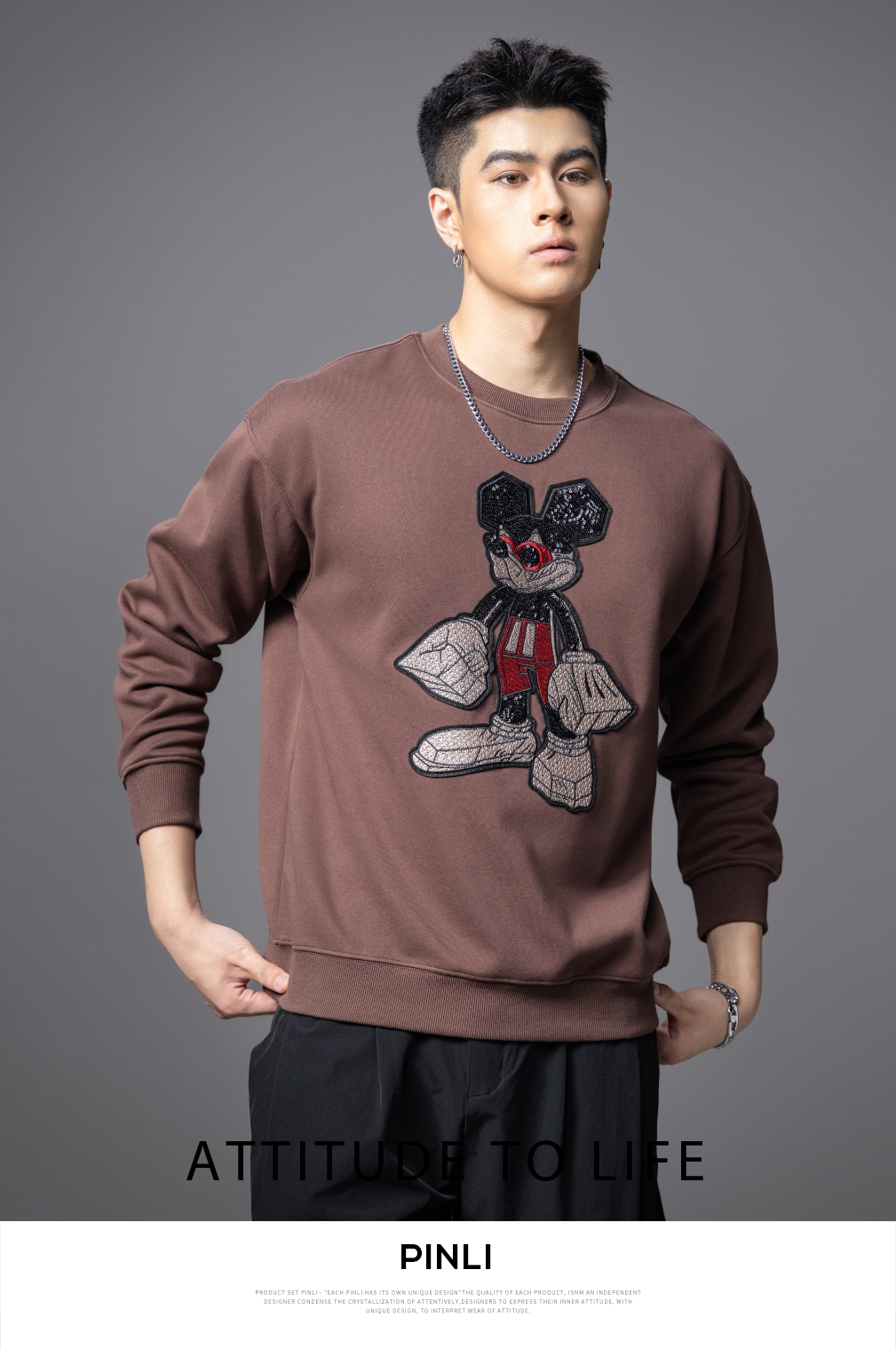 PINLI品立2025秋冬新品亮片卡通圆领卫衣潮牌宽松休闲套头男上衣BG253109001