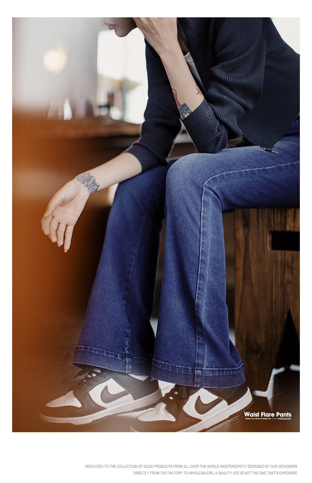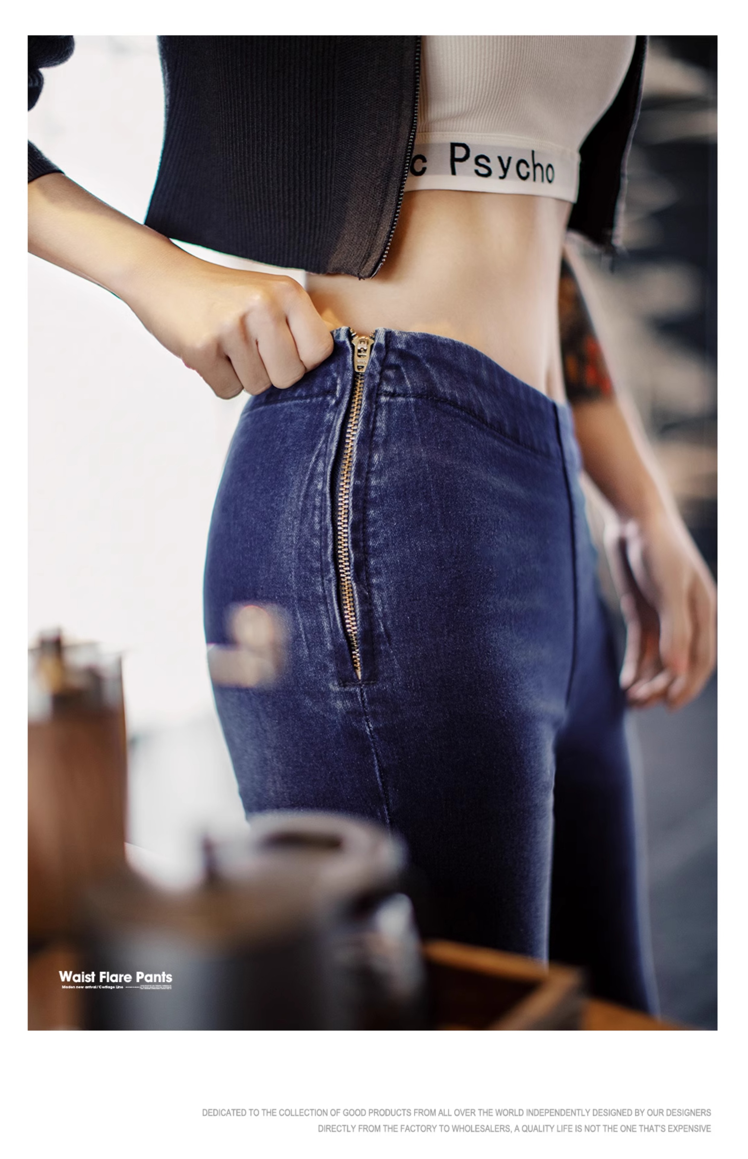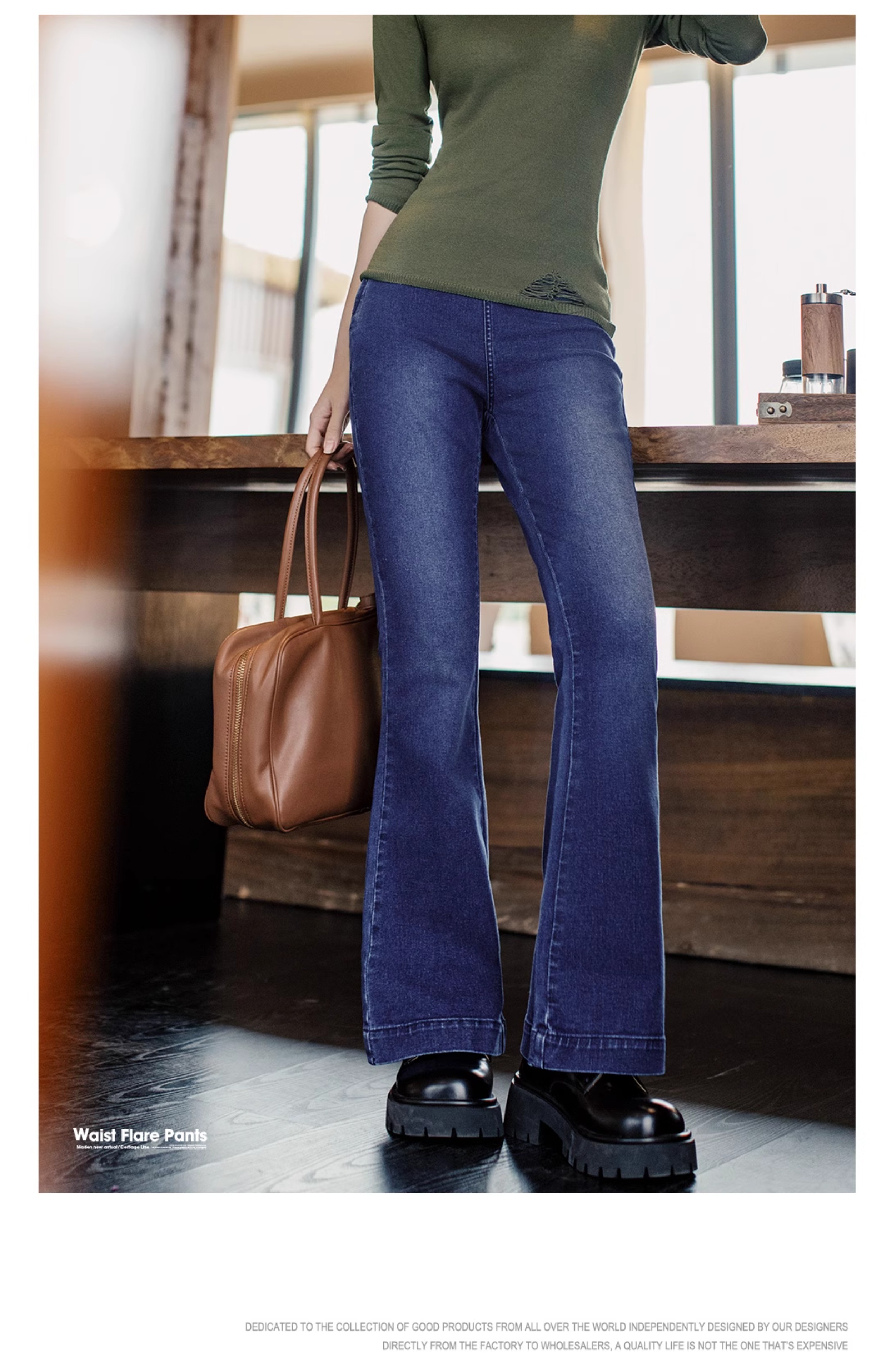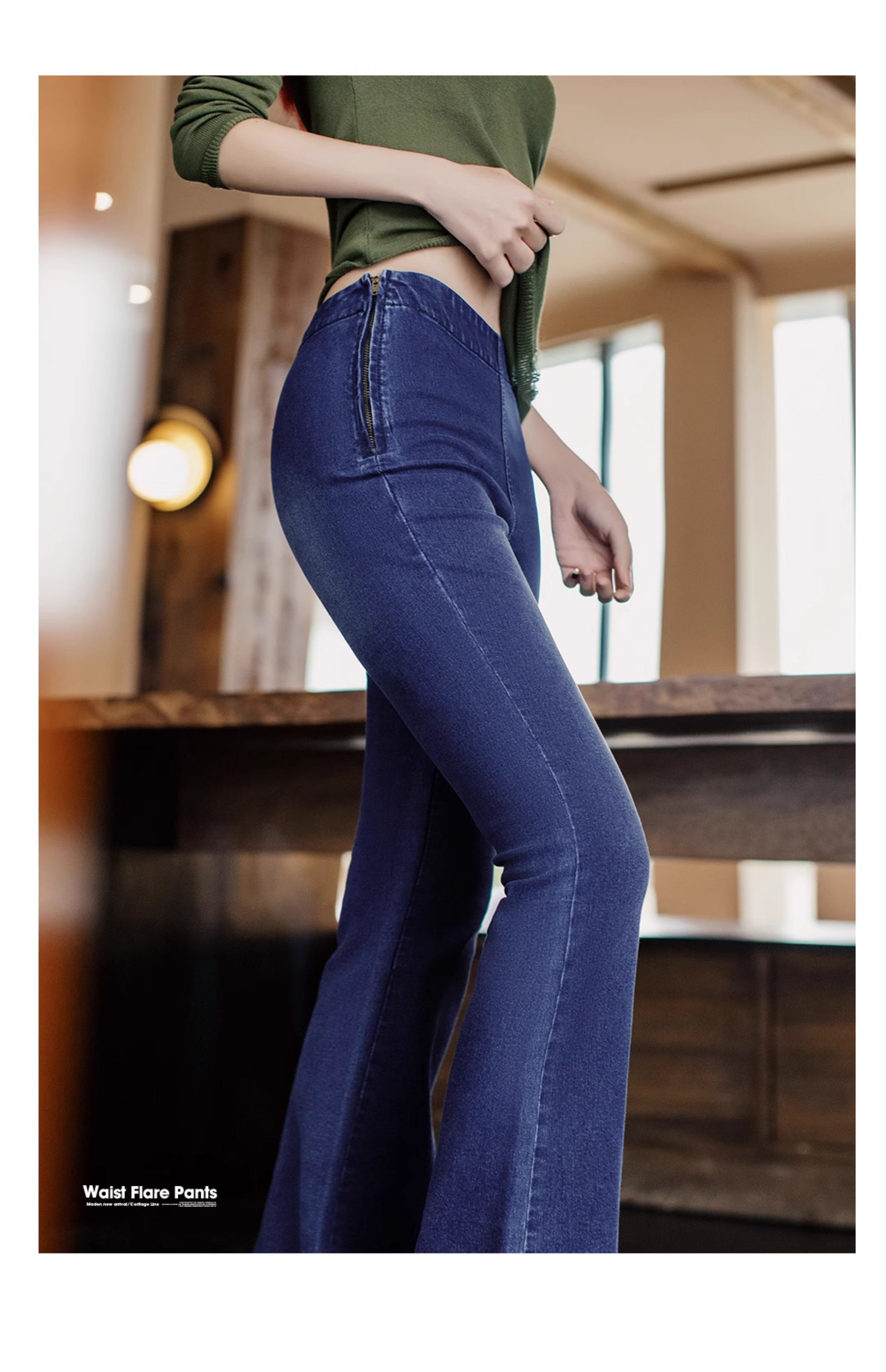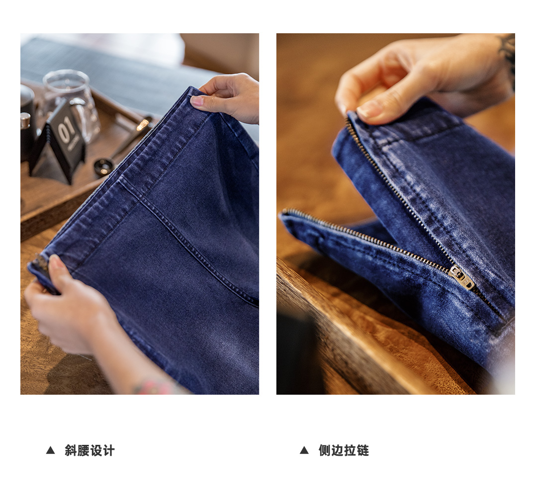 马登baby蓝斜腰cleanfit水洗微喇牛仔裤复古侧拉链微弹阔腿裤春女