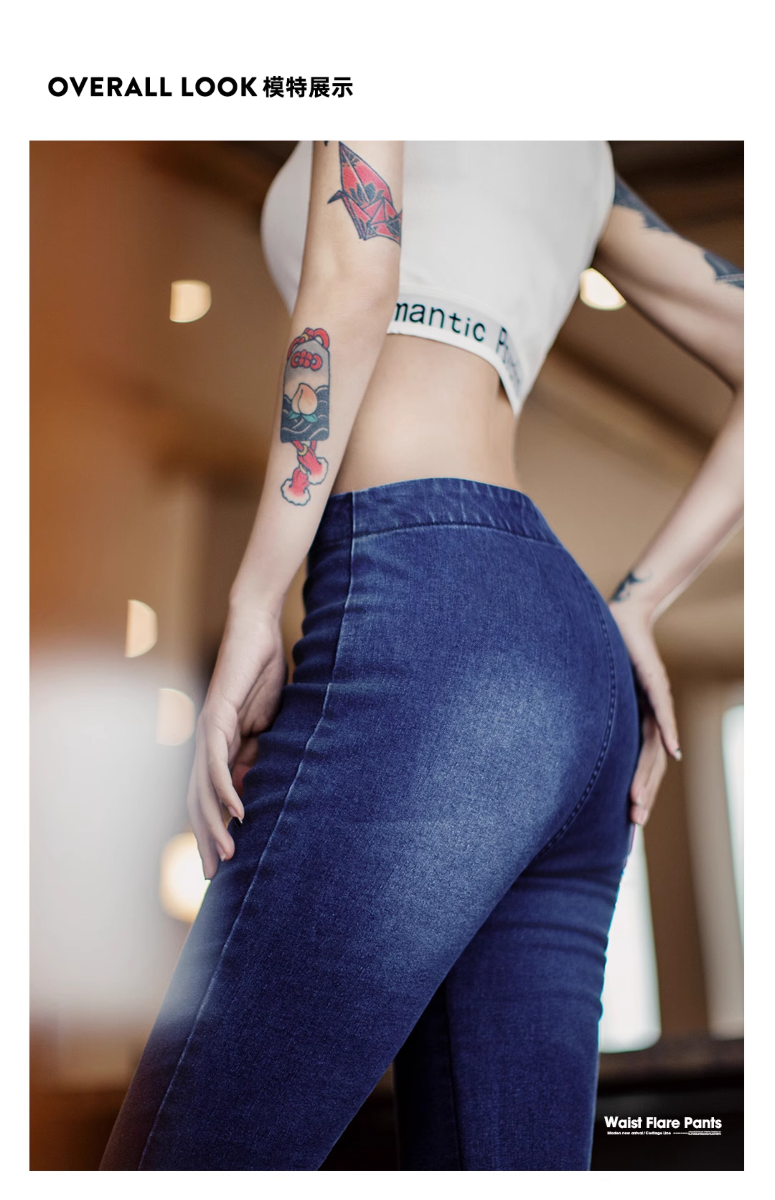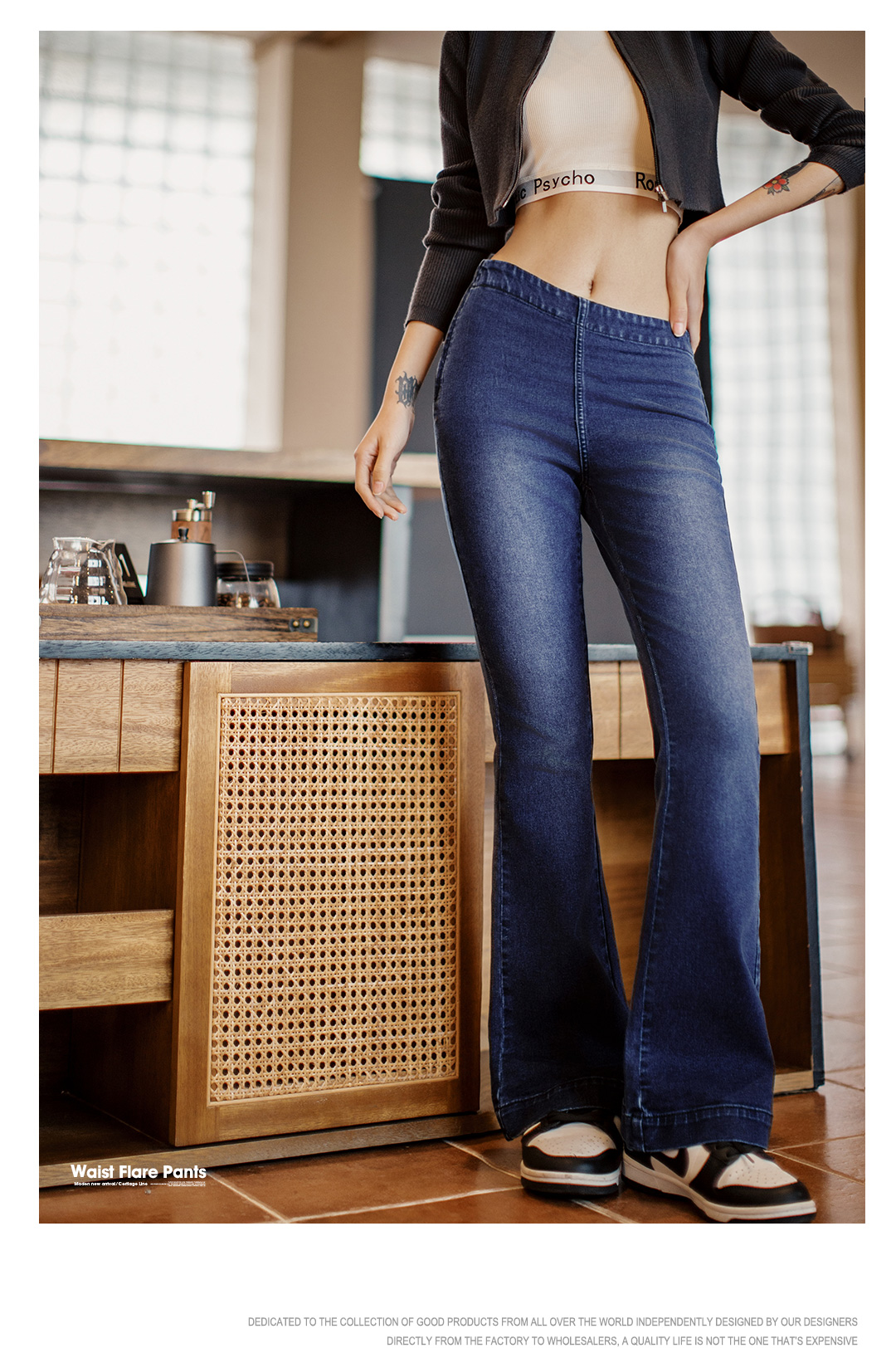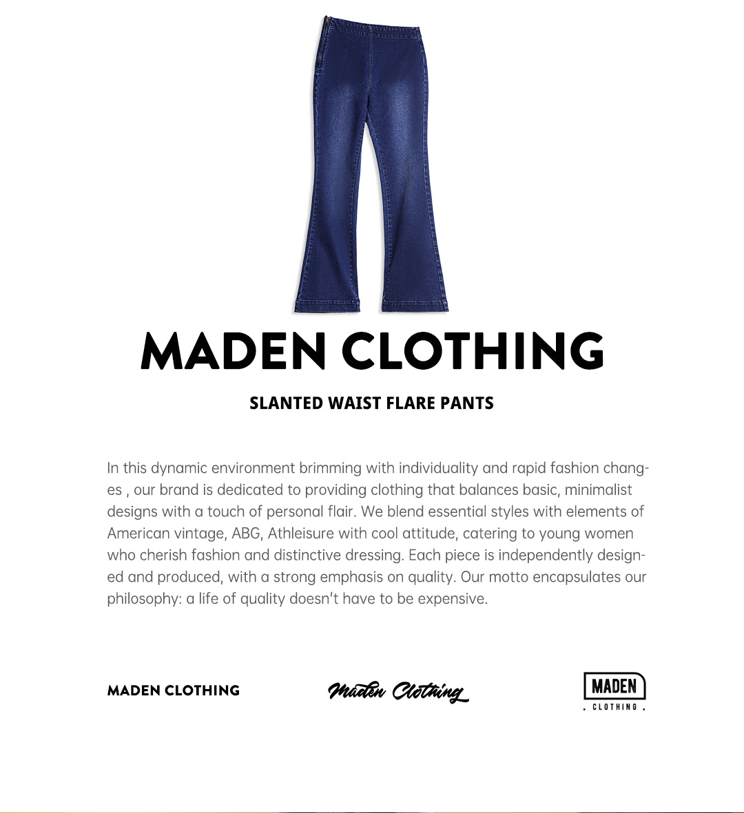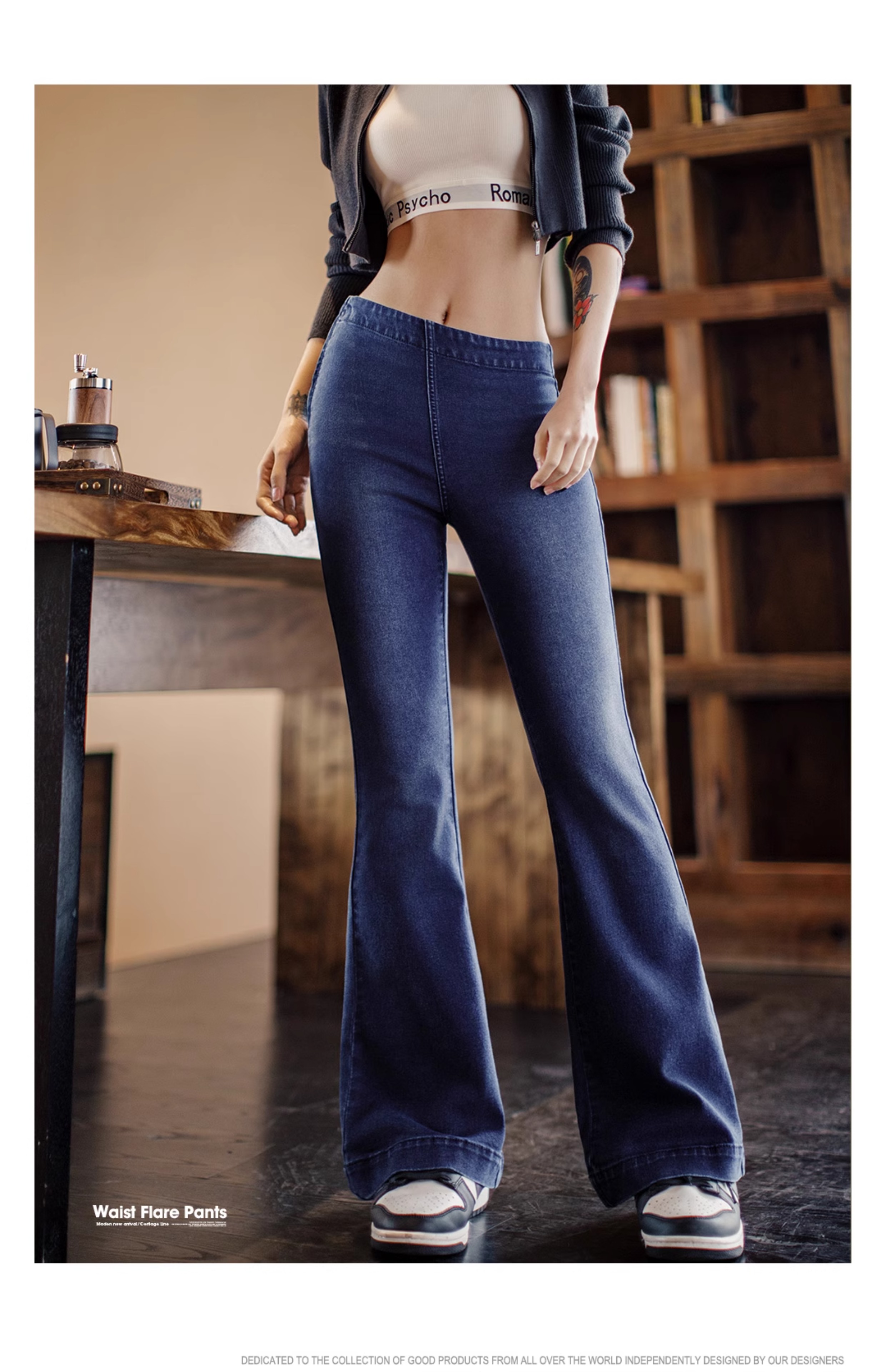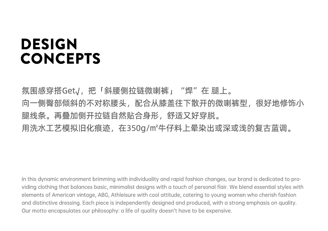 马登baby蓝斜腰cleanfit水洗微喇牛仔裤复古侧拉链微弹阔腿裤春女
