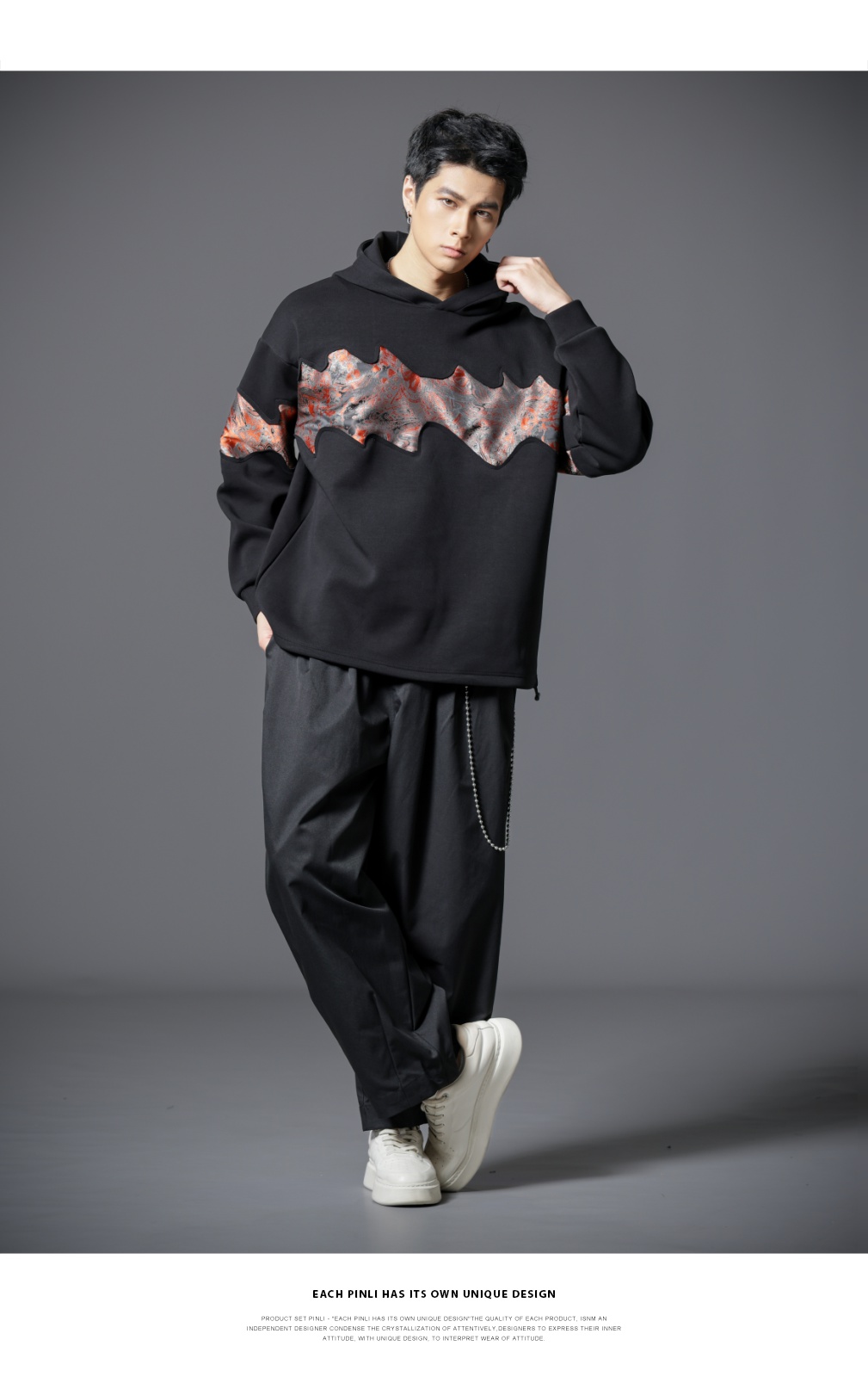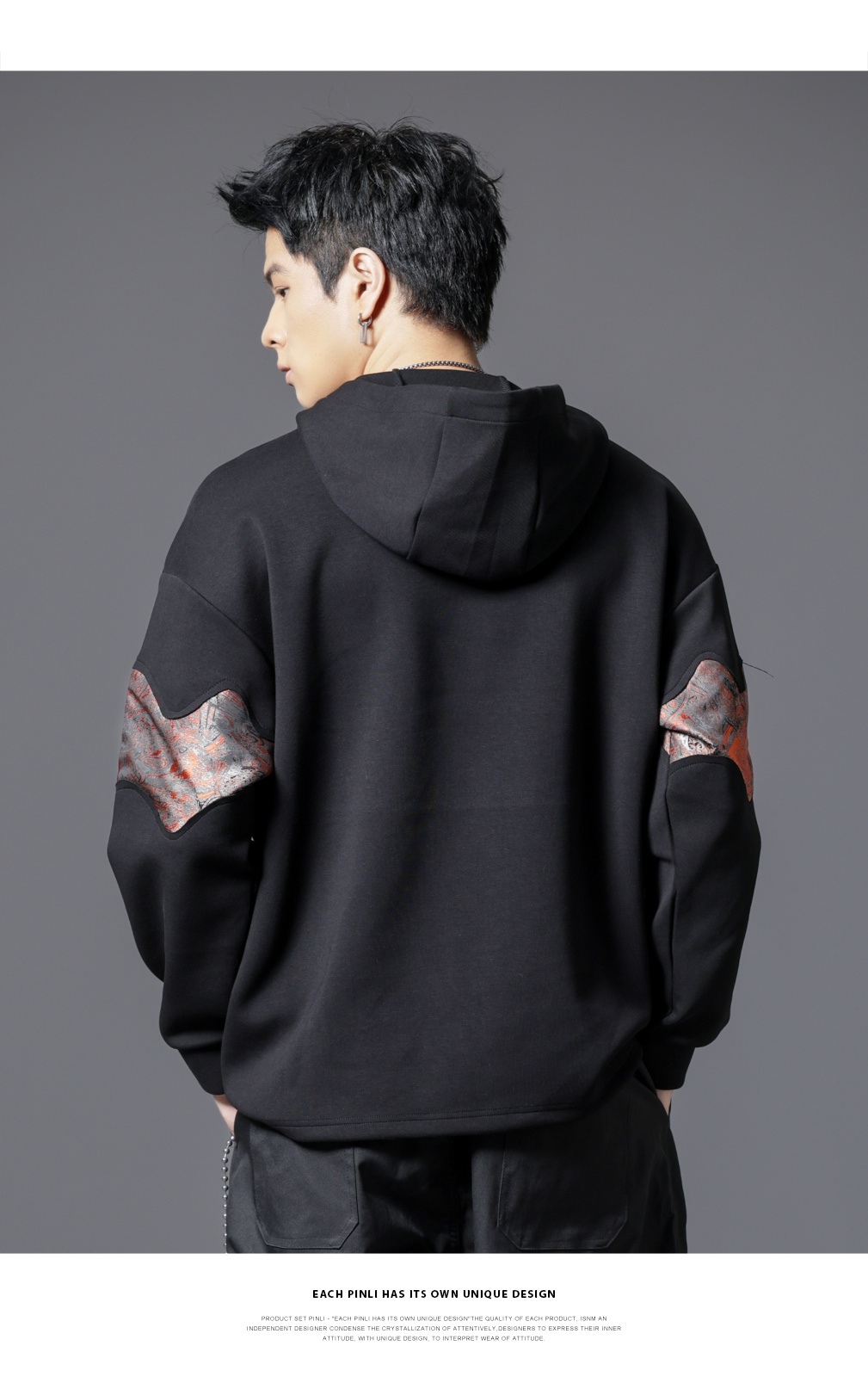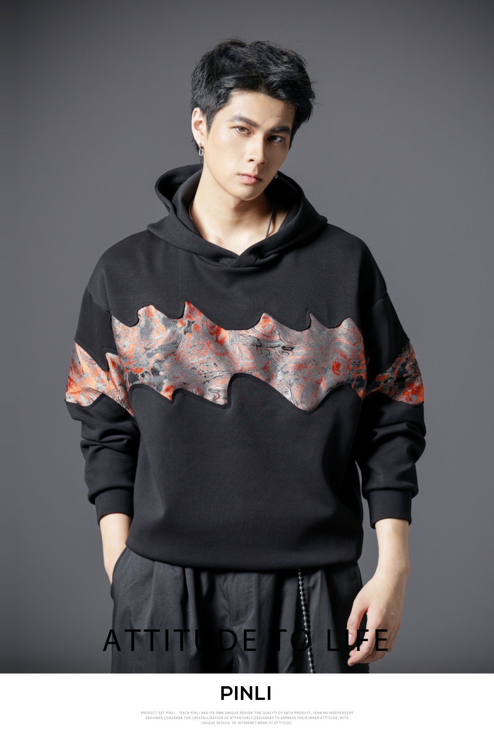 PINLI品立2025秋季新款男士连帽提花拼接落肩宽松套头卫衣上衣潮B253109099