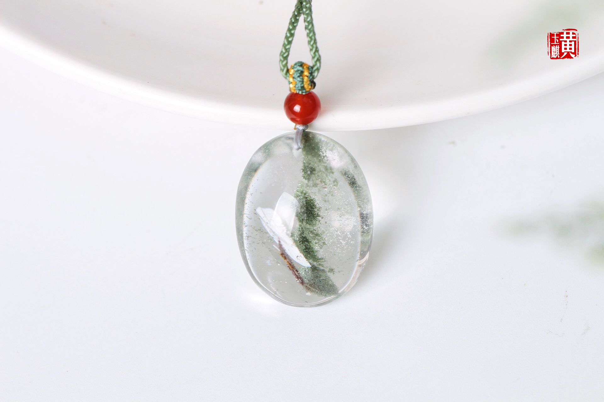 绿幽灵水晶吊坠,形饱满大气,晶体通透明亮,幽灵包体色泽浓绿,排列六层,寓意步步高升、财富如山。