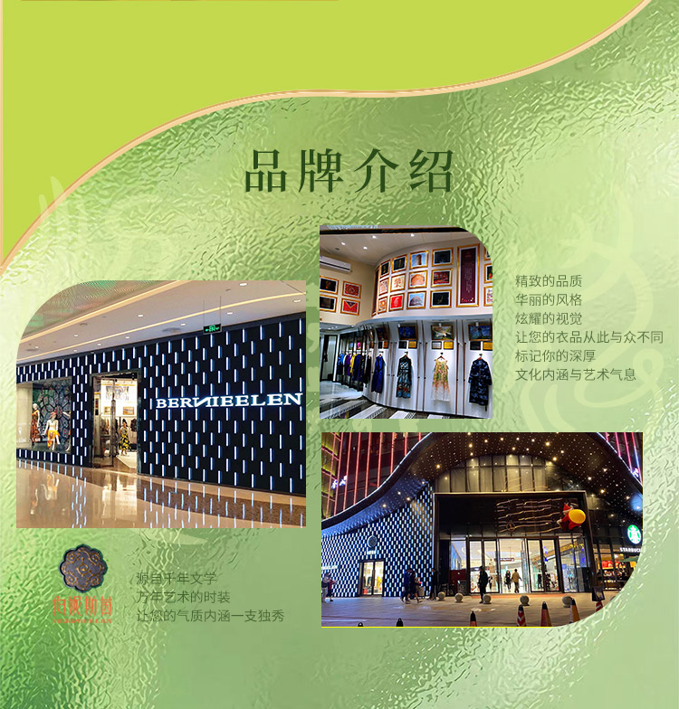 品牌风格:源自千年文学和万年艺术的时装,让你的气质内涵一枝独秀,精彩的品质,华丽的风格,炫耀的视觉,让你的衣品从此与众不同,标记你深厚的文化内涵与艺术气息。