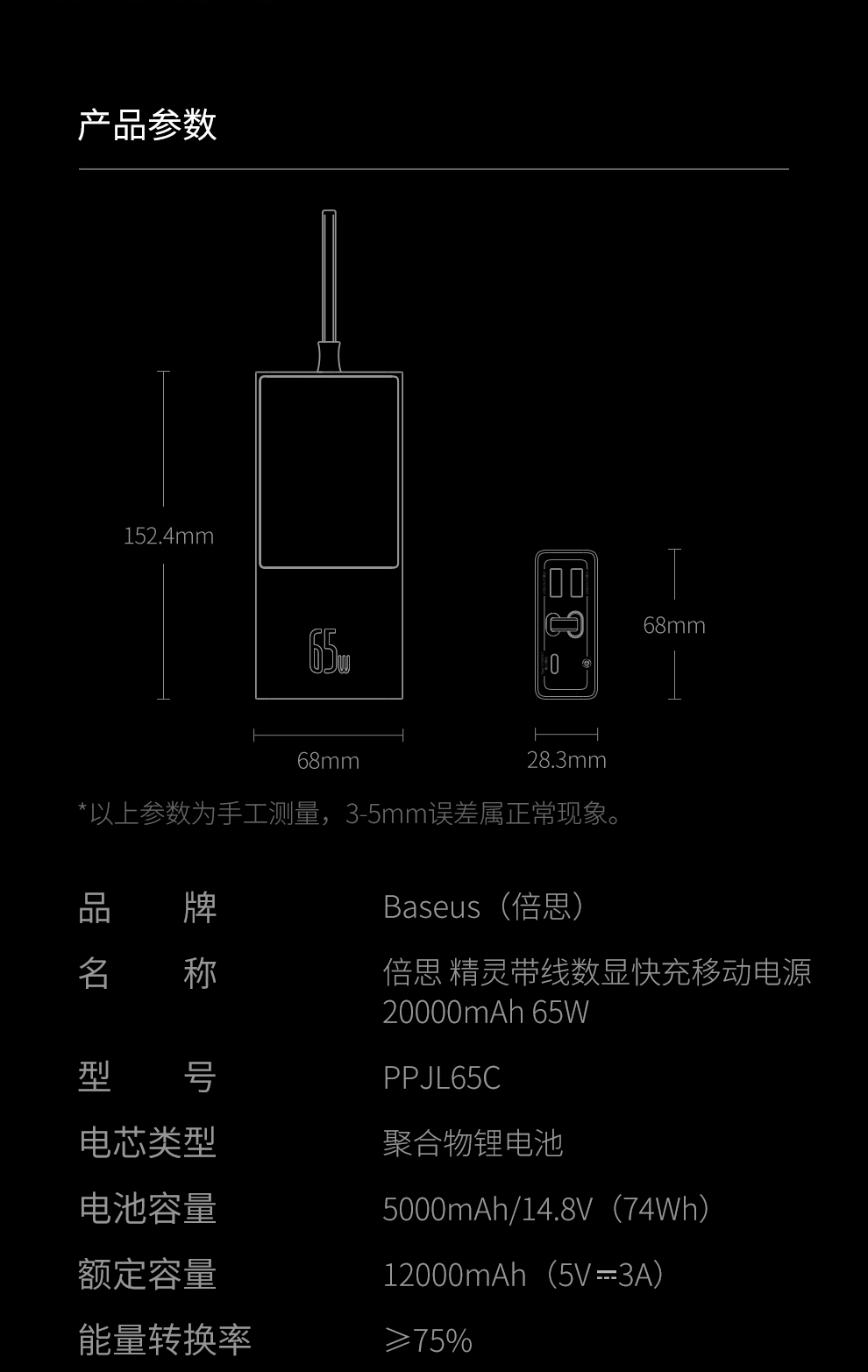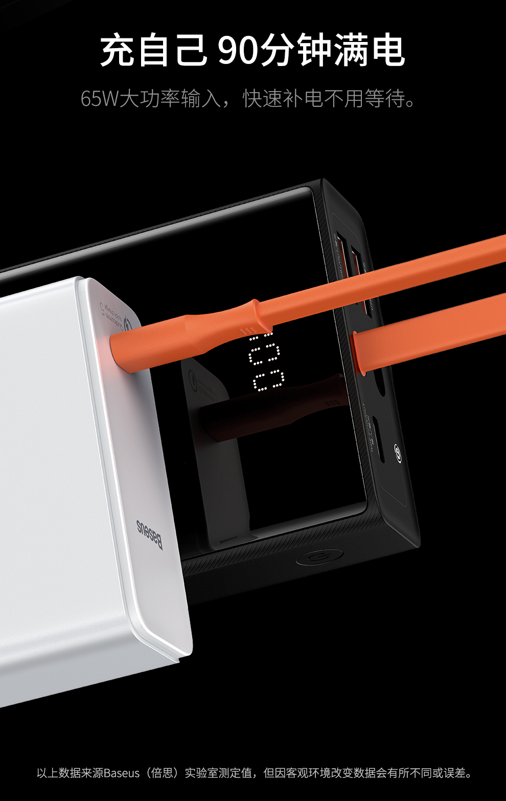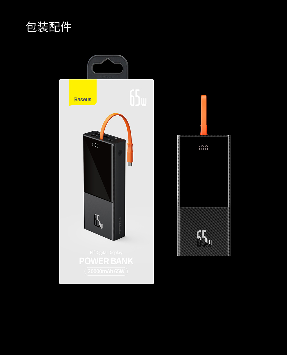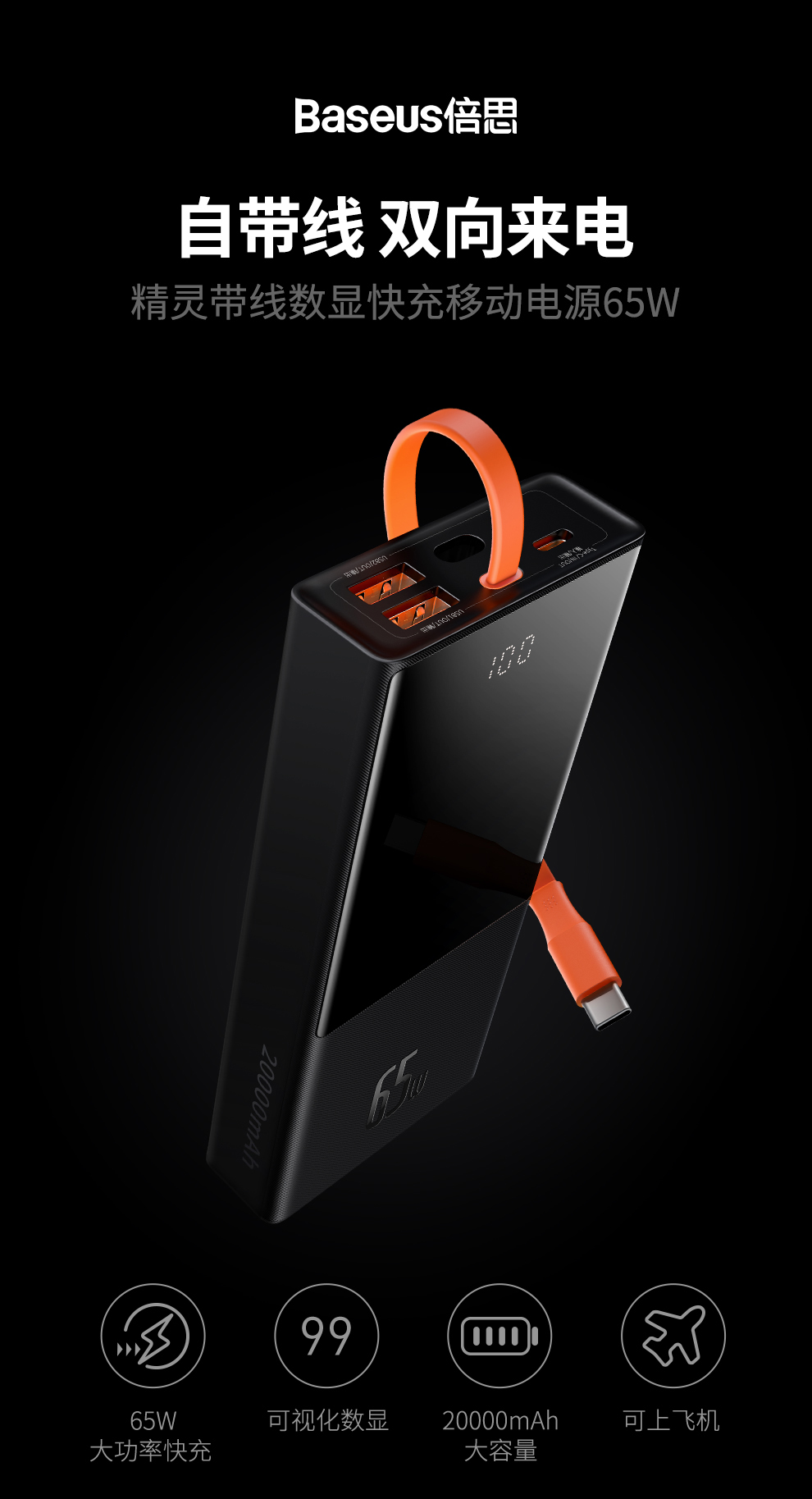 倍思 精灵带线数显快充移动电源 20000mAh 65W