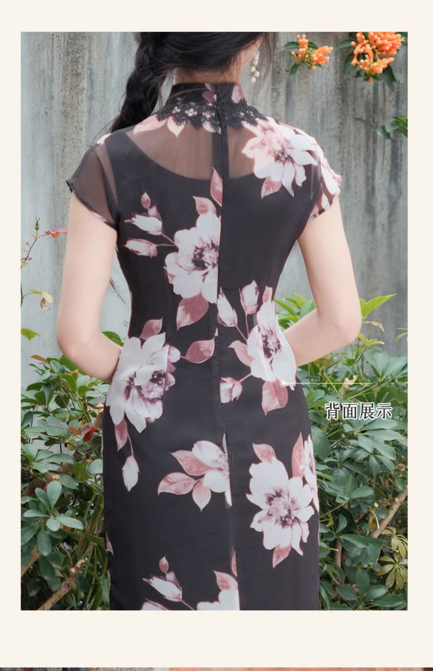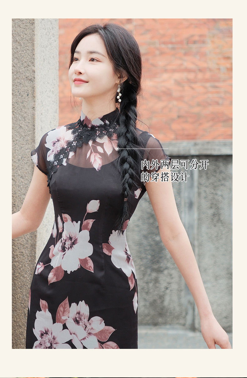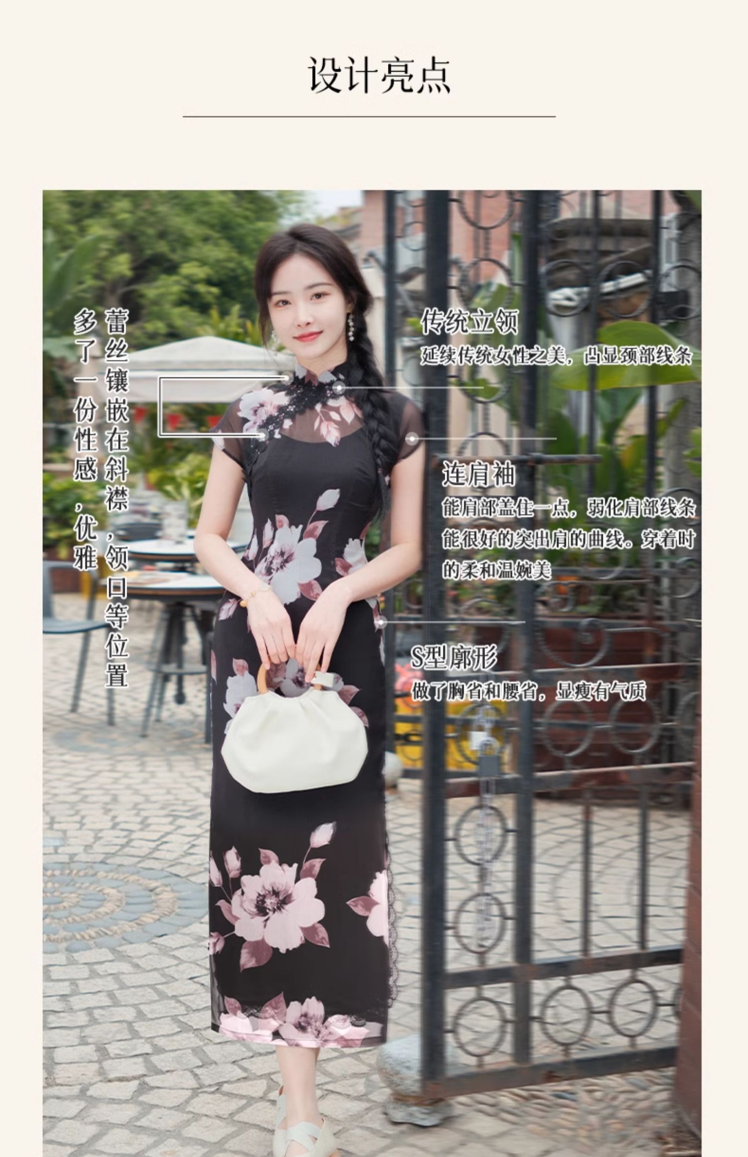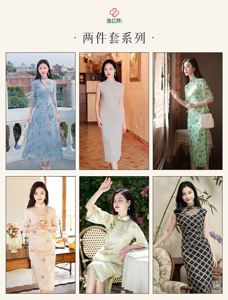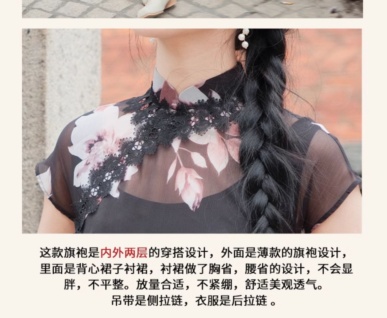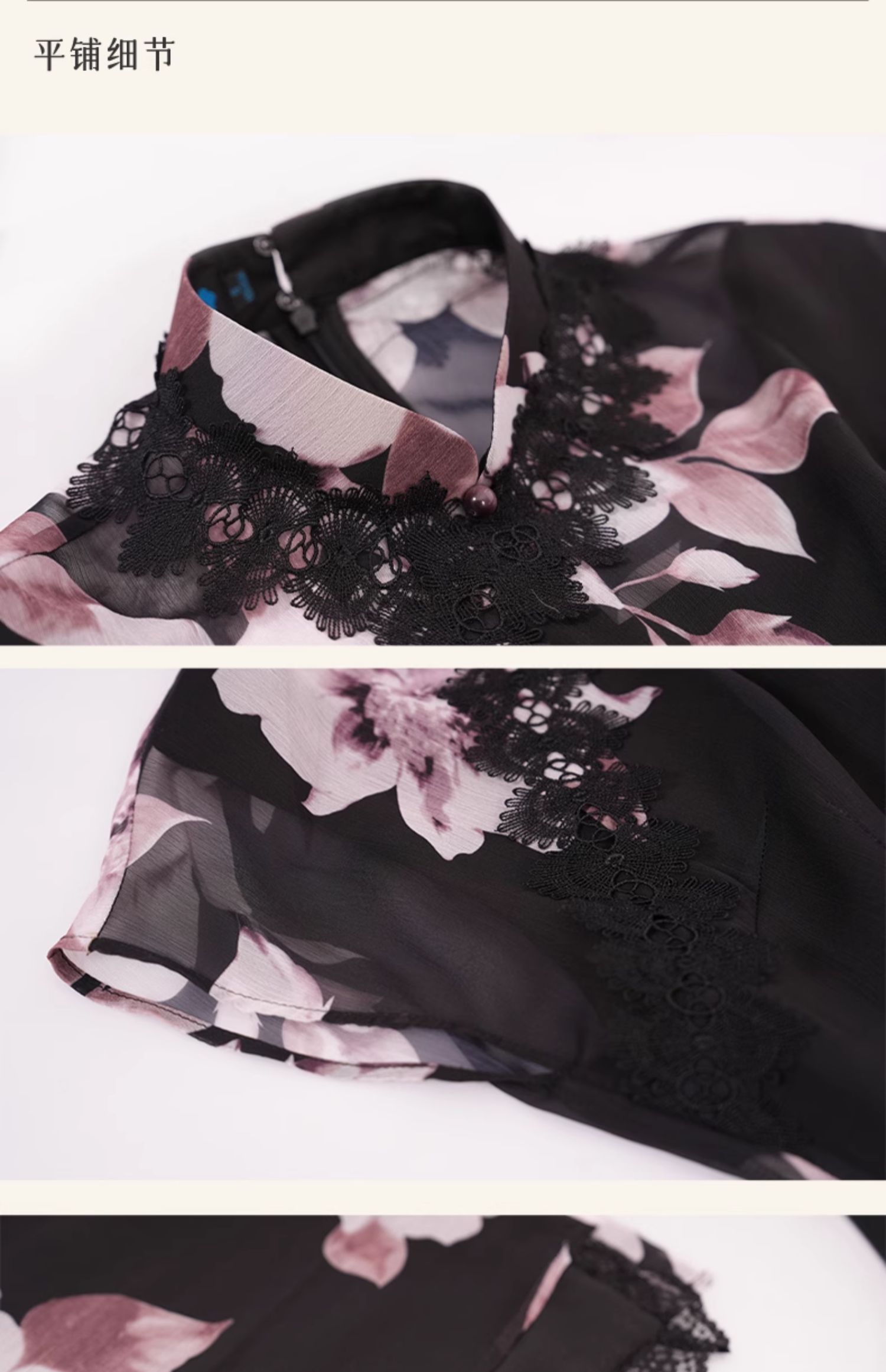 上海逸红颜楚黛2025年夏季新款雪纺印花蕾丝镶嵌中式两件套旗袍女