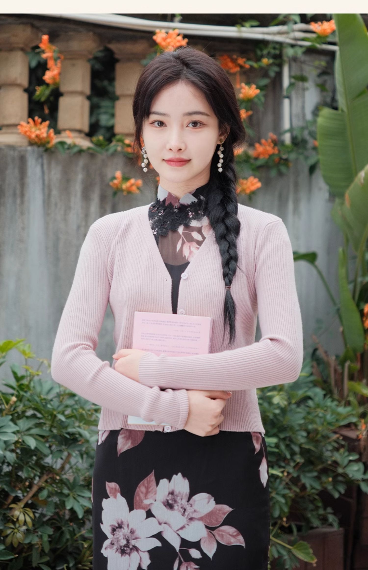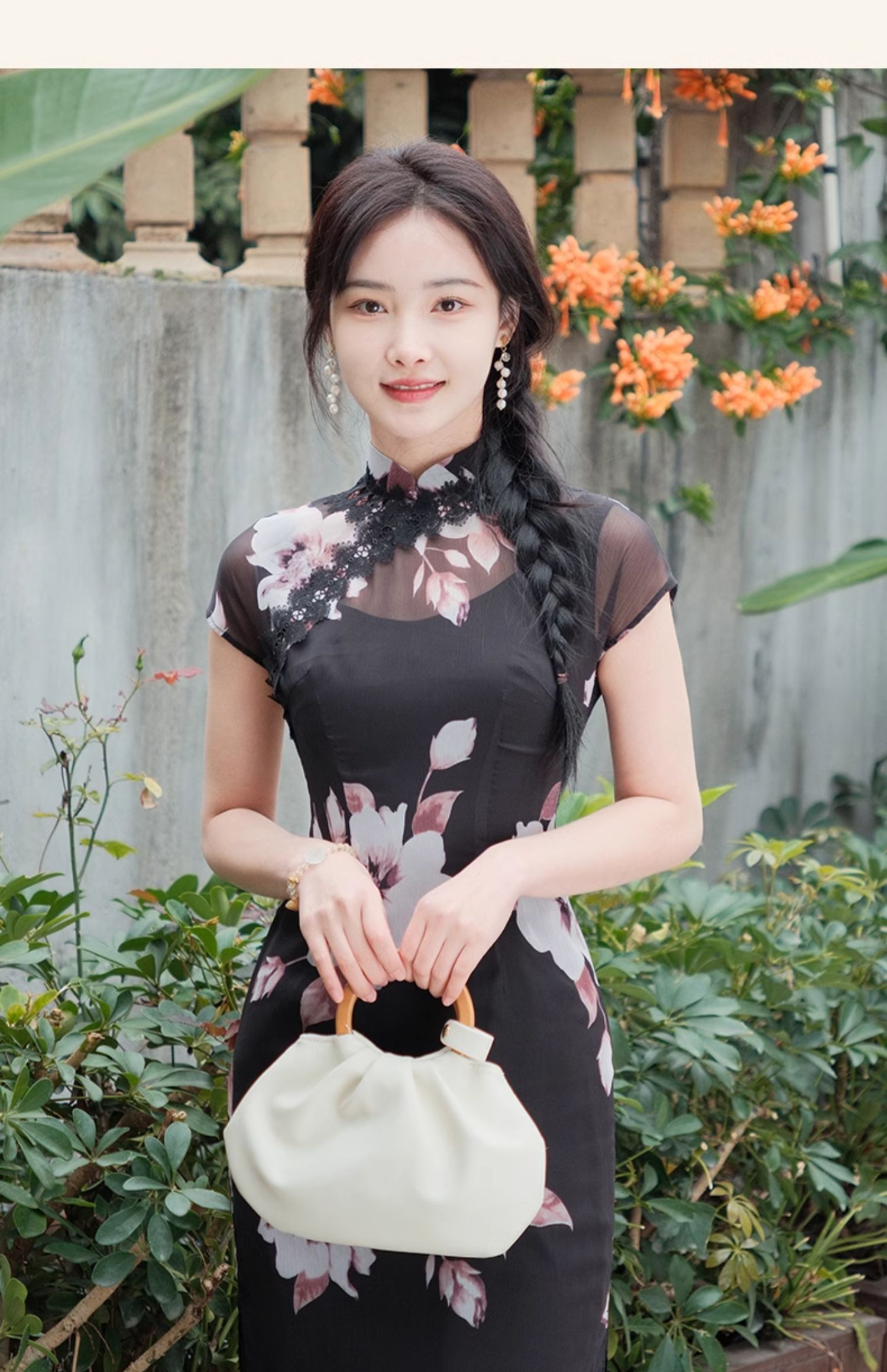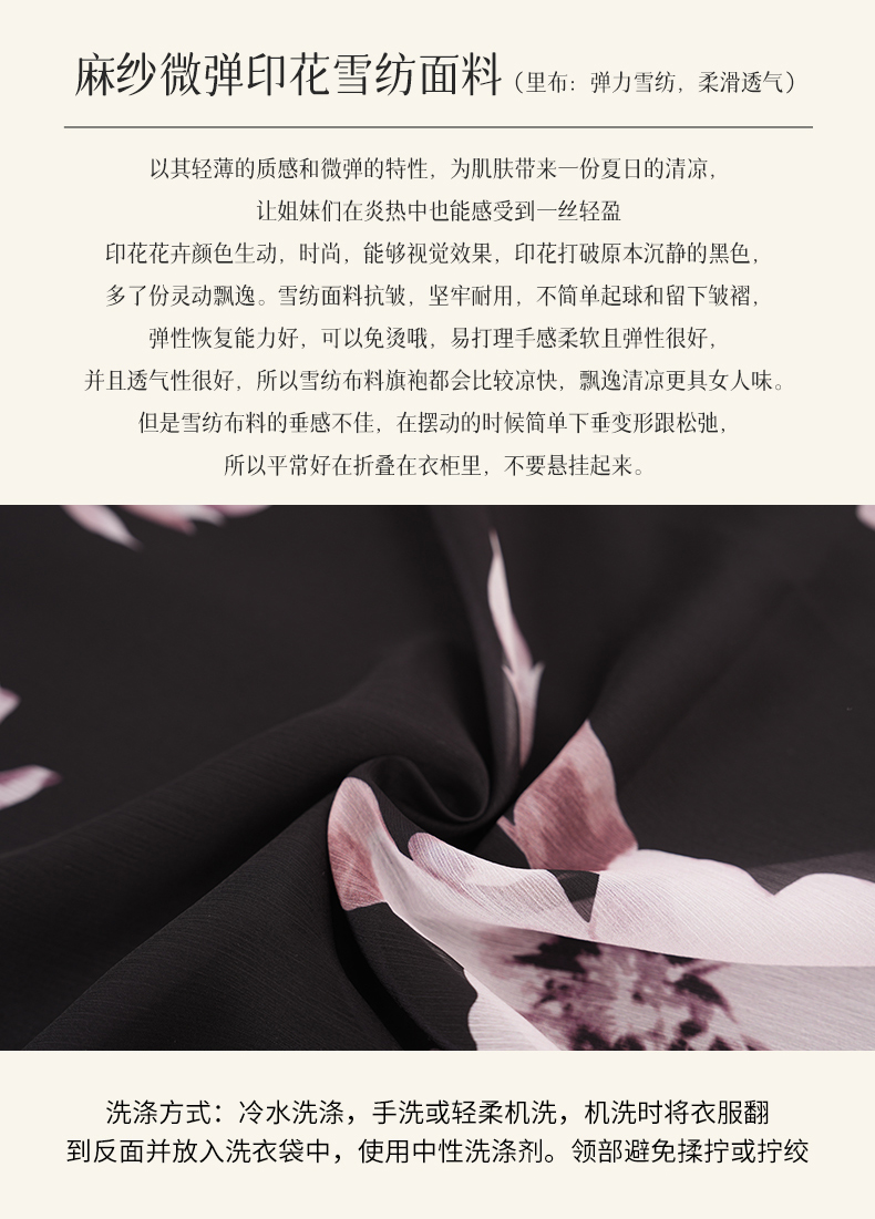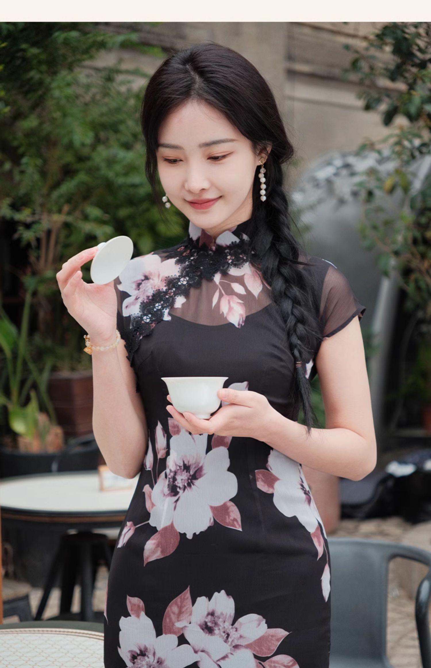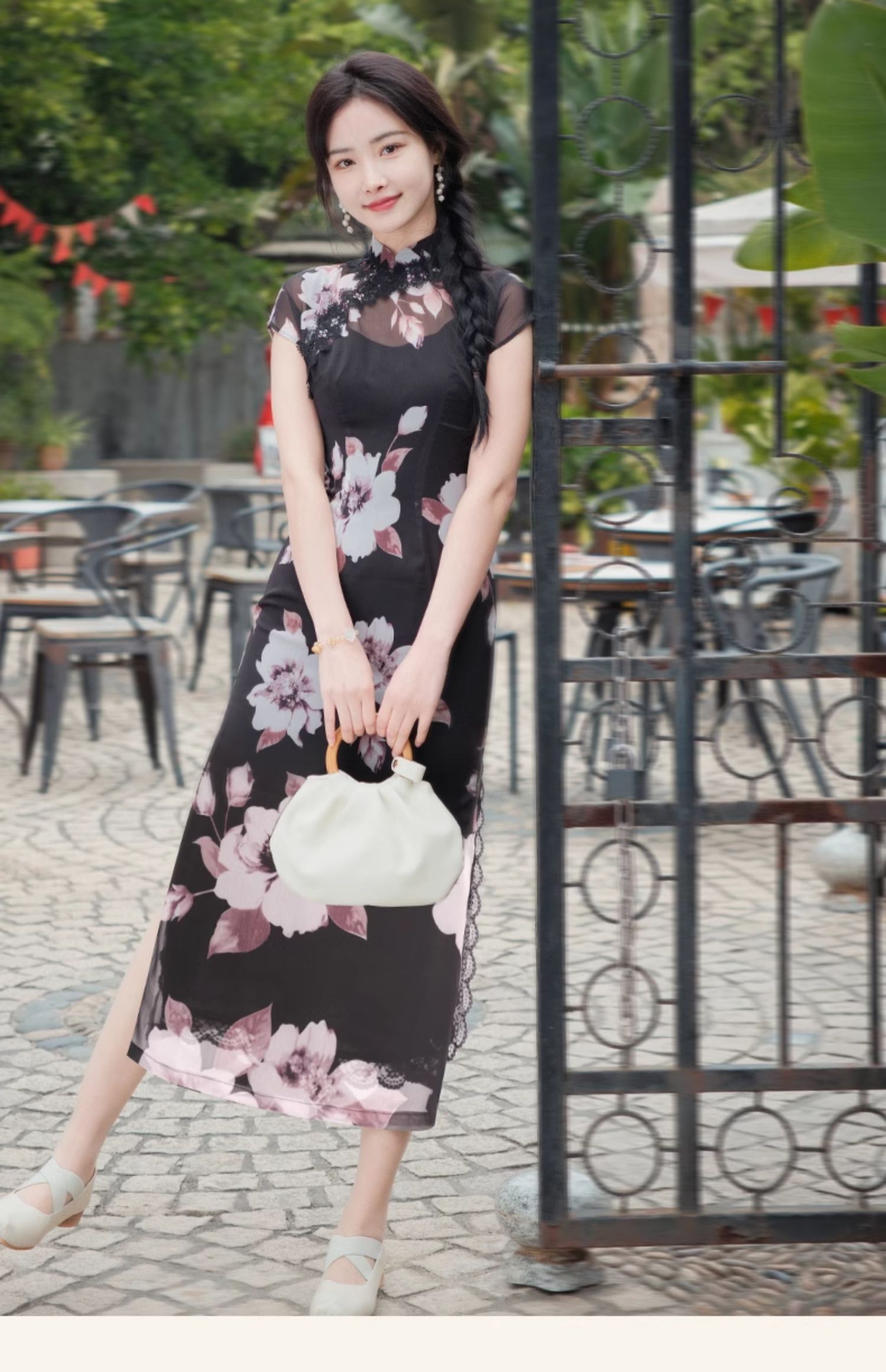 上海逸红颜楚黛2025年夏季新款雪纺印花蕾丝镶嵌中式两件套旗袍女
