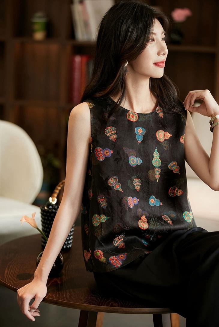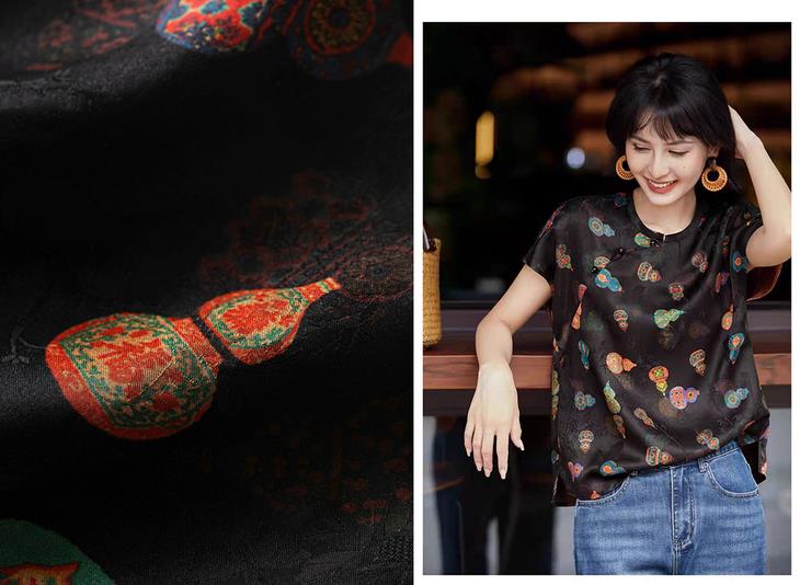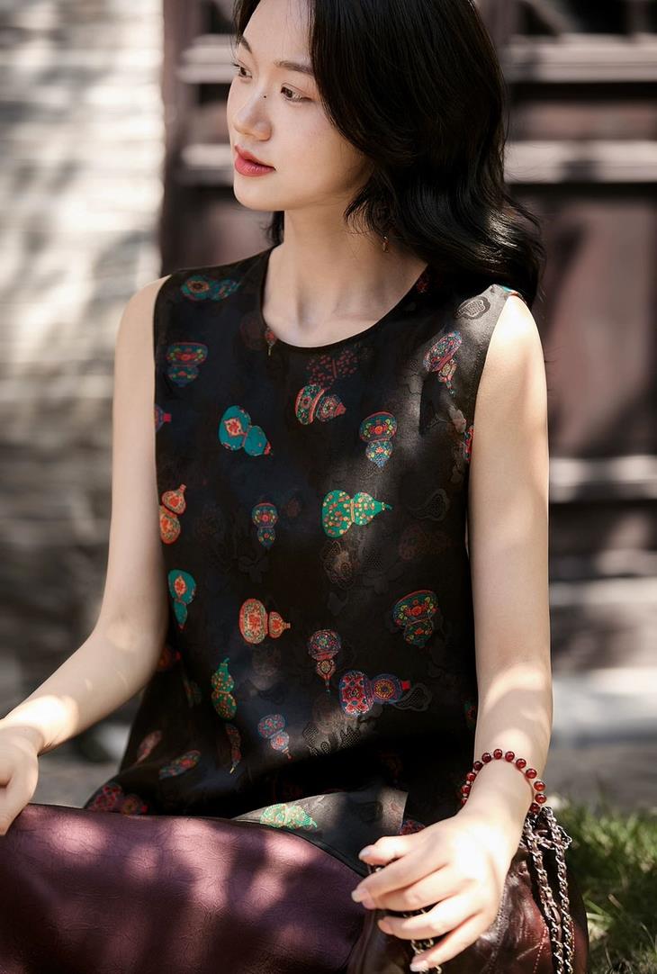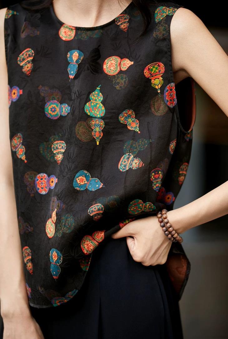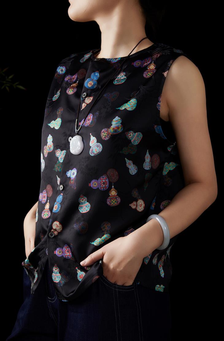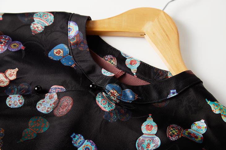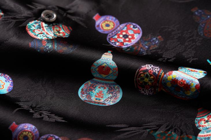 而且葫芦印花,在墨色的云纱提花底布的基础上做叠加印,层次立体,暗纹提花在光线流转与复古调性中不经意浮现,两者相得益彰,具有底蕴深厚的精致魅力。