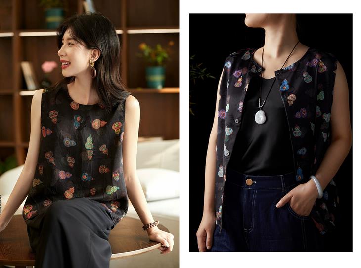 这两件小衫可不是一般的新中式,面料用的可是非遗花萝红云纱,自带岁月沉淀的温润感,上身犹如穿越回江南的烟雨里。
