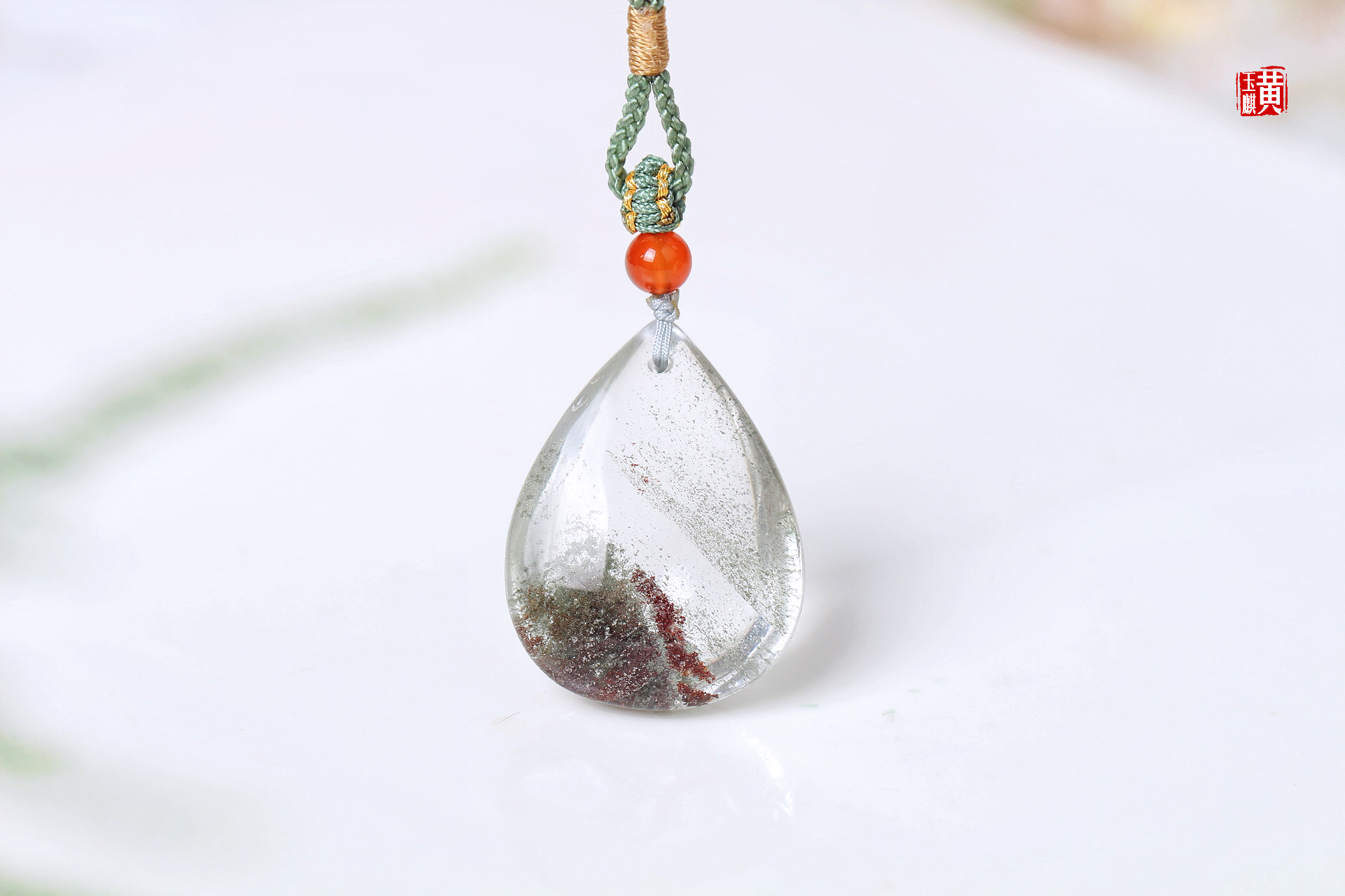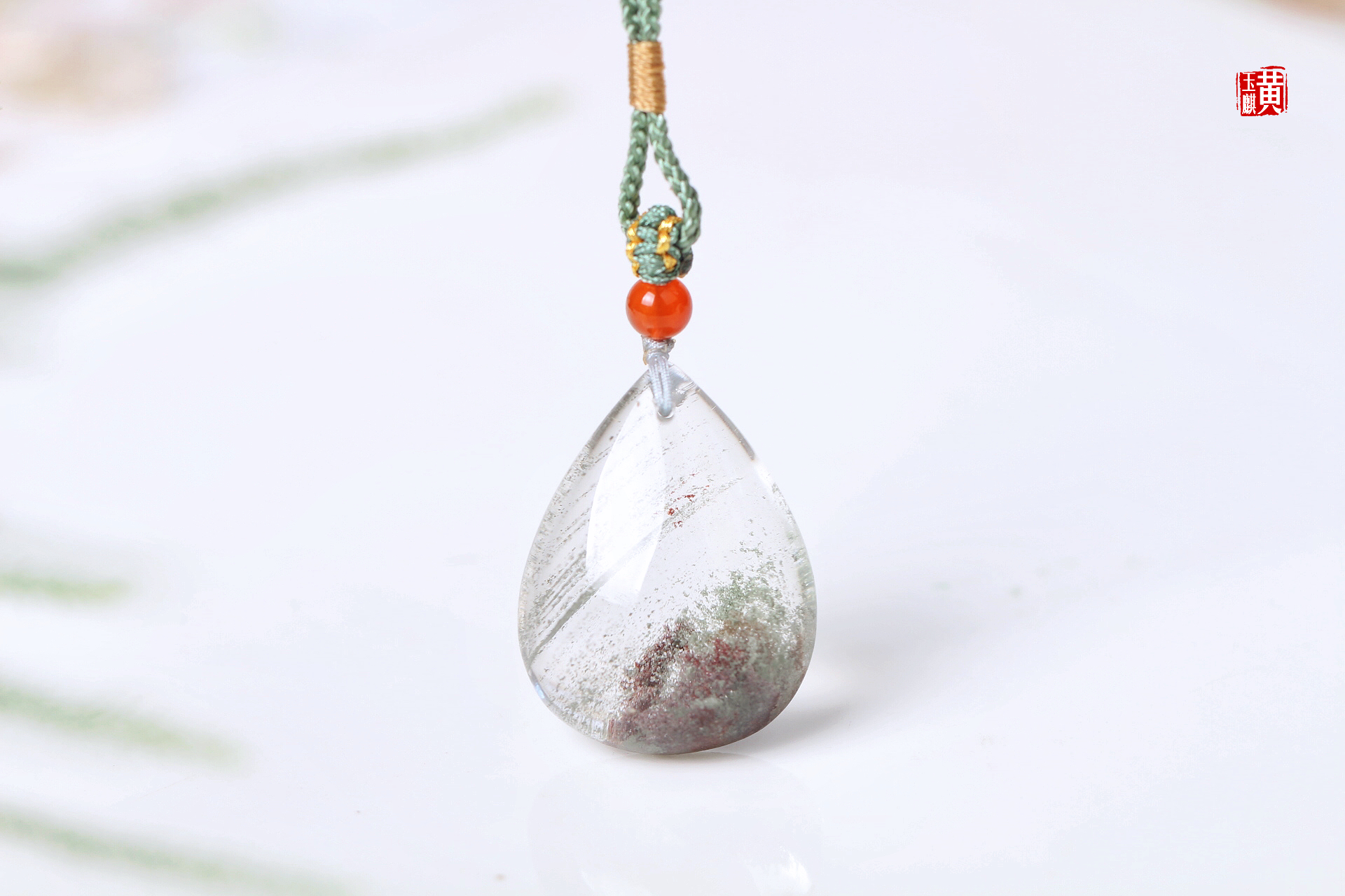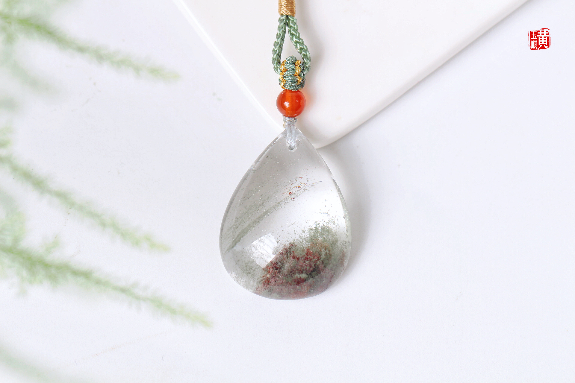 绿幽灵水晶吊坠,晶体通透明亮,红幽和绿幽形成了金字塔财山,吸引周边的绿幽灵,寓意财富积累如山、事业稳固上升。