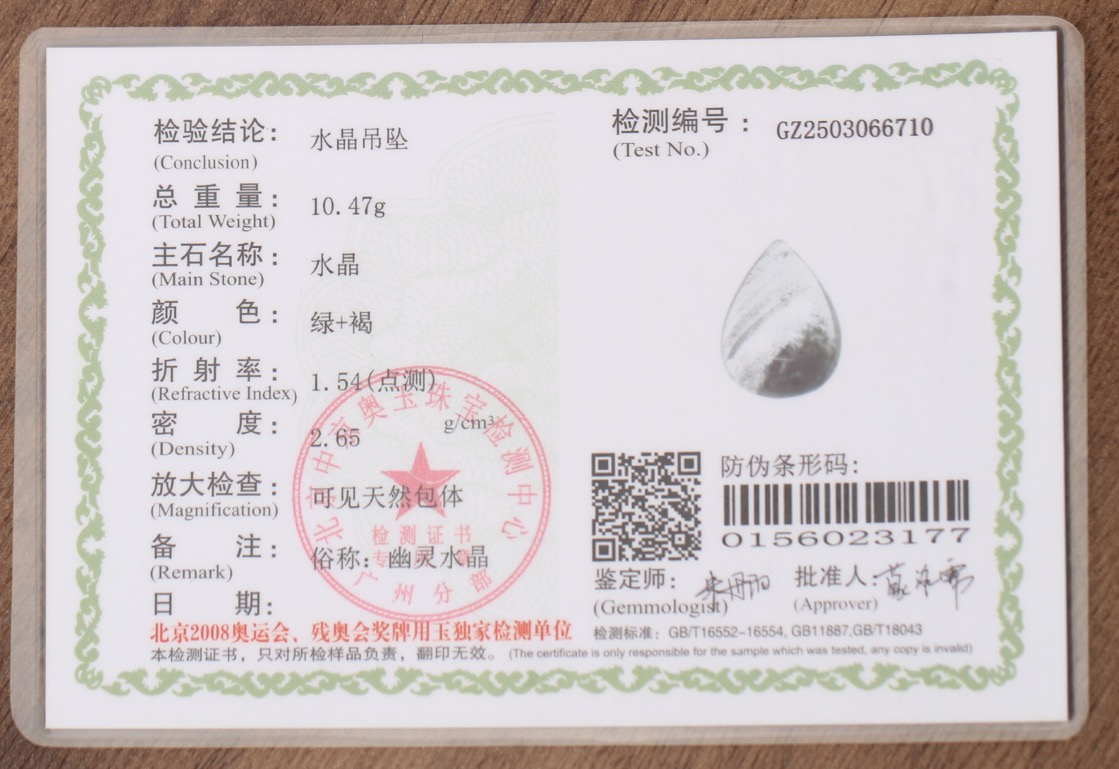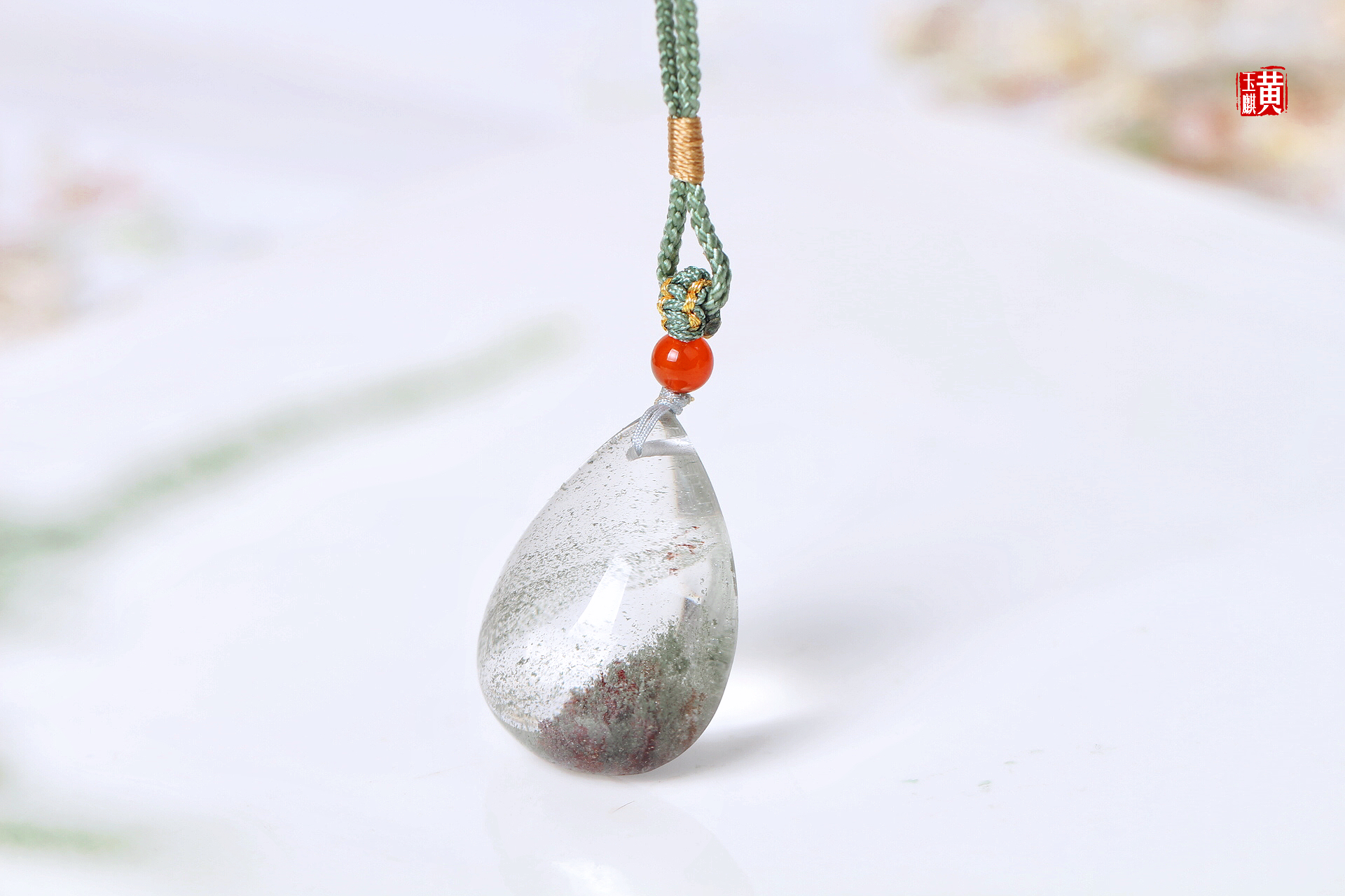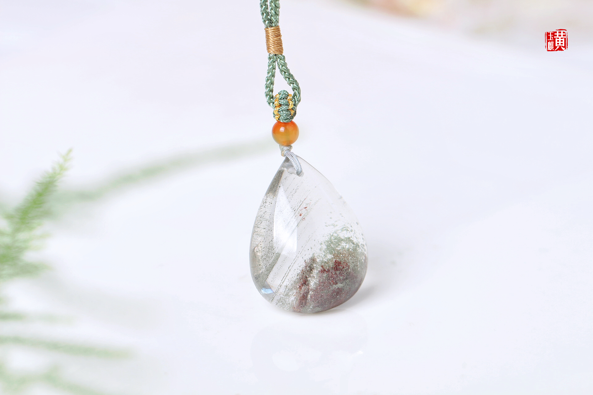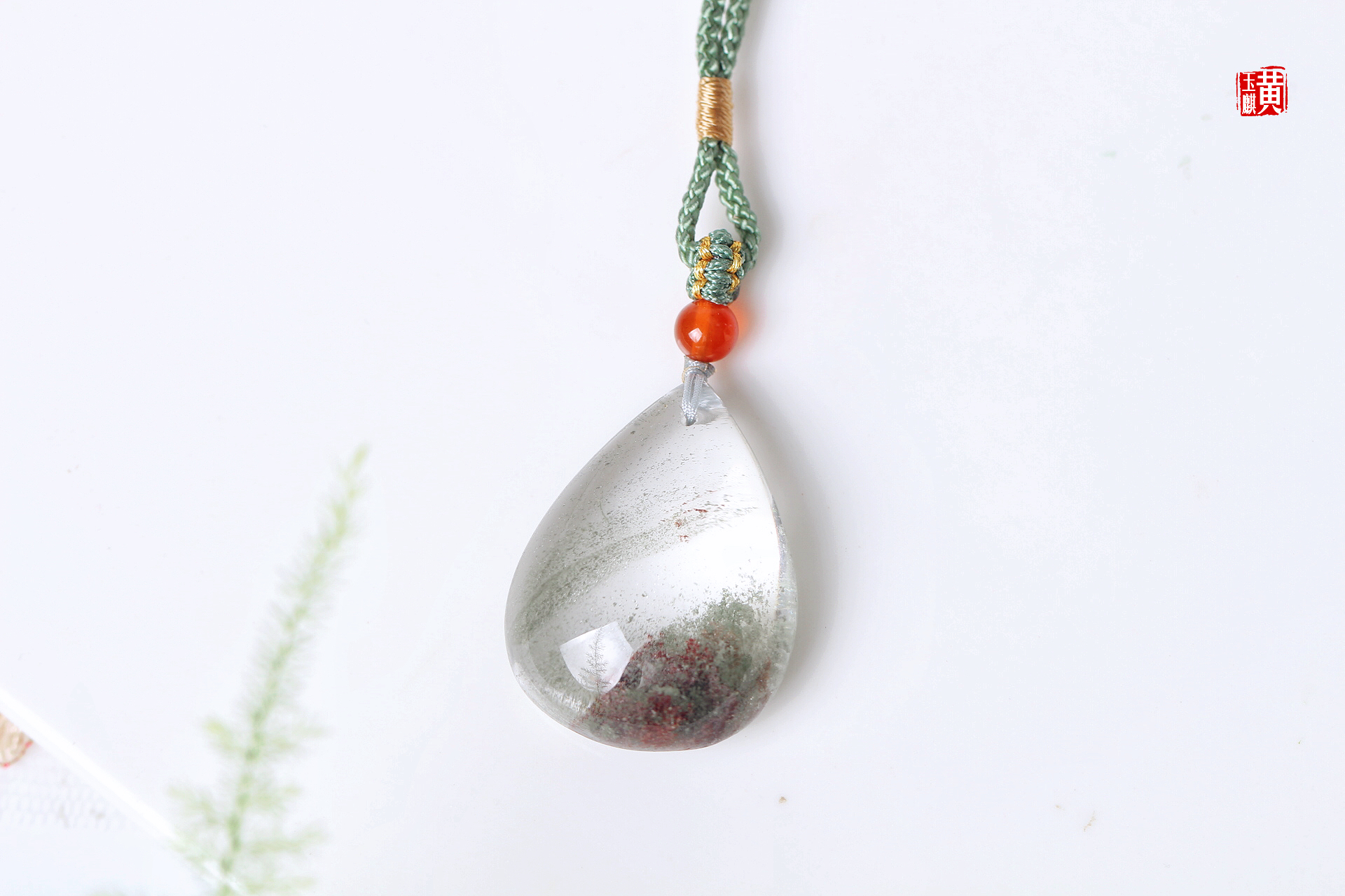 绿幽灵水晶吊坠,晶体通透明亮,红幽和绿幽形成了金字塔财山,吸引周边的绿幽灵,寓意财富积累如山、事业稳固上升。