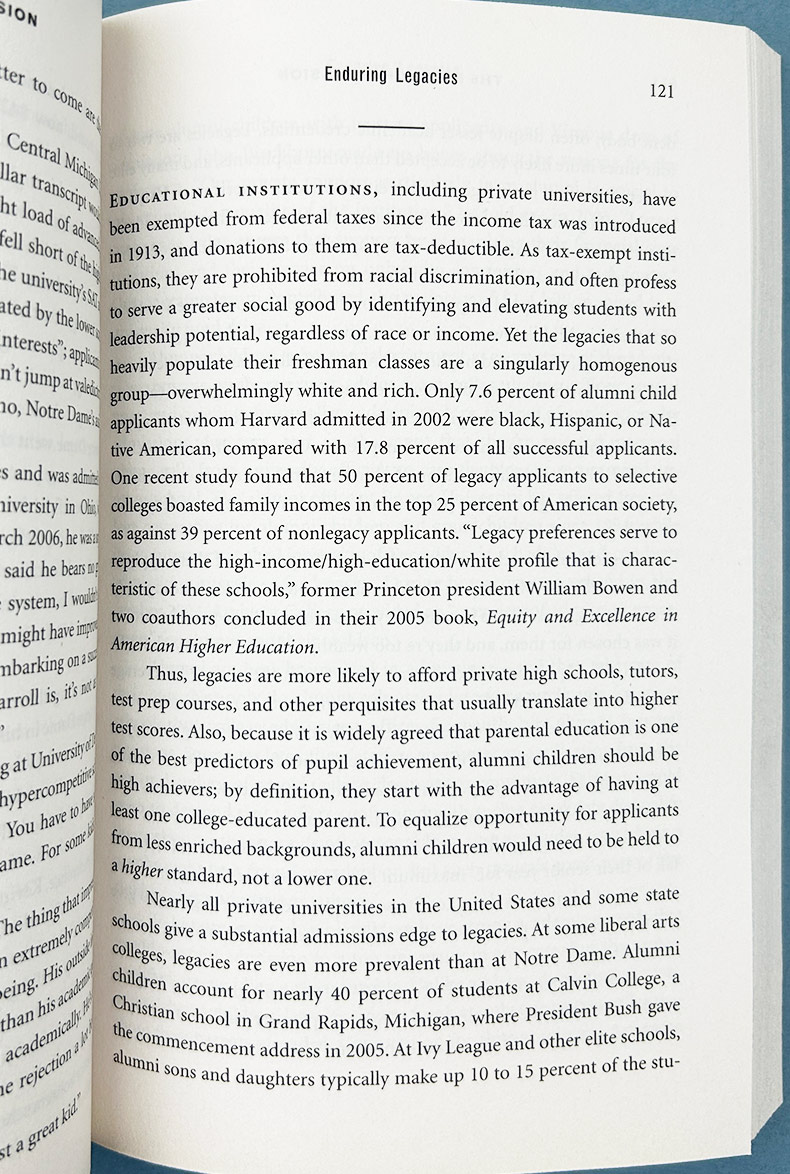 Every spring thousands of middle-class and lower-income high-school seniors learn that they have been rejected by America’s most exclusive colleges. What they may never learn is how many candidates like themselves have been passed over in favor of wealthy white students with lesser credentials—children of alumni, big donors, or celebrities. America, the so-called land of opportunity, is rapidly becoming an aristocracy in which America’s richest families receive special access to elite higher education—enabling them to give their children even more of a head start.