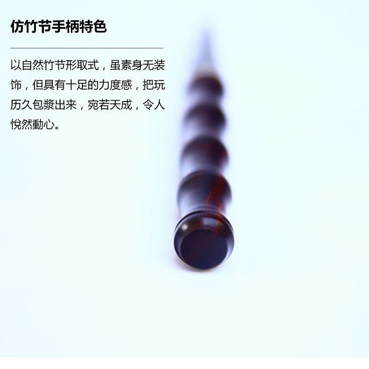【工艺】采用高端印度小叶紫檀与大马士革制作,线条流畅素雅、精工细作,3000目打磨,几十道工序严格制作,料子细腻油润。以自然竹节形取式,虽素身无装饰,但具有十足的力度感,把玩历久包漿出来,宛若天成,令人悅然動心。