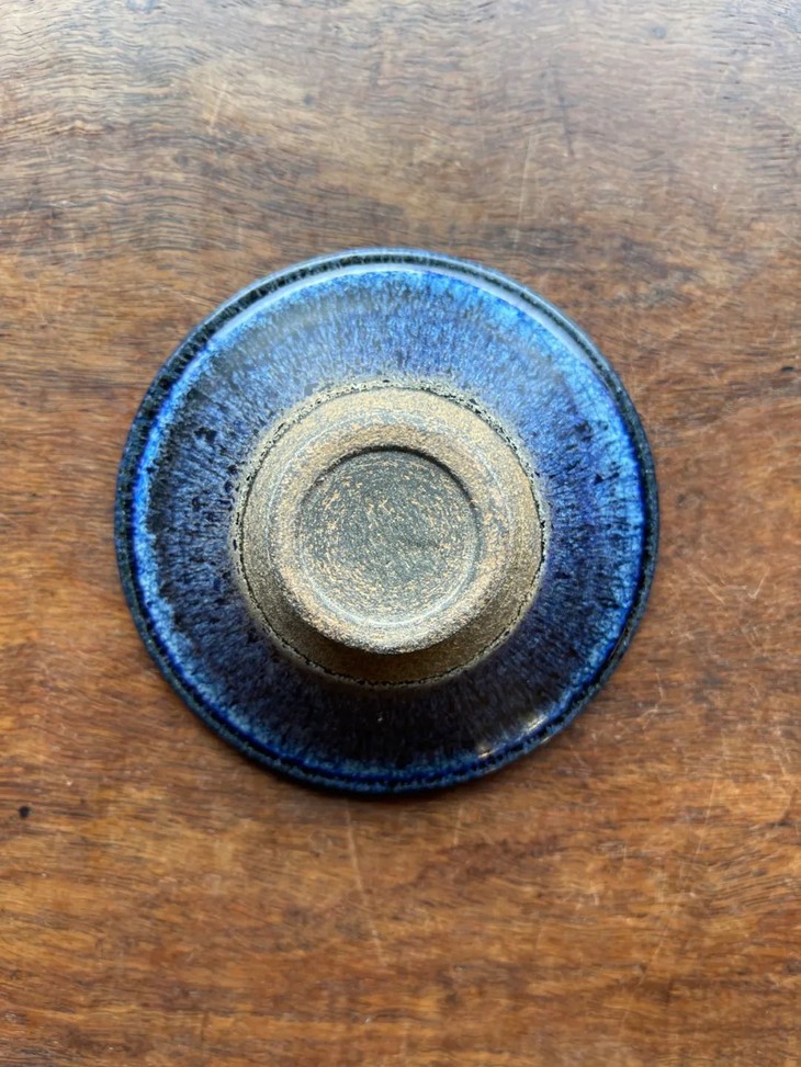 这是一件建窑曜变蓝兔毫斑天目斗笠形茶盏与磁州窑白釉刻黑花盏托套组,此茶盏造型依循建盏斗笠碗形式,撇口斗笠形小碗典雅贵气,碗内艳丽蓝色曜变流淌兔毫窑斑,外壁黑底蓝兔毫斑,下方与浅圈足底部露典型建窑坚硬釉黑胎,曜变釉蓝兔毫斑黑地蓝斑,是烧成温度高而且成功率很低的所谓曜变天目釉。