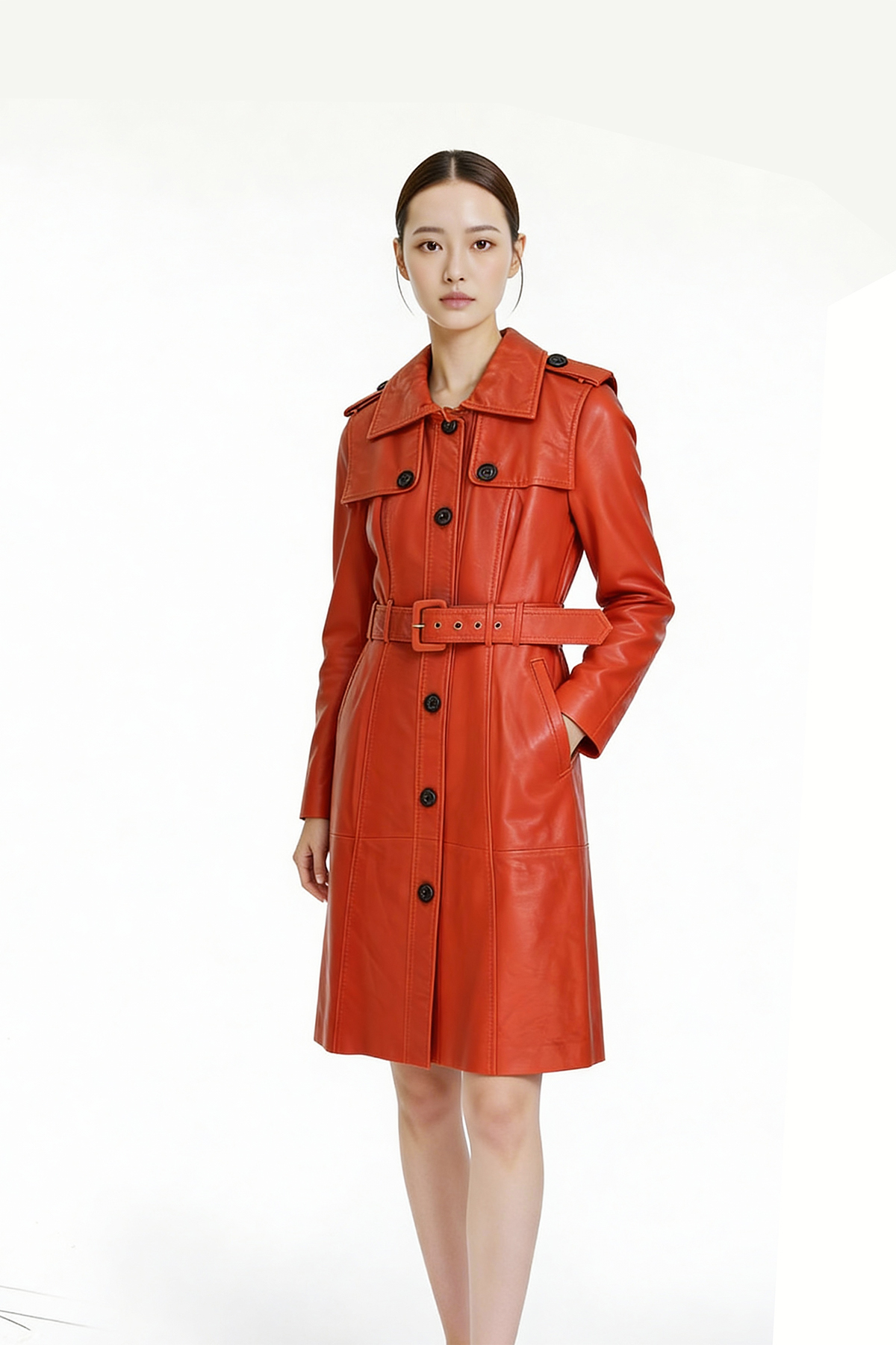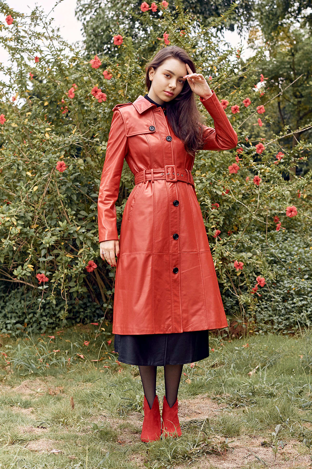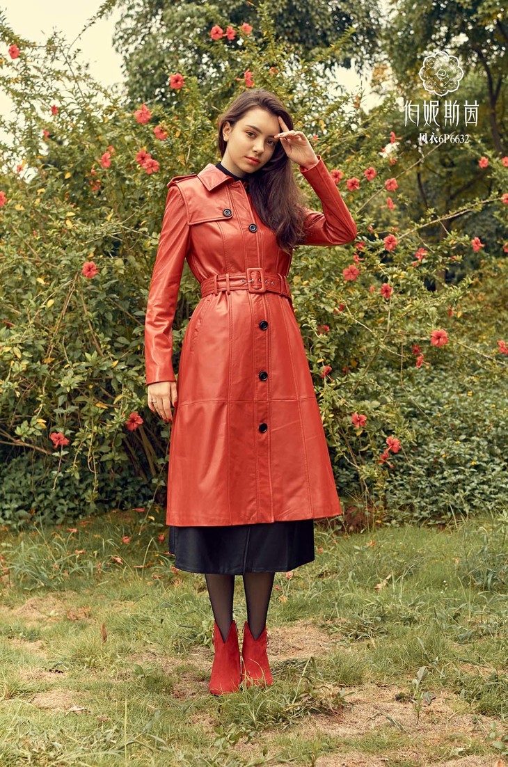 【伯妮斯茵】显瘦气质红色长款修身皮衣--《花园中的母子》6P6632