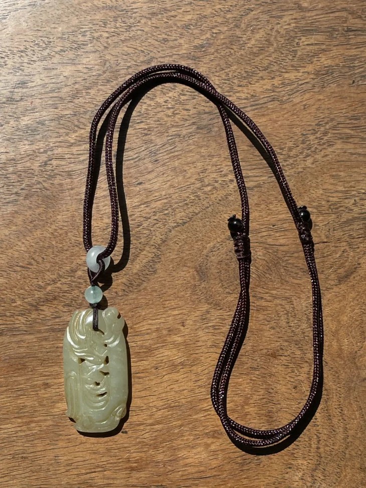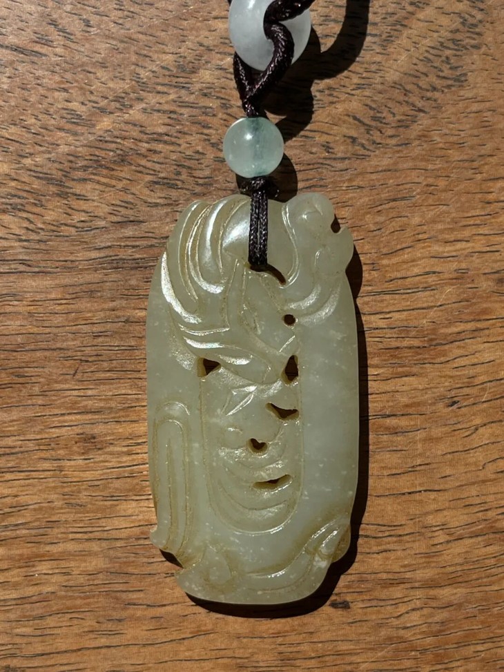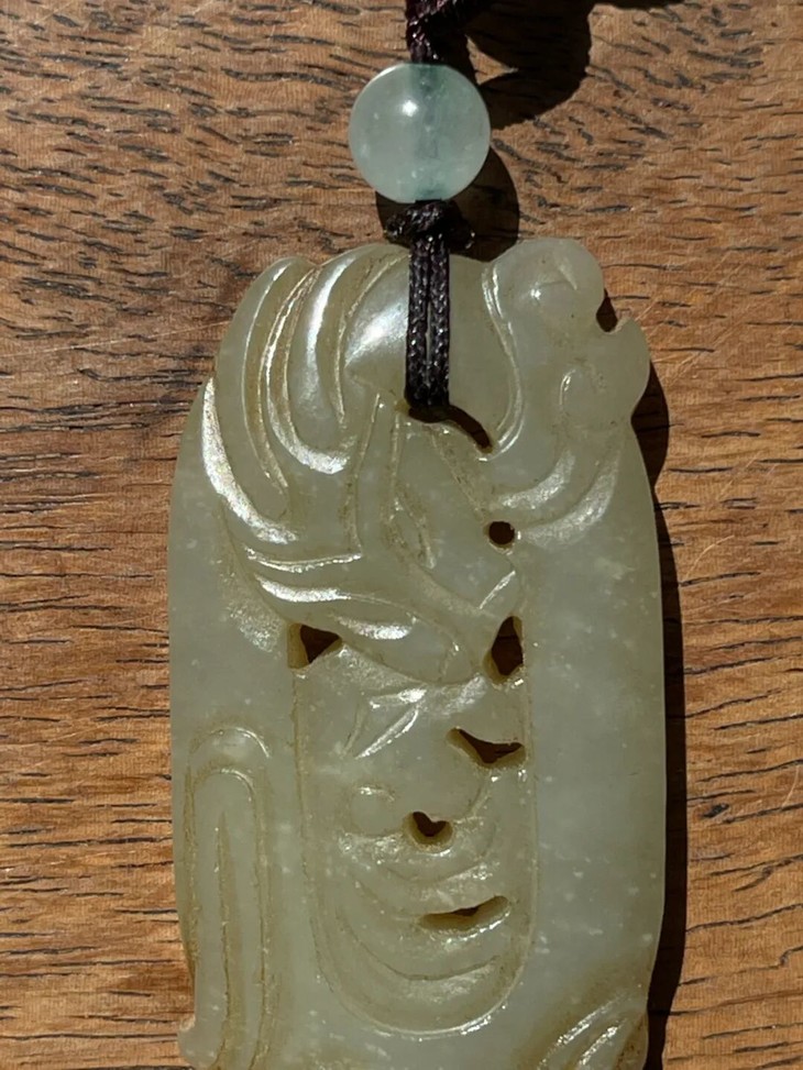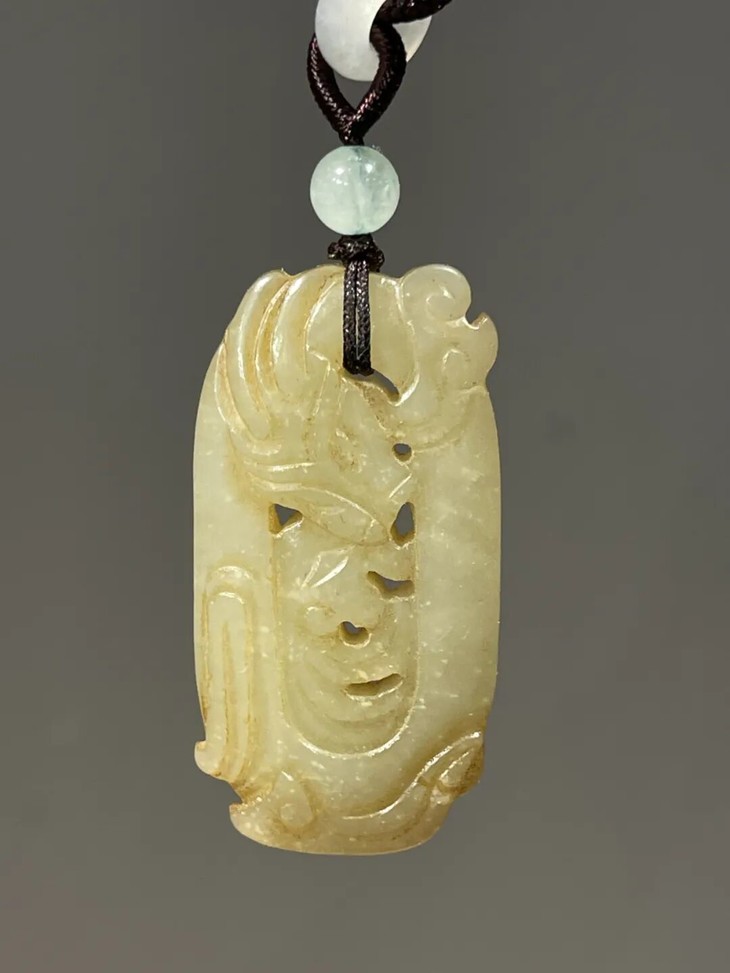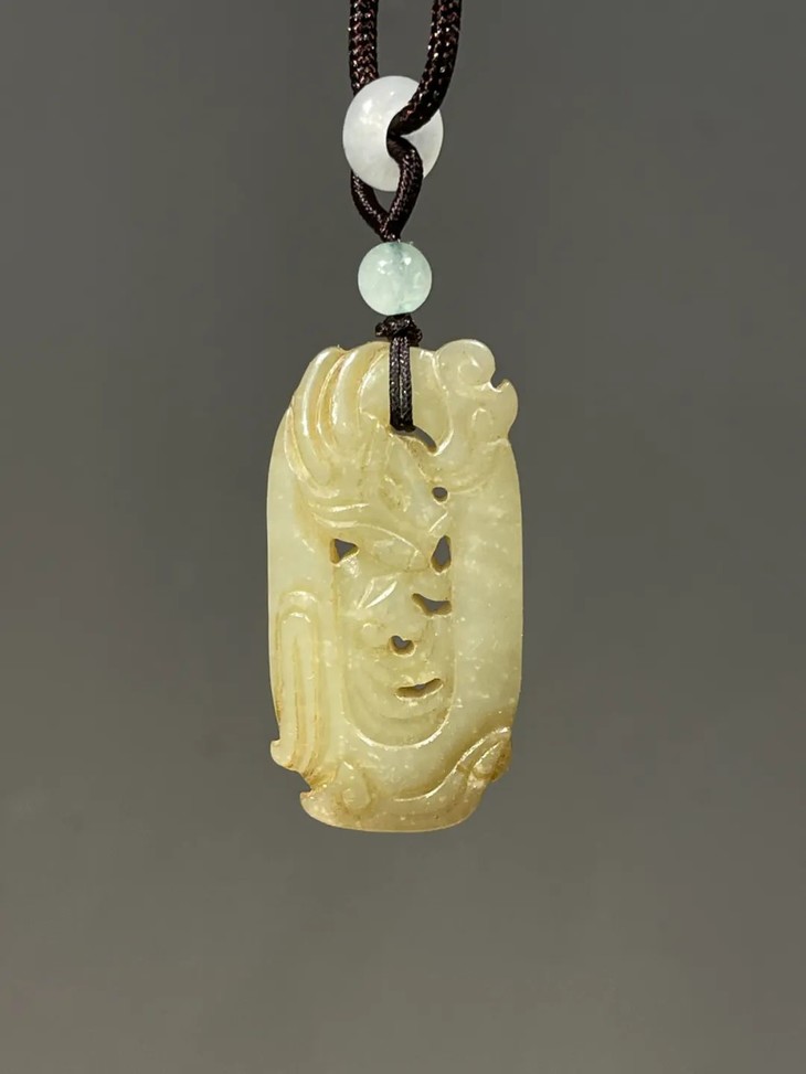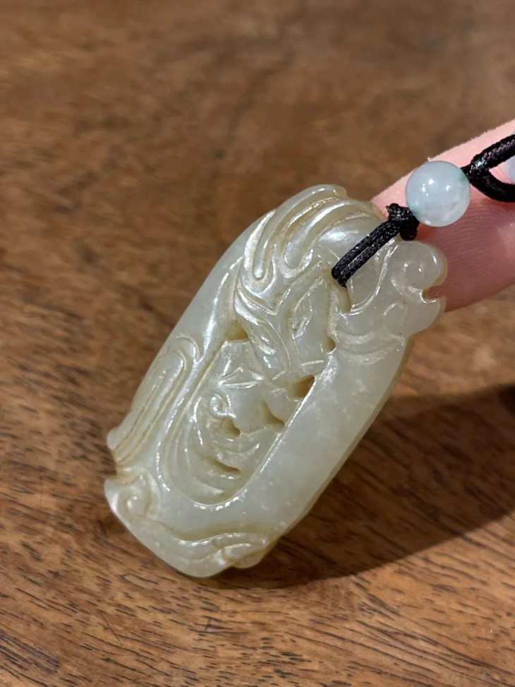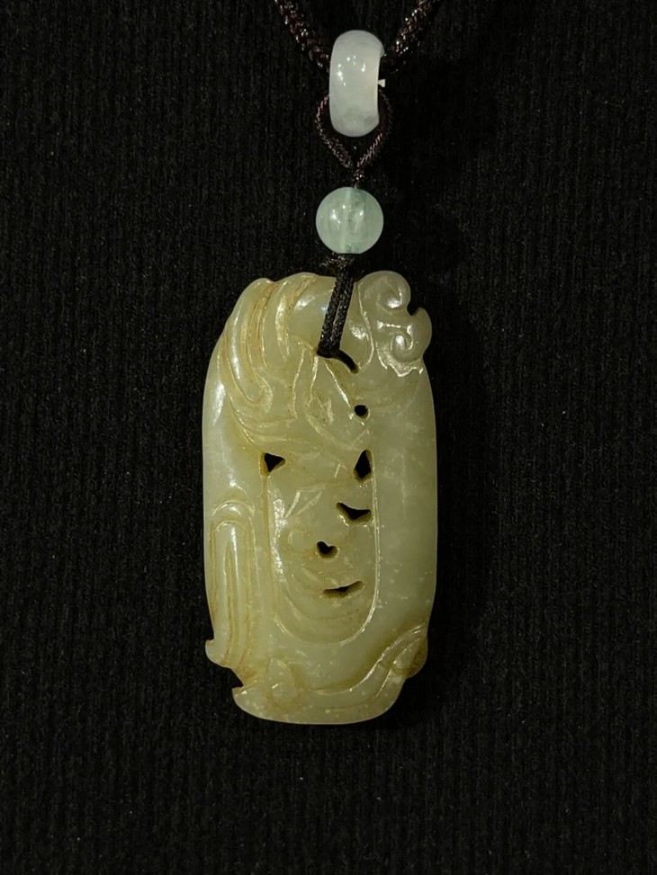 这是一件以和田白玉镂空透雕而成的云龙纹椭圆珮,和田白玉色泽淡黄柔美半通透、质地坚硬油润,双面镂空透雕出穿梭于云中的飞龙,双面构图豪迈略抽象,整体设计精巧,镂空透雕不刻意藏锋。