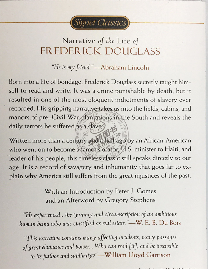 Narrative of the Life of Frederick Douglass《一个美国黑奴的自传》是费雷德里克·道格拉斯的人生自述。他出生在一个充满束缚的环境中,因为兴趣,秘密地自学阅读和写作。在当时,这是一种可判处死刑的罪行,但却导致了有力的对奴隶制的控诉。他引人入胜的叙述把我们带进了南方内战前种植园的田野、小屋和庄园,揭示了他作为奴隶所遭受的日常恐惧。