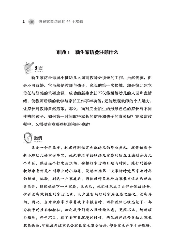 本书聚焦了幼儿教师在家长工作中经常遇到的44个问题。针对每一个问题设计了“引言”“案例”“分析”“破解策略”“举一反三”五个板块,阐述了每一个问题的有效解决方法。该书既有助于丰富幼儿教师的家长工作经验,又有助于拓展其开展家长工作的思路。