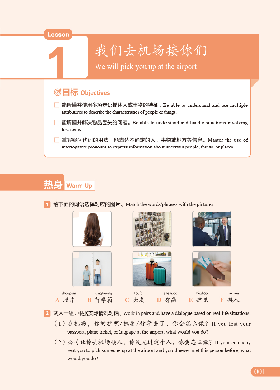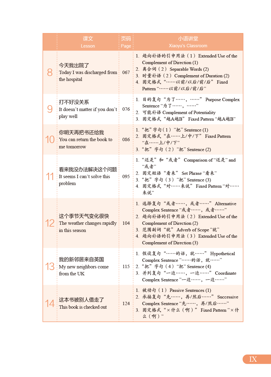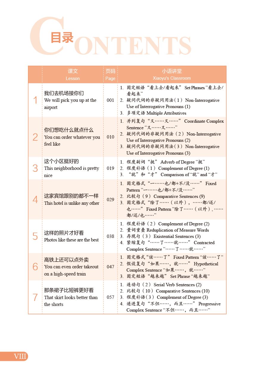 第1课 我们去机场接你们Lesson 1 We will pick you up at the airport第2课 你们想吃什么就点什么Lesson 2 You can order whatever you feel like第3课 这个小区挺好的Lesson 3 This neighborhood is pretty nice第4课 这家宾馆跟别的都不一样Lesson 4 This hotel is unlike any other第5课 这样的照片才好看Lesson 5 Photos like these are the best第6课 高铁上还可以点外卖Lesson 6 You can even order takeout on a high_speed train第7课 那条裙子比短裤更好看Lesson 7 That skirt looks better than the shorts第8课 今天我出院了Lesson 8 Today I was discharged from the hospital第9课 打不好没关系Lesson 9 It doesnrsquo;t matter if you donrsquo;t play well第10课 你明天再把书还给我Lesson 10 You can return the book to me tomorrow第11课 看来我没办法解决这个问题Lesson 11 It seems I canrsquo;t solve this problem第12课 这个季节天气变化很快Lesson 12 The weather changes rapidly in this season第13课 我的新邻居来自英国Lesson 13 My new neighbors come from the UK第14课 这本书被别人借走了Lesson 14 This book is checked out第15课 我是半个南京人Lesson 15 I am basically half a Nanjing local第16课 我听说有的熊猫出国了Lesson 16 I heard that some pandas have gone abroad第17课 我要多向认真的人学习Lesson 17 I will learn from people who are careful第18课 我学会了包饺子Lesson 18 Irsquo;ve learned how to make jiaozi