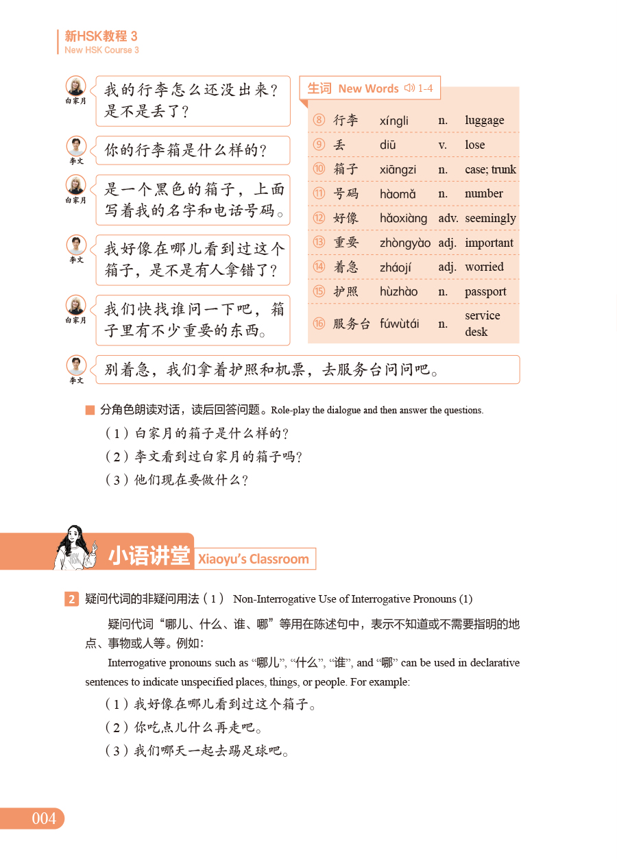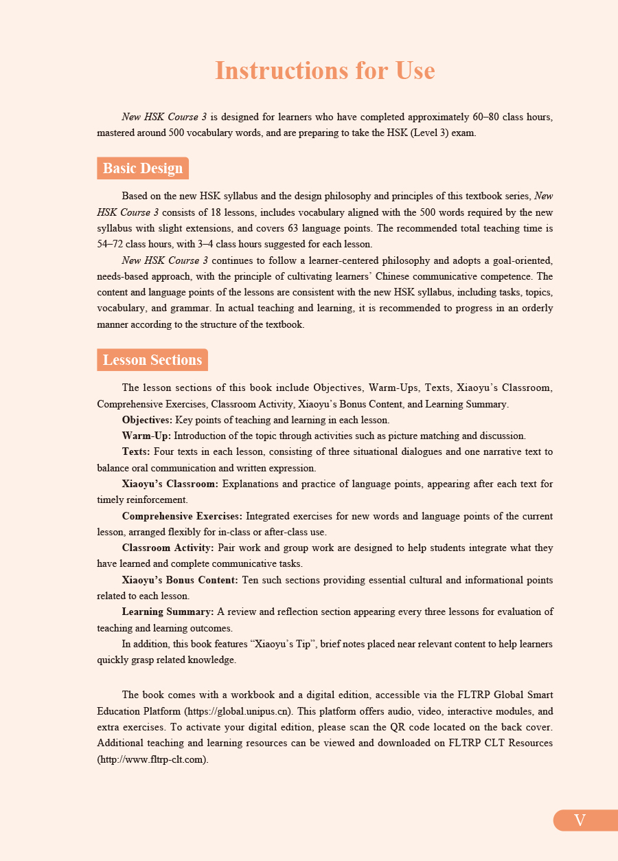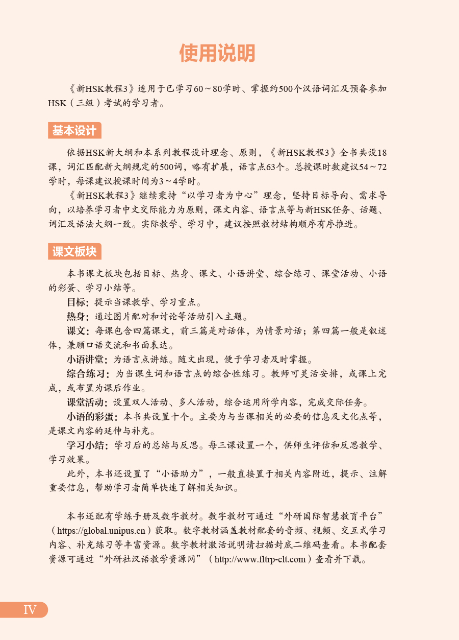 《新HSK教程3》是《新HSK教程》系列第3级的主干课本,适合已学习60~80学时、掌握约500个汉语词汇及预备参加HSK(三级)考试的学习者使用。全书共设18课,词汇匹配新大纲规定的500词,略有扩展,语言点63个。课文内容以轻情景剧方式呈现,故事情节有序嵌接,人物设定及故事发展既相互关联,又相对独立。课文内容、词汇、语言点与新HSK话题、任务、词汇及语法大纲一致。《新HSK教程》系列作为HSK3.0考试的配套教程体系,坚持以学习者为中心,以HSK考试和中文学习双轮驱动整体布局,力求实现考、教、学、用互促目标。该系列教程全面覆盖HSK考试三等九级,是一套纸数融合的新形态教材。New HSK Course 3 is the primary textbook for Level 3 of New HSK Course series, designed for learners who have completed approximately 60ndash;80 class hours, mastered around 500 vocabulary words, and are preparing to take the HSK (Level 3) exam. The book consists of 18 lessons, with vocabulary aligned with the 500 words required by the HSK 3.0 syllabus, slightly expanded, and covers 63 language points. Texts are presented as short situational dramas, with storylines arranged in a coherent sequence. The characters and plots are interconnected yet relatively independent. The lessonsrsquo; content, vocabulary, and language points fully align with the topics, tasks, vocabulary and grammar specified in the HSK 3.0 syllabus. As a supporting curriculum for the HSK 3.0 examination, New HSK Course series emphasizes a learner_centered approach and aims to integrate HSK examination preparation with Chinese language learning, striving to achieve mutual promotion of assessment, teaching, learning, and application. This series comprehensively covers all three levels and nine bands of the HSK 3.0 examination and represents a new form of textbook that integrates both paper_based and digital materials.