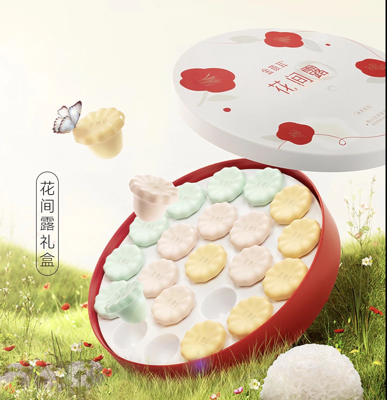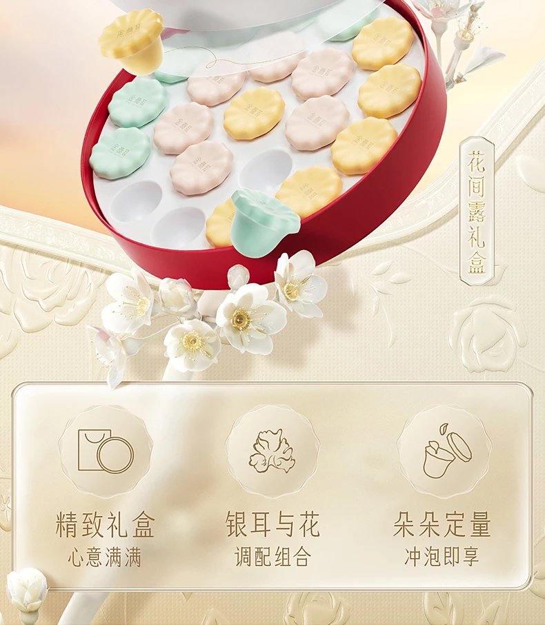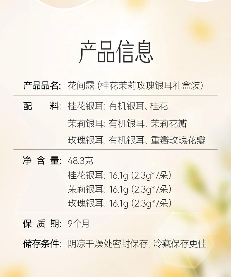 每盒花间露都有三种口味:茉莉银耳,玫瑰银耳,桂花银耳,一盒有21朵,每个口味各7朵;