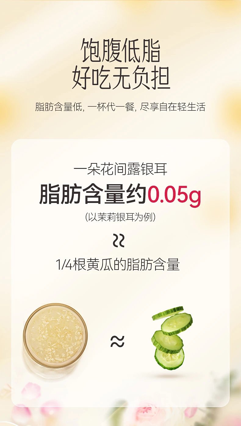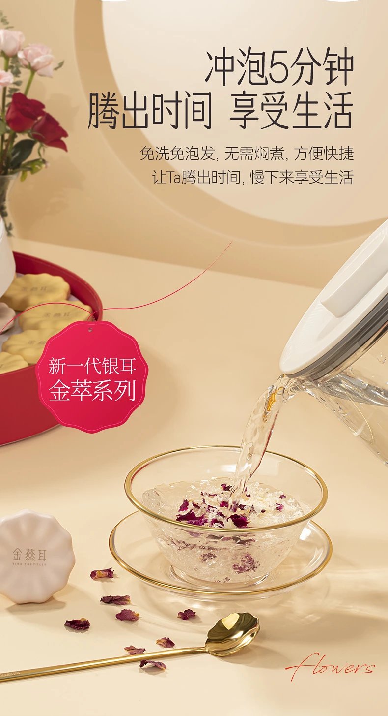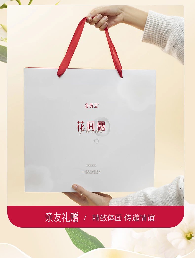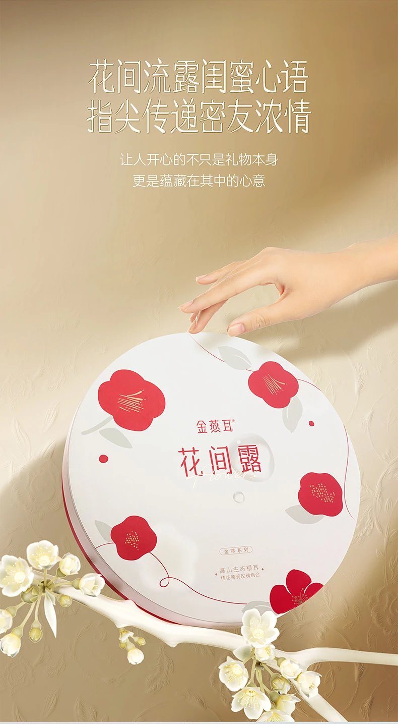 今天给大家推荐一款金燕耳的新款,花间露,免洗免泡免煮,用100度热开水冲泡5分钟即可吃上鲜炖银耳羹,Q弹又软糯,每一口都像在吃精华液。