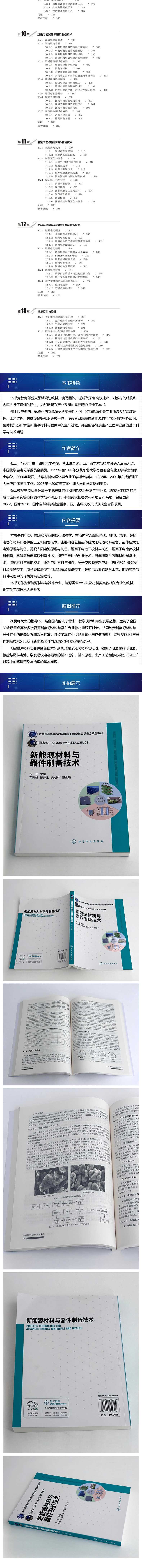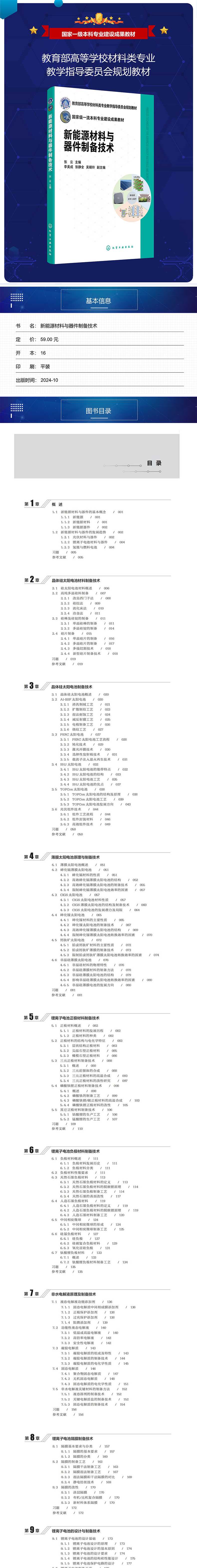 【前言】新能源技术是21世纪世界经济发展中最具有决定性影响的五大技术领域之一,新能源材料与器件是实现新能源的转化和利用以及发展新能源技术的关键。2011年批准创办;新能源材料与器件专业,该专业是为适应我国新能源、新材料、新能源汽车、高端装备制造等国家战略性新兴产业发展需要而设立的战略性新兴专业。2011年,全国首批仅有15所高校设立该专业,随后设立学校和招生规模不断扩大,截至2023年底,全国有150余所高校设立该专业。由于新能源材料与器件专业为新兴的交叉学科,专业跨度大,涉及材料、物理、化学、电子、机械等多学科,这给该专业教学带来很大的难度,既缺乏核心的专业课程,也没有相匹配的核心专业教材。为了满足这一新专业的教学需求,在化学工业出版社的支持下,相关高校多次召开教材建设研讨会,于2019年在北京达成共识,共同打造《能量转化与存储原理》《新能源材料与器件制备技术》以及《新能源器件与系统》3门核心课程教材。《能量转化与存储原理》的主要内容应为能量转化与存储的共性原理,从电子、离子、分子、能级、界面等过程去阐述;《新能源材料与器件制备技术》的内容承接原理的落地,目前阶段可以综合光伏、锂电、燃电、超级电容等材料和器件的工艺和设备;《新能源器件与系统》的内容注重器件的系统优化、同种器件系统、不同能量转换或存储器件的系统集成等,是工艺的延伸。三门核心课程是总分总的关系。在三门课程学习后的基础上,继续学习光伏、锂离子电池、燃料电池和超级电容器等方向的专业特色课程。在2020年,该系列教材得到了高等学校材料类专业教学指导委员会的立项支持,并在2021年由材料教指委推荐,加入新兴领域教材研究与实践项目,进一步结合新兴领域的人才培养需要,广泛听取各高校建议,对系列教材的结构和内容安排详细研讨、组织与规划,最终形成确定的编写方案。本教材重点讲述新能源材料与器件的制备工艺和技术。教材系统介绍光伏材料与电池、锂离子电池及材料、氢能与燃料电池,以及超级电容器等的基本概念、原理、工艺和主要设备。通过本书的学习,要求学生学习和掌握已经规模化、成熟化的新能源材料与器件中核心材料与关键器件的生产过程,并且能够解决生产过程中遇到的基本科学与技术问题。同时,教材内容结合当前国际关系发展态势与国家科技发展重大需求,培养学生们对本学科专业的学习热情与科研兴趣,激发学生追求学习报国、科技强国的爱国主义精神。全书共分13章,第1章由四川大学张云编写,第2章由四川大学张静全编写,第3章华东理工大学袁晓和柳翠编写,第4章由华北电力大学李美成编写,第5章由四川大学张云和武开鹏编写,第6章由西南石油大李星编写,第7章由武汉大学曹余良编写,第8章由湘潭大学雷维新编写,第9章由合肥工业大学朱继平编写,第10章由中南大学纪效波和邹国强编写,第11章由四川大学吴朝玲编写,第12章由武汉理工大学木士春编写,第13章由北京理工大学郭兴明编写。由于我们的水平有限,本书难免有疏漏和贻误,诚望专家和读者批评指正。