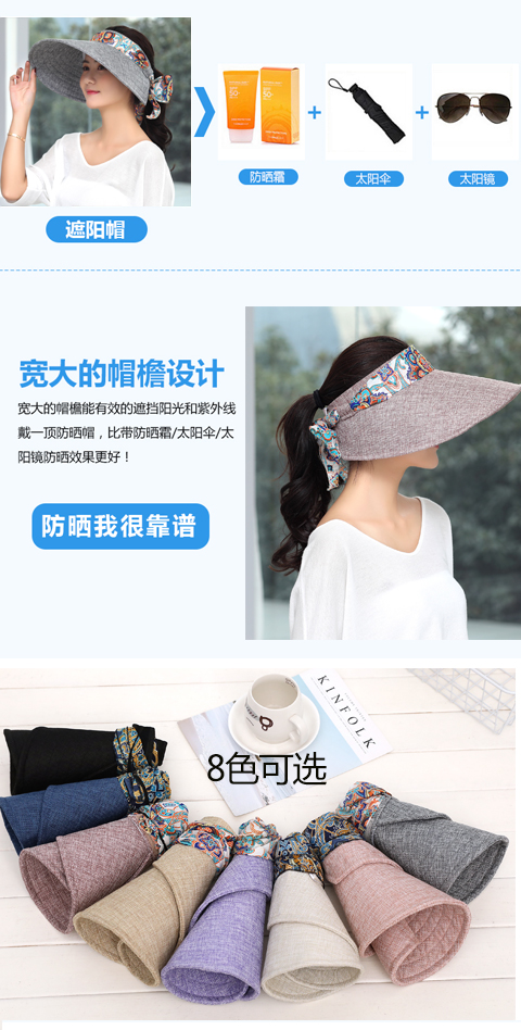 方便携带太阳帽加长帽檐16cm,有效隔离99%以上的紫外线,达到UPF50+以上的防晒,材质棉麻布料透气性能好,吸汗,时尚,让女性佩戴更显优雅品味,做工精细整洁,佩戴舒适,逛街,旅游骑车必备