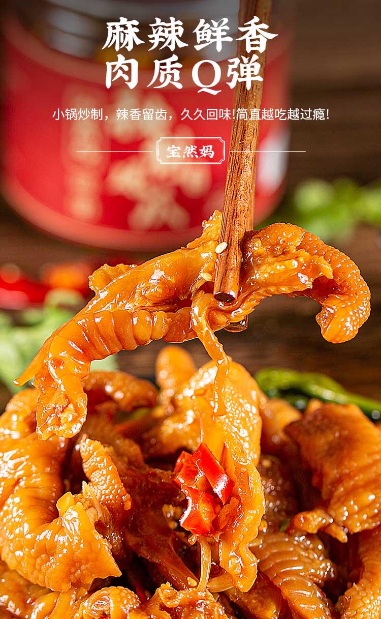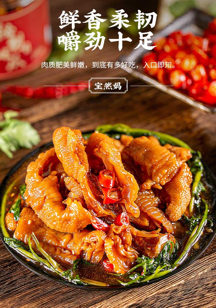 宝然妈椒麻大杂烩精选新鲜食材,新鲜又营养,五种美味有荤有素让你一次尽享!里面有劲道弹牙的鸡爪,每一种食材都经过精心挑选,保证真材实料,拒绝使用泡发剂、添加剂等,让你吃得安心、吃得放心。