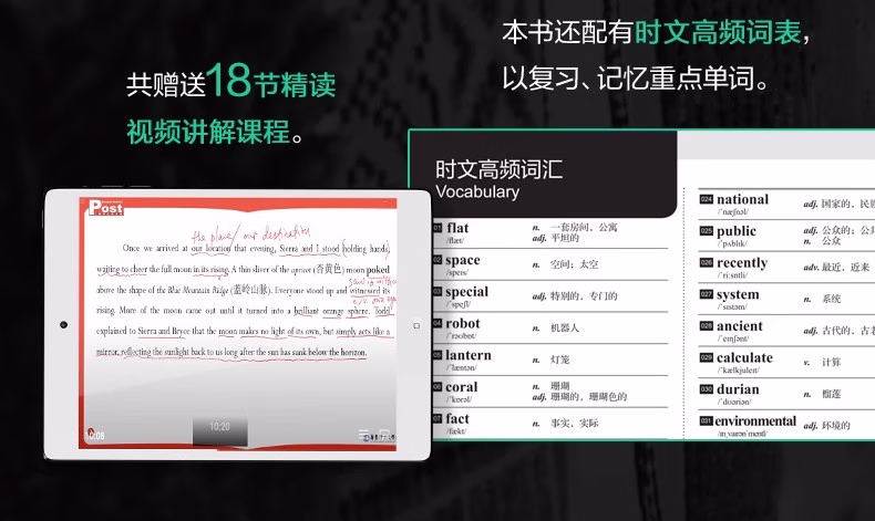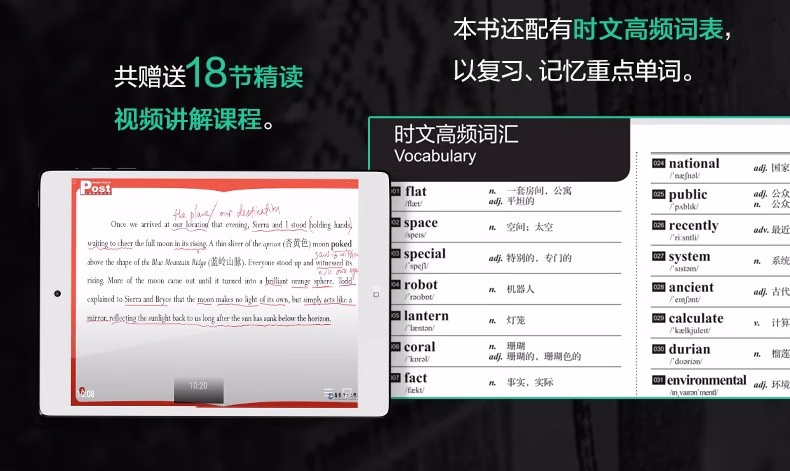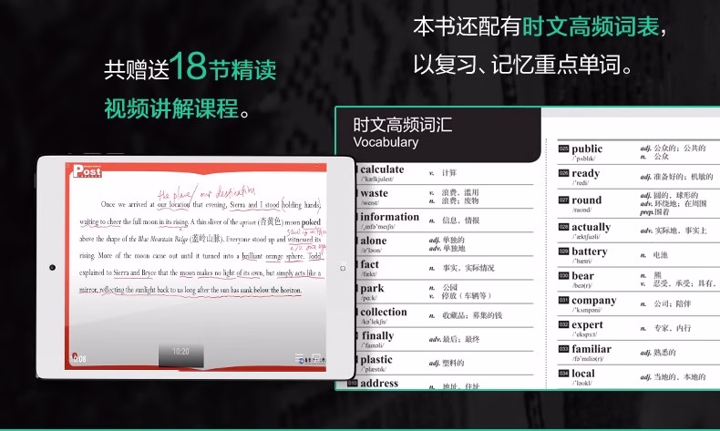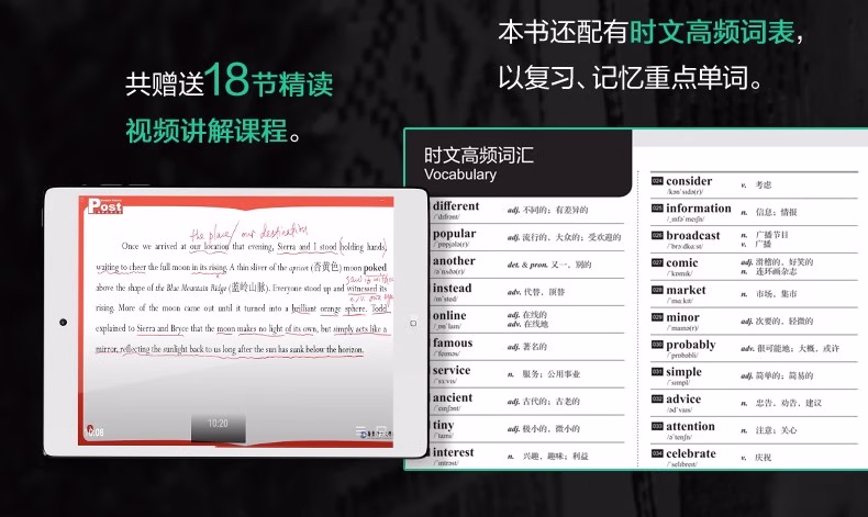 外刊中比较有时效性的文章在中考中出现频率越来越多,如何提高阅读技能的同时又紧跟时下热门时事话题?本书由名校一线老师精选与中考阅读类题目同源的外刊、外网中优质文章,按照中考试题要求改编、设题,多数篇章还经过课堂测试,保证了选文的练习有效性。按照;周的习惯,科学编排,每周包含阅读理解、完形填空、新题型(含七选五、回答问题、短文填空等)这3个必考题型,和1篇每周精读,精读 泛读结合,18周直接上一个阅读水平。每篇文章都配有答案详解、全文翻译、朗读音频,;每周精读还免费赠送视频讲解课程,多维赋能高考阅读。