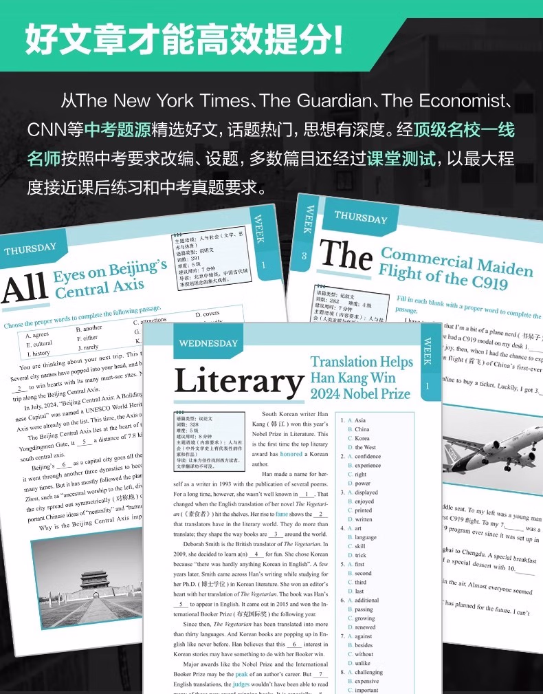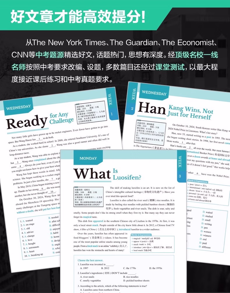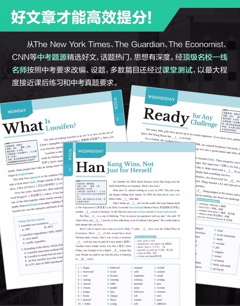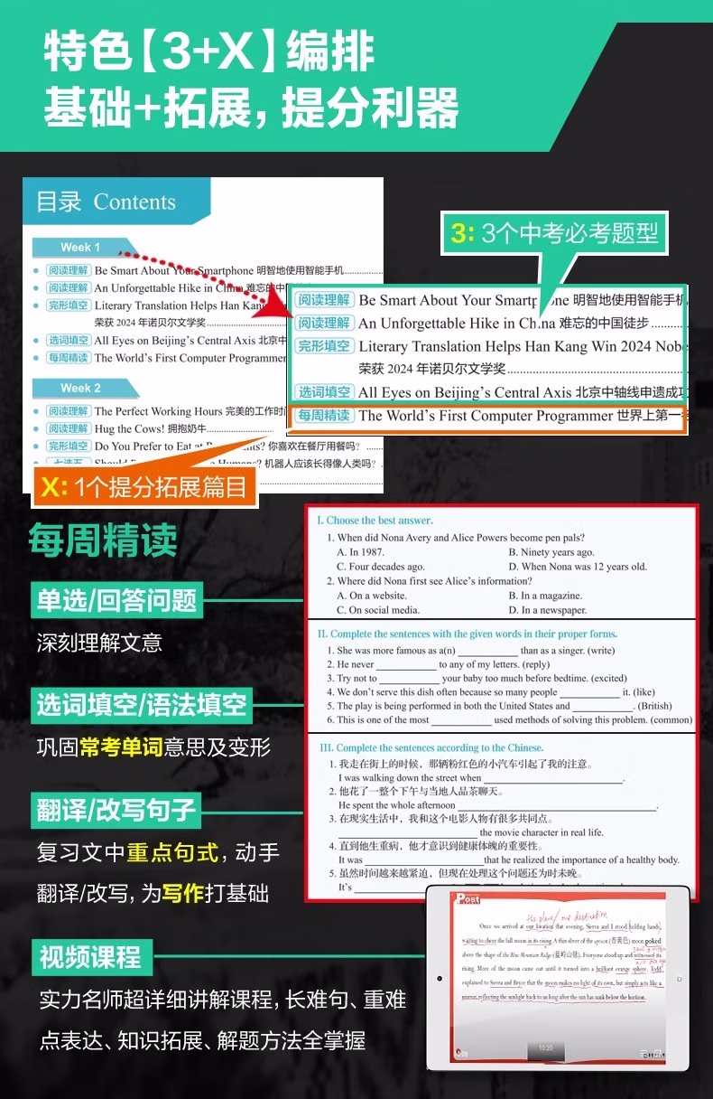本书使用说明关于选文近几年,全国各地中考英语阅读类题型的语篇大量选自外国期刊、非营利网站等,同时广泛关注时下全球热门事件与话题。以2024年为例,北京卷阅读B篇;电子垃圾回收、广州卷 D 篇;新型环保概念 upcycling和浙江卷 D 篇;给狗喂人类食物更健康分别关注了科技、环保、生物的前沿发展动向;同时,中国传统文化或中国社会时事也几乎成为近年各地中考的必考话题,如苏州卷 B 篇;电视剧《我的阿勒泰》和上海卷写作;送给外国友人中国元素的礼物等。基于此,本书精选英语国家主流期刊、报纸、网站中话题时新且具有一定深度的文章,涵盖;*要求的;人与自我;人与社会;人与自然三大主题和内容要求,由母语为英语的人士撰写,语言地道,视角独特,经名校名师改编,并按照各地中考命题要求和模式设置题目,多数篇章还经过名校student测试,中考训练的针对性强。 关于难度本系列书难度分为 1~8 级。本册选取了蓝思值在 500L~700L 的文章,并综合考虑题目难度和 6 年级student的普遍水平,将难度划分为1~3 级。值得一提的是,大多数专家和老师均认可,如果平时只练习中考真题同等难度的文章,那么student的水平上限就很难突破中考难度。只有平时练习一些难度稍大的文章才能在考试中游刃有余,驾轻就熟。因此,本书秉持;比中考真题难一点的原则,以期达到高效训练的目的。 关于;3 X本书书名中的 3 代表阅读理解、完形填空和新题型(含回答问题、短文填空、七选五等)这 3 种中考题型。X 代表本书特色篇目;每周精读。本篇除训练对文章的理解外,还通过填空、翻译、改写等形式,巩固语篇中的重难点词汇和句型,同时为写作打下基础。此外,本篇还配备了名师课程,详细讲解文章语言点和解题步骤。关于时文高频词汇外刊时文的独特之处很大程度体现在用词上。别册附赠的词汇表按照频率,筛选出本书中的初中;*重点词汇和部分常出现的超纲词汇,希望同学们在学完文章后,再巩固这些需要重点掌握的词汇。关于本书配套资源本书所有篇章都配有习题答案与详解、译文、全文朗读音频,;每周精读配有视频讲解课程。同学们可先做题,根据需要查阅答案和详解,对照原文查看译文,逐字逐句搞清楚英文表达的意思。朗读音频为英音朗读,同学们可在学习完语篇后利用碎片化时间听音频,纠正发音的同时锻炼听力水平。