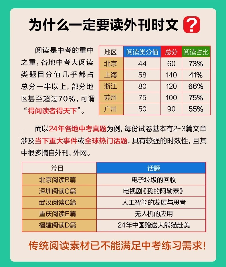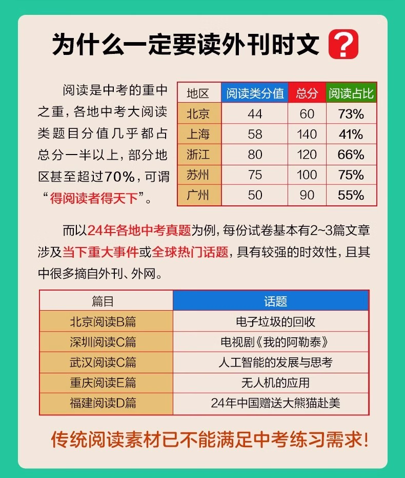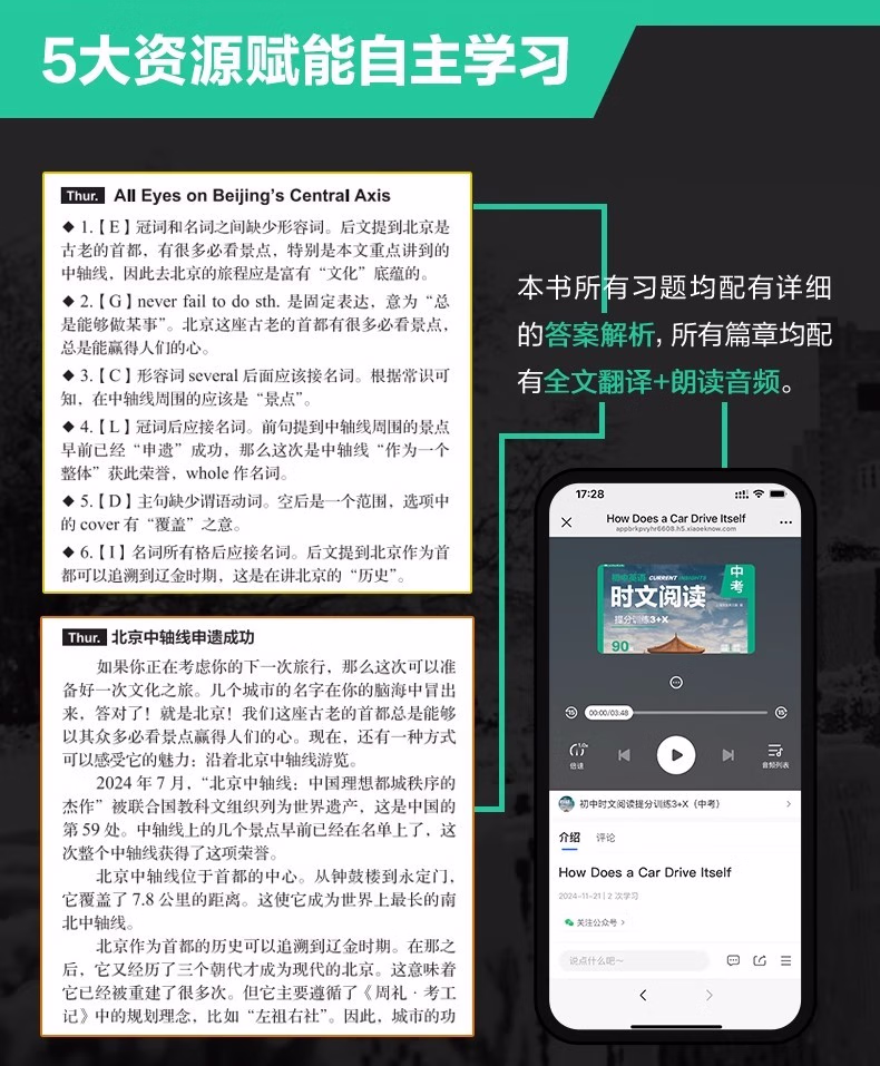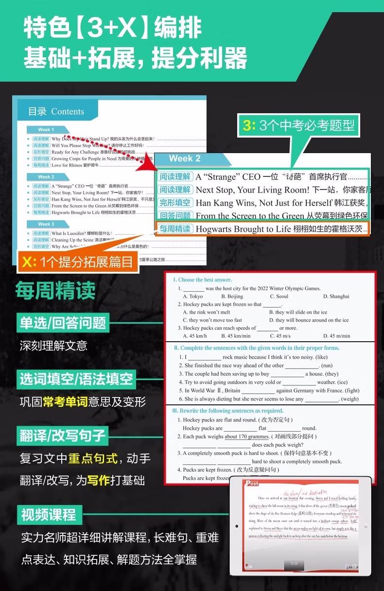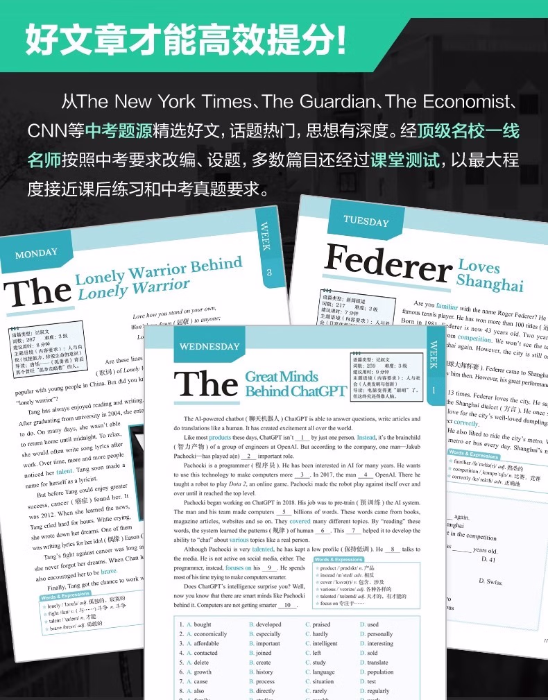 本书使用说明关于选文近几年,全国各地中考英语阅读类题型的语篇大量选自外国期刊、非营利网站等,同时广泛关注时下全球热门事件与话题。以2024年为例,北京卷阅读B篇;电子垃圾回收、广州卷 D 篇;新型环保概念 upcycling和浙江卷 D 篇;给狗喂人类食物更健康分别关注了科技、环保、生物的前沿发展动向;同时,中国传统文化或中国社会时事也几乎成为近年各地中考的必考话题,如苏州卷 B 篇;电视剧《我的阿勒泰》和上海卷写作;送给外国友人中国元素的礼物等。基于此,本书精选英语国家主流期刊、报纸、网站中话题时新且具有一定深度的文章,涵盖;*要求的;人与自我;人与社会;人与自然三大主题和内容要求,由母语为英语的人士撰写,语言地道,视角独特,经名校名师改编,并按照各地中考命题要求和模式设置题目,多数篇章还经过名校student测试,中考训练的针对性强。 关于难度本系列书难度分为 1~8 级。本册选取了蓝思值在 500L~700L 的文章,并综合考虑题目难度和 6 年级student的普遍水平,将难度划分为1~3 级。值得一提的是,大多数专家和老师均认可,如果平时只练习中考真题同等难度的文章,那么student的水平上限就很难突破中考难度。只有平时练习一些难度稍大的文章才能在考试中游刃有余,驾轻就熟。因此,本书秉持;比中考真题难一点的原则,以期达到高效训练的目的。 关于;3 X本书书名中的 3 代表阅读理解、完形填空和新题型(含回答问题、短文填空、七选五等)这 3 种中考题型。X 代表本书特色篇目;每周精读。本篇除训练对文章的理解外,还通过填空、翻译、改写等形式,巩固语篇中的重难点词汇和句型,同时为写作打下基础。此外,本篇还配备了名师课程,详细讲解文章语言点和解题步骤。关于时文高频词汇外刊时文的独特之处很大程度体现在用词上。别册附赠的词汇表按照频率,筛选出本书中的初中;*重点词汇和部分常出现的超纲词汇,希望同学们在学完文章后,再巩固这些需要重点掌握的词汇。关于本书配套资源本书所有篇章都配有习题答案与详解、译文、全文朗读音频,;每周精读配有视频讲解课程。同学们可先做题,根据需要查阅答案和详解,对照原文查看译文,逐字逐句搞清楚英文表达的意思。朗读音频为英音朗读,同学们可在学习完语篇后利用碎片化时间听音频,纠正发音的同时锻炼听力水平。