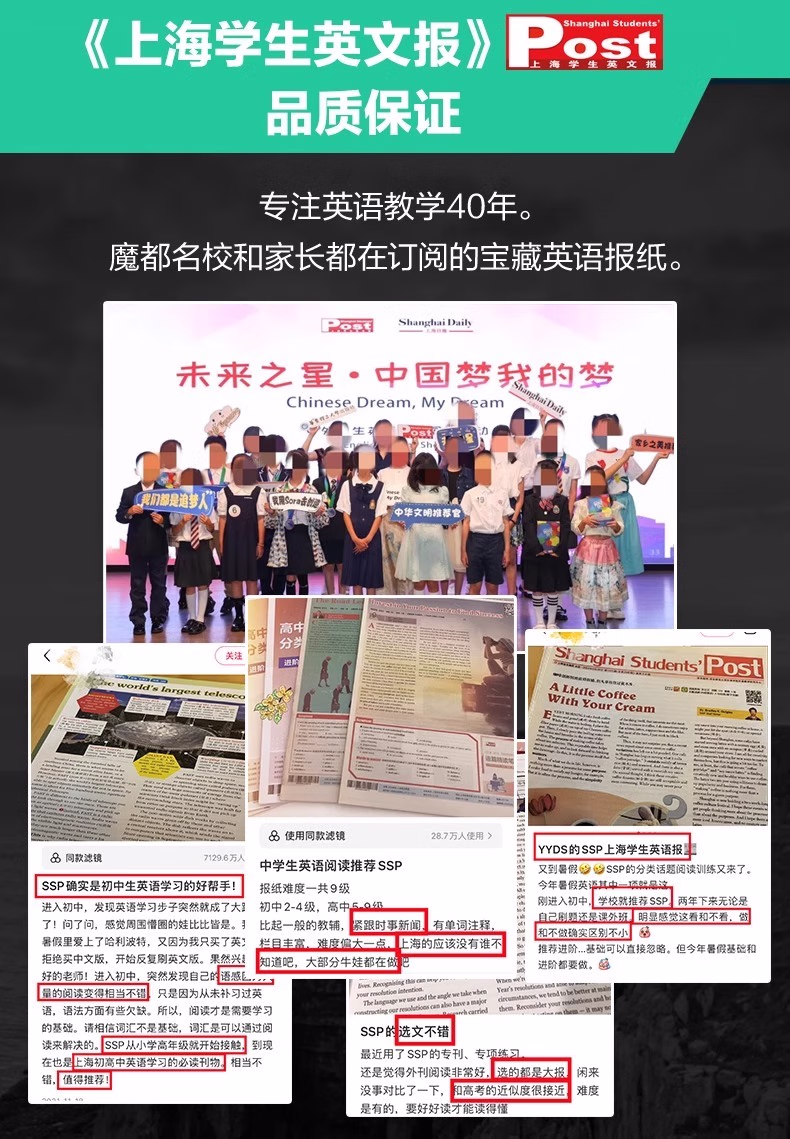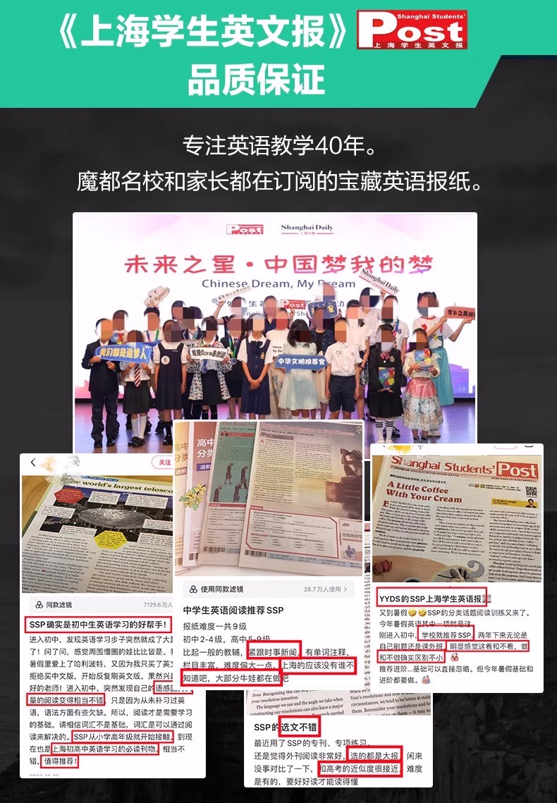 《上海student英文报》(SSP)是经上海市委宣传部批准创办的英文报刊,是融新闻与英语学习为一体的适合student阅读的英文周报。《上海student英文报》从2001年1月份起由解放日报主办,华东师范大学外语学院协办。新闻版报道校园新闻及国内外大事,具有一定的时效性;阅读版刊登精美短篇及student习作,激发student学习英语的积极性;习题版刊登名校试题,专家点评及语言点分析和问题回答,紧扣教材及student需要