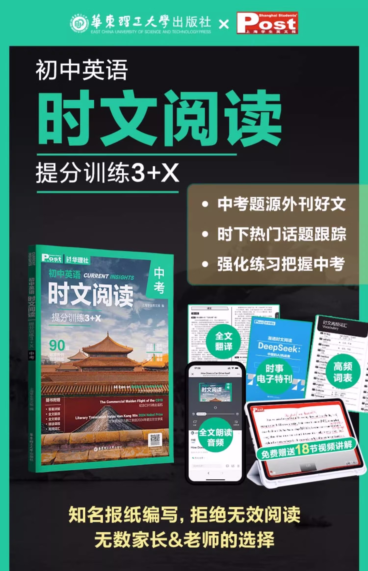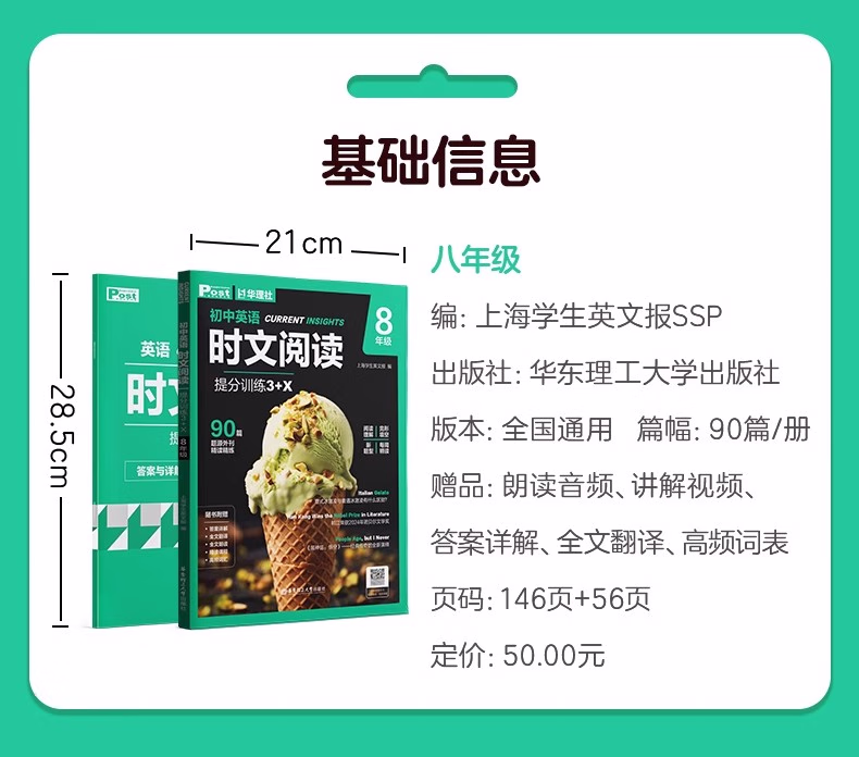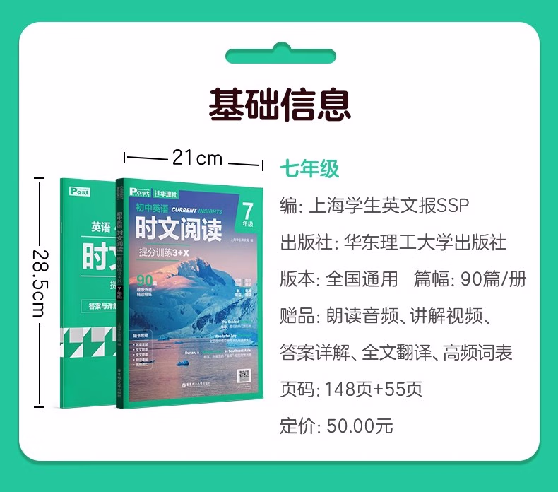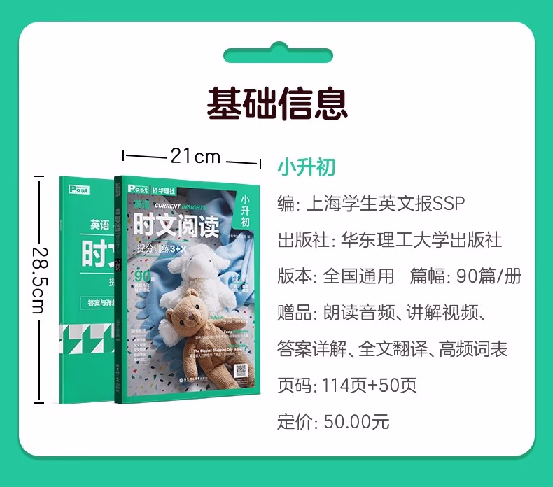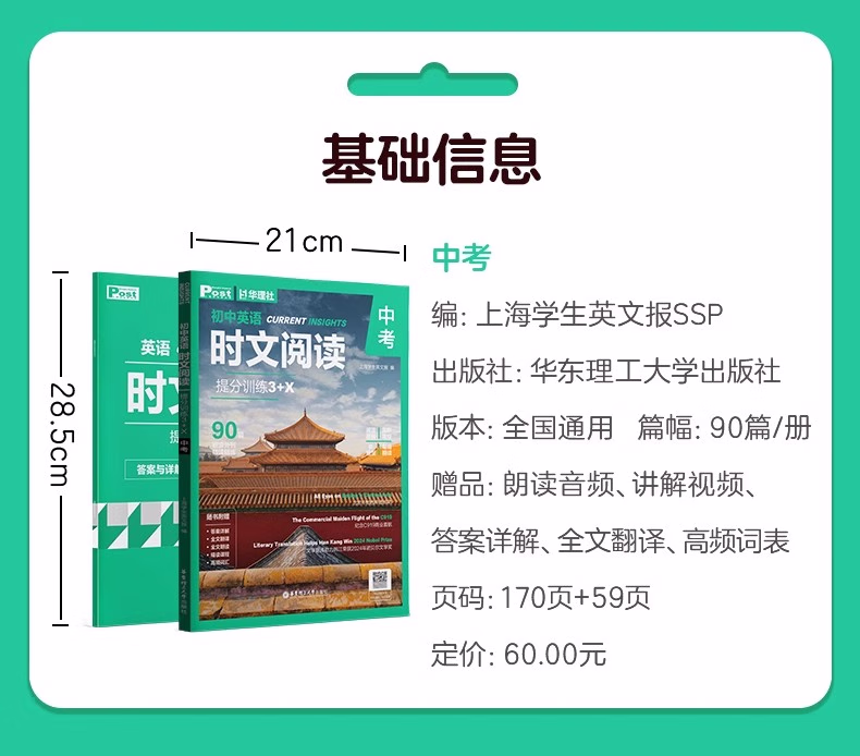 随着;*的实施,近年来各地中考阅读试题中越来越多地采用外刊、时事、中国传统文化等素材。为扩大学生的阅读视野,提升文化素养,提高英语阅读水平,我们编写了本系列;时文阅读图书,从《上海学生英文报》中撷取优质的素材,根据一线教学和中考要求编写及设置考题。按照;周的阅读习惯,本系列书在每周科学地编入了2篇阅读单选,1篇完形填空,1篇回答问题、短文填空等在内的阅读新题型。除此之外,更搭配了1篇每周精读,阅读层次更深,题目考查范围更广,并配以视频讲解课程。本系列书所有习题均配有详细的答案解析、中文翻译和朗读音频。