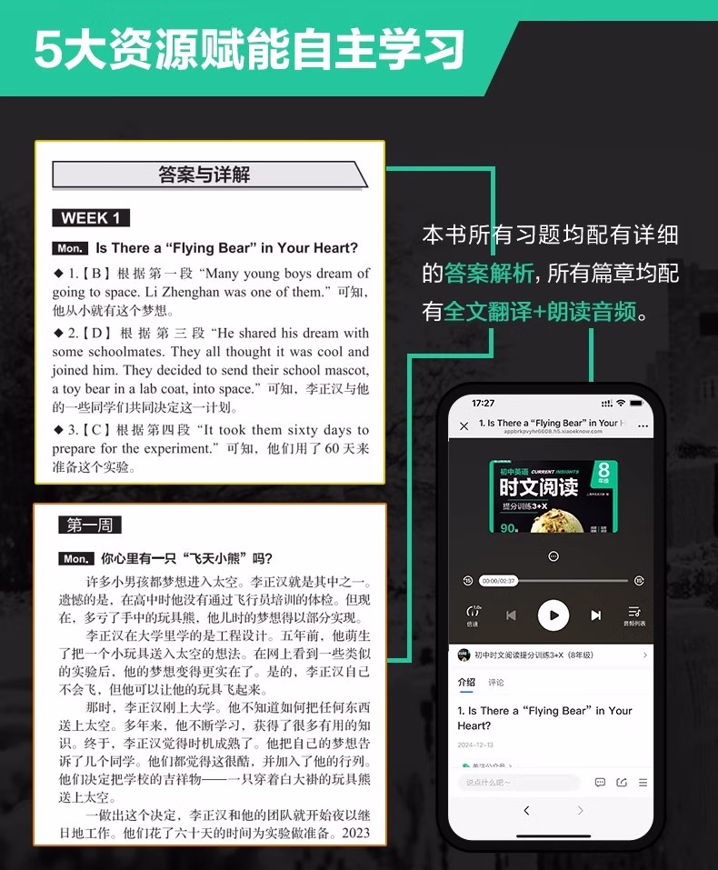 Week 1● 阅读理解 Is There a ;Flying Bear in Your Heart? 你心里有一只;飞天小熊吗? ...............................1● 阅读理解 From Alaska to Argentina 从阿拉斯加到阿根廷 ..............................................................................3● 完形填空 The Great Minds Behind ChatGPT ChatGPT 背后的聪明人 ...........................................................5● 短文填空 Han Kang Wins the Nobel Prize in Literature 韩江荣获诺贝尔文学奖 .....................................6● 每周精读 Finally a Weather Girl 终于成为气象女孩 .........................................................................................7Week 2● 阅读理解 What Is Age? 年龄是什么? ..................................................................................................................9● 阅读理解 Federer Loves Shanghai 费德勒喜欢上海 .......................................................................................11● 完形填空 People Age but I Never 人们会变老,但我不会 .......................................................................... 12● 表格填空 Now Shersquo;s Seen Differently 现在,人们对她的看法不同了 ...................................................... 14● 每周精读 My Family Members 我的家庭成员 ................................................................................................ 15Week 18● 阅读理解 Sending Library Books Home 把图书馆的书寄回家 .................................................................139● 阅读理解 Letrsquo;s Go Skiing! 让我们去滑雪吧! ..............................................................................................141● 完形填空 To Teach or Not to Teach? 教还是不教? ....................................................................................143● 表格填空 ;Guess What Irsquo;ve Found! ;猜猜我找到了什么! ..................................................................144● 每周精读 Time to Reunite 重聚时刻 ................................................................................................................145