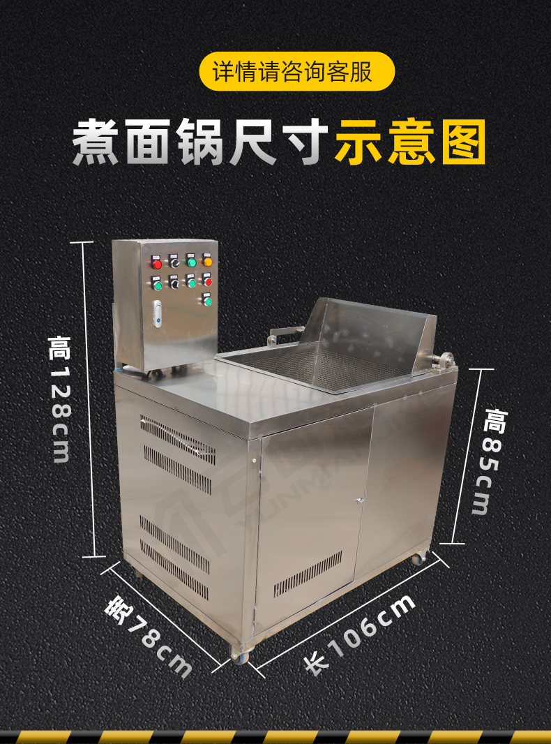 纯烧电的煮面锅总耗电18kw,3个档位。自动翻斗煮面全自动。95x70x85cm