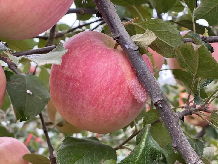 每一颗与枝干靠上的苹果,都被小心翼翼的垫上了一块专用的泡沫,以防把苹果膈伤。