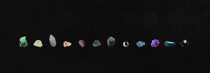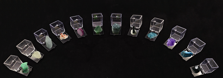 石榴子石、紫水晶、海蓝宝石、钒铅矿/紫锂辉石、祖母绿、月光石、红刚玉、橄榄石、蓝刚玉、碧玺、托帕石、磷灰石