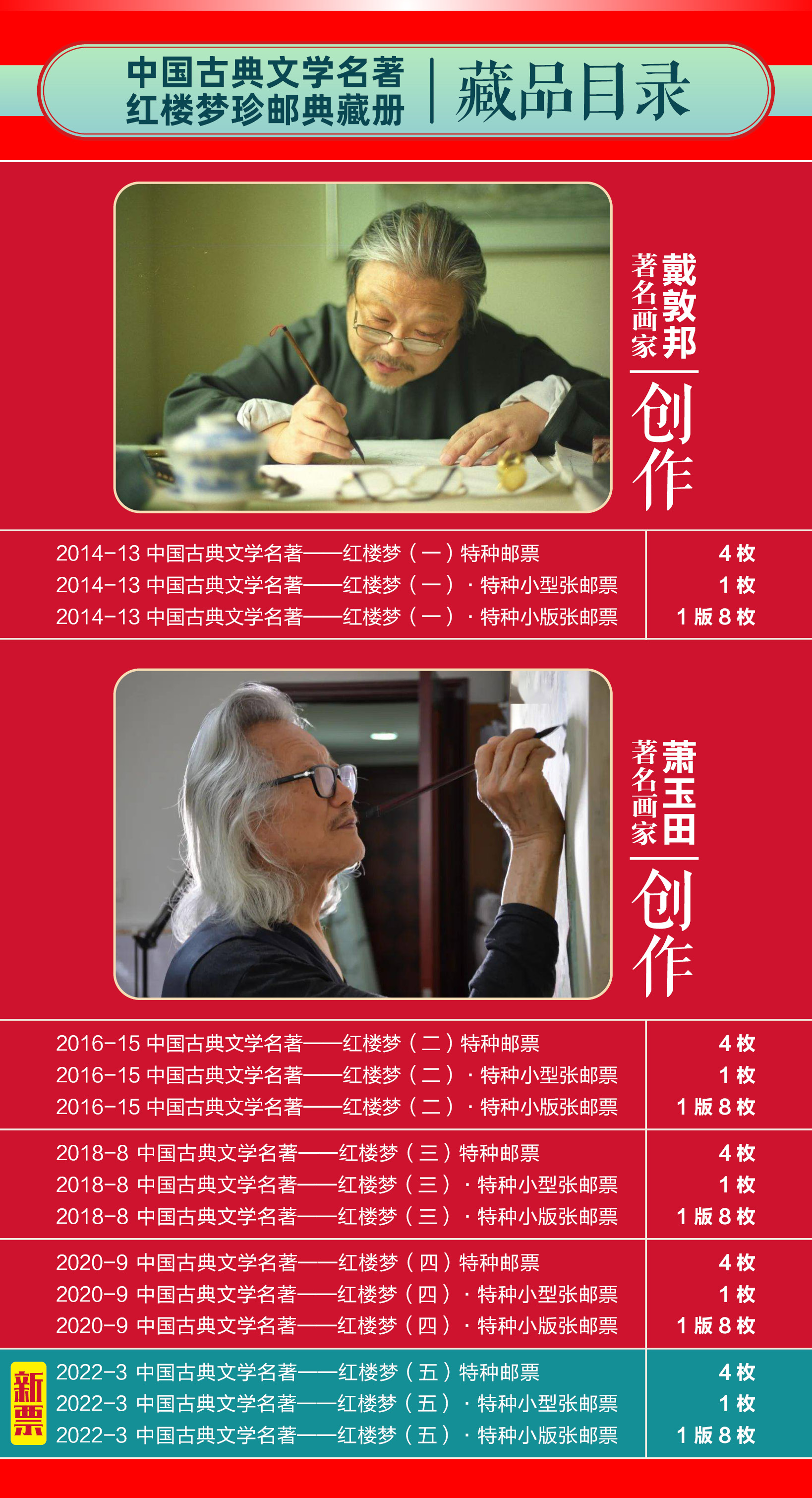 红楼系列艺术瑰宝:红楼梦邮册,内含2014-2022年发售的(一)至(五)邮票全集,大师设计,每一张都是经典,收藏价值高的邮册之一