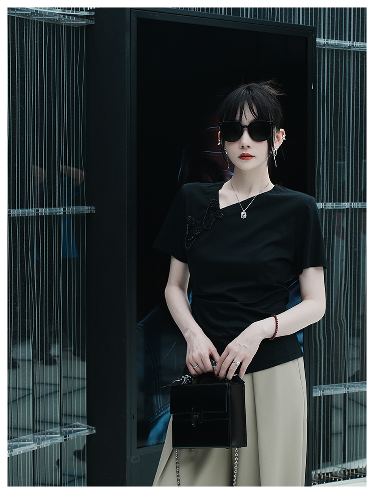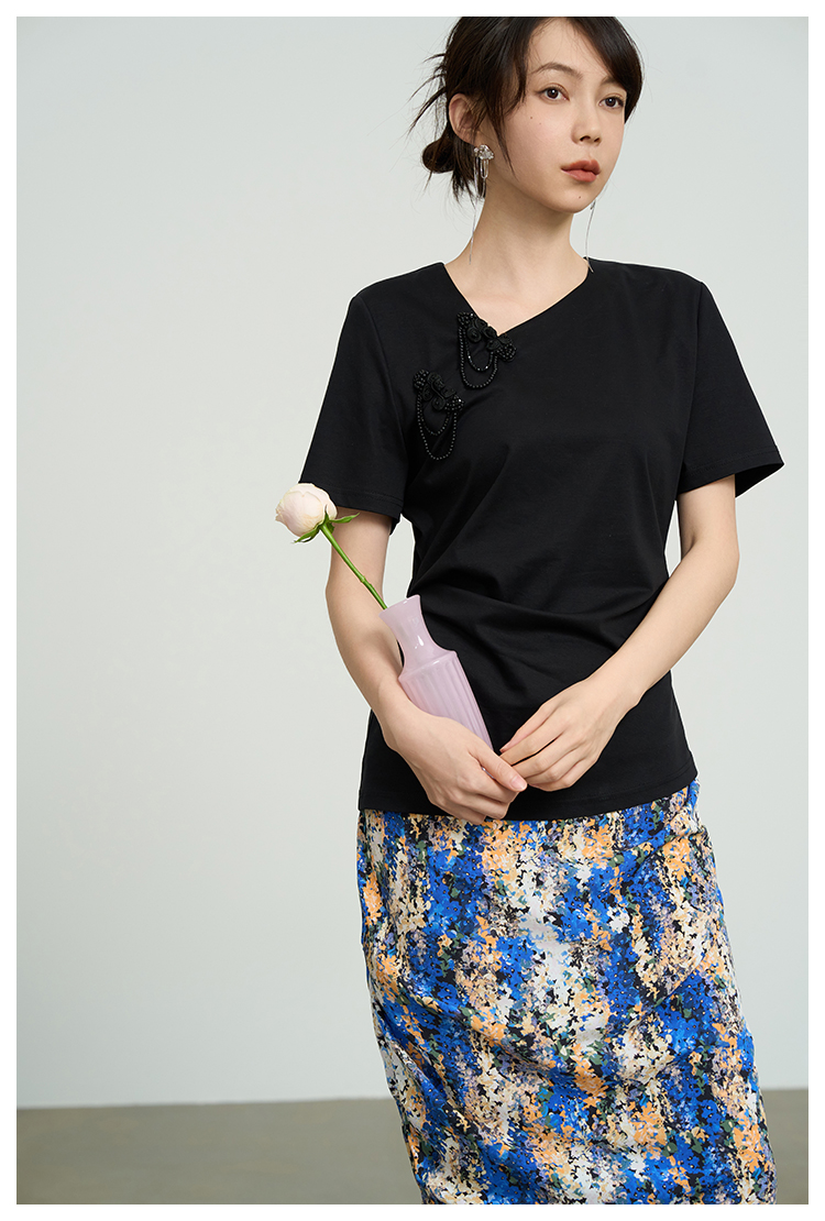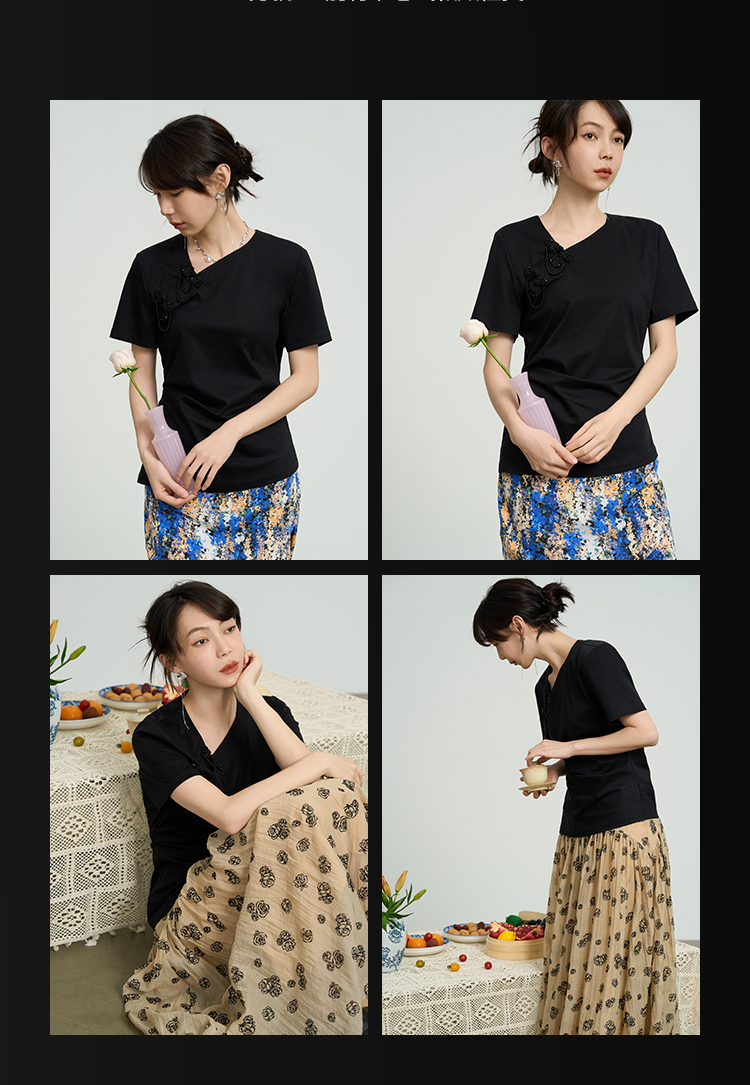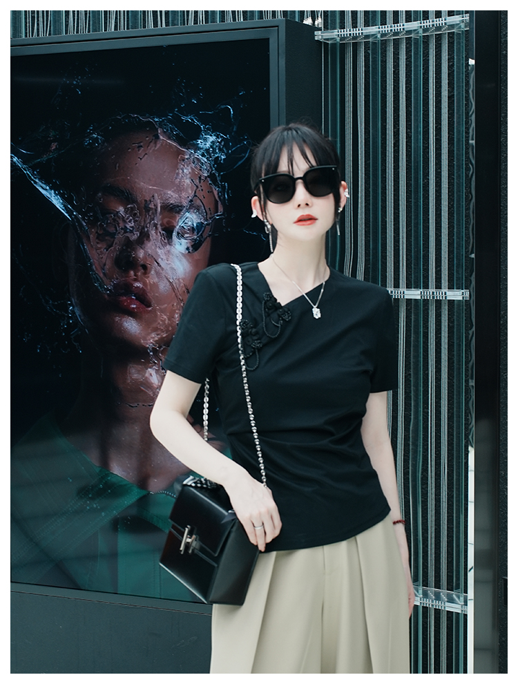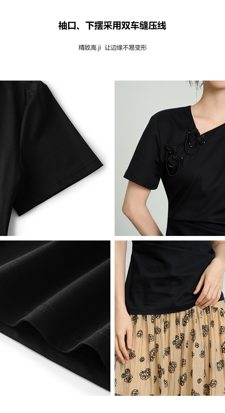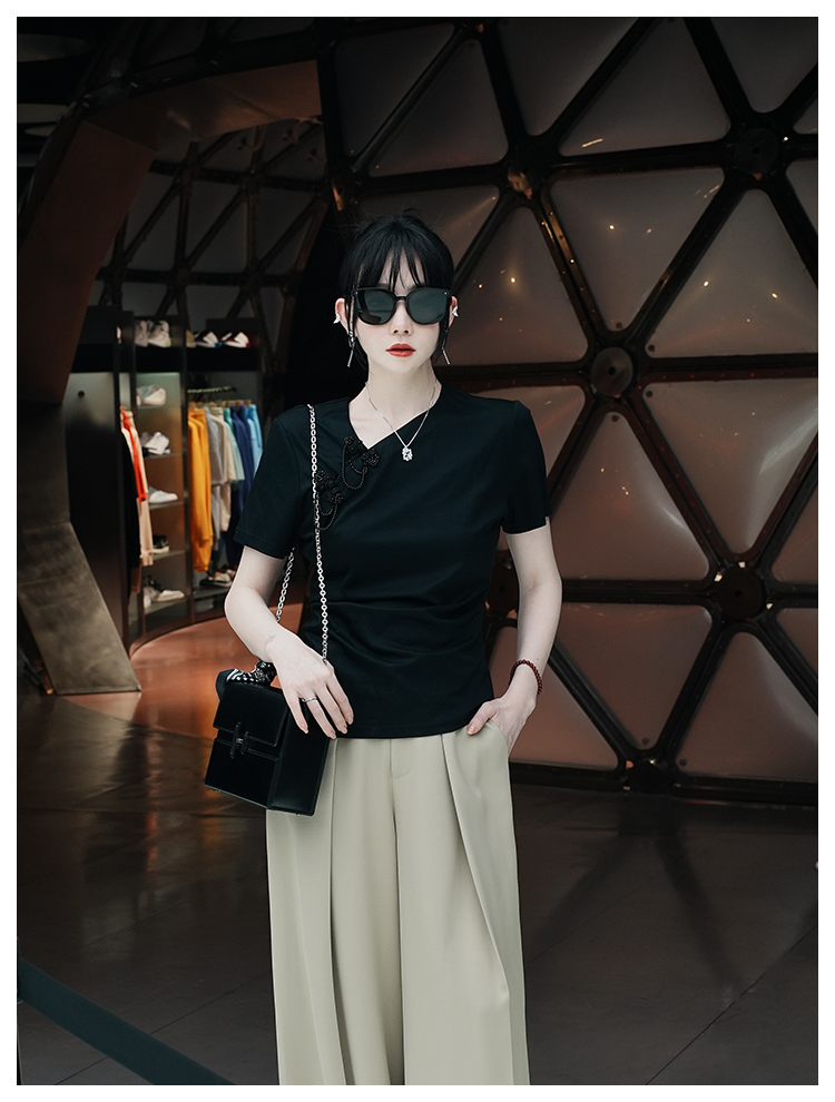 【99元/2件任选|不退换】T575H国风情调中式改良手工一字盘扣T恤上衣黑色短袖