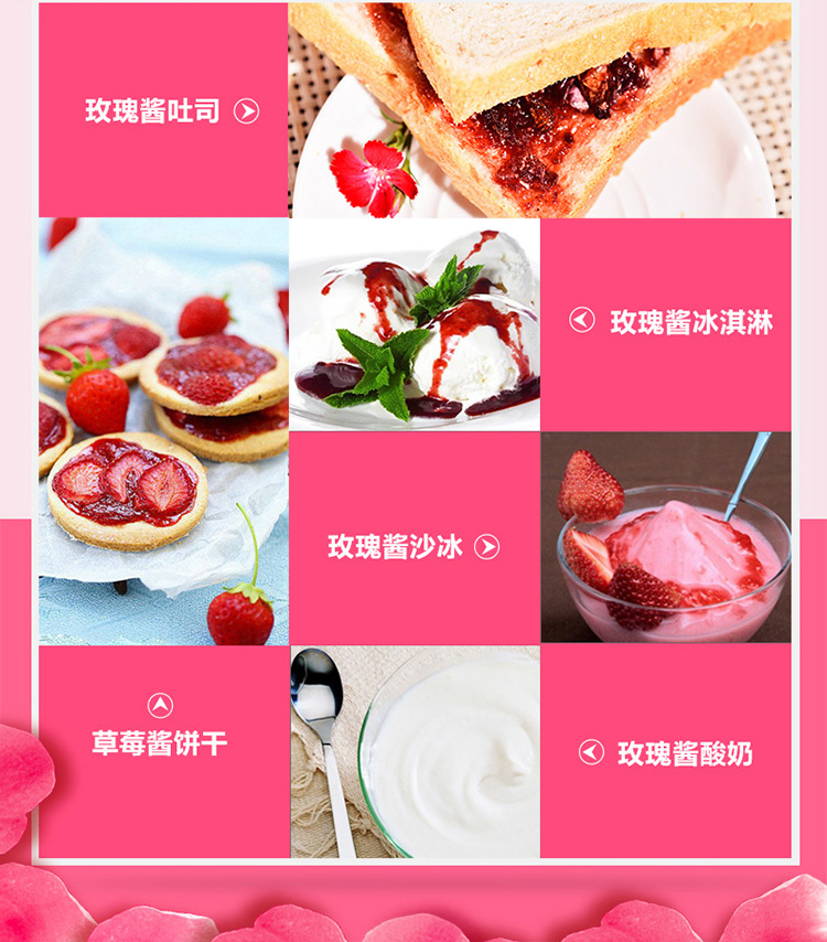 备注 玫瑰酱口感香甜,仅需一点即可营养美味,不要食用过多。