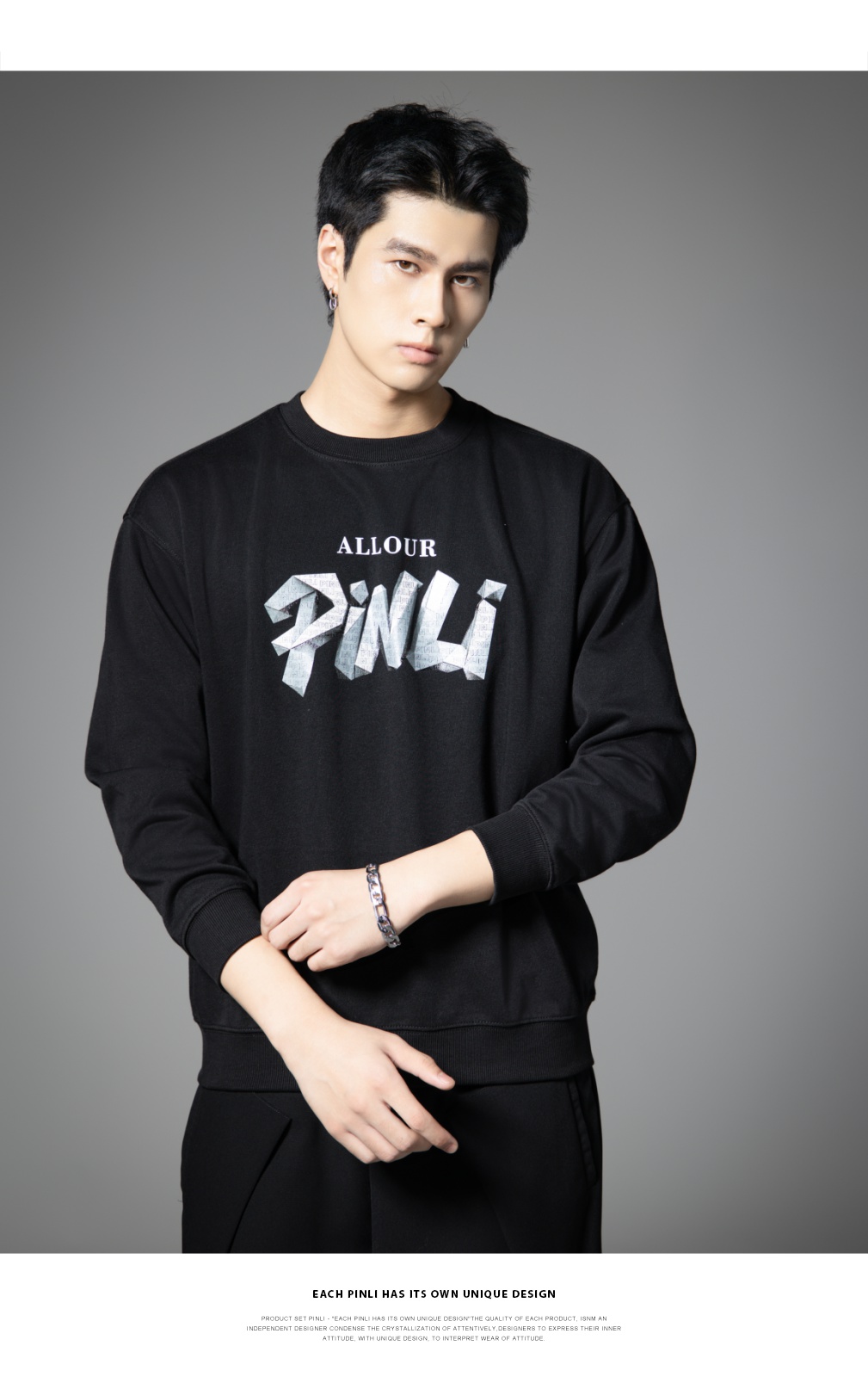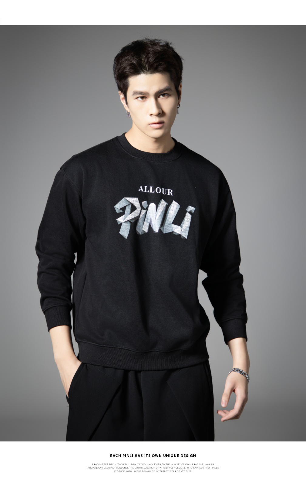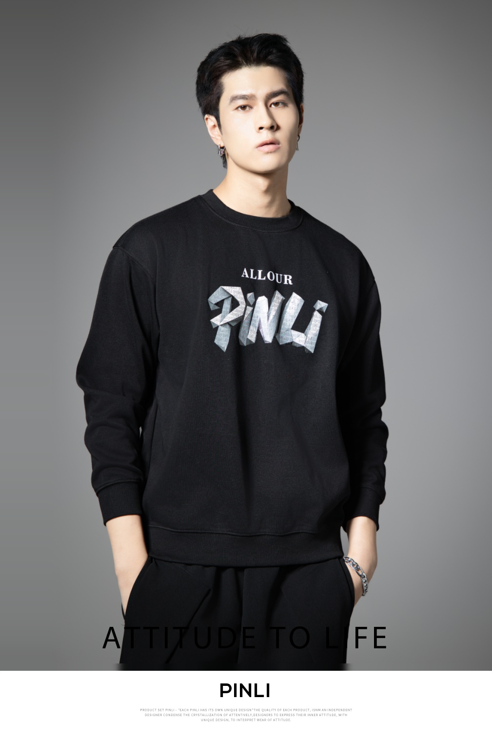 PINLI品立2025秋季新款男士宽松圆领字母印花套头卫衣长袖上衣潮BG253109011