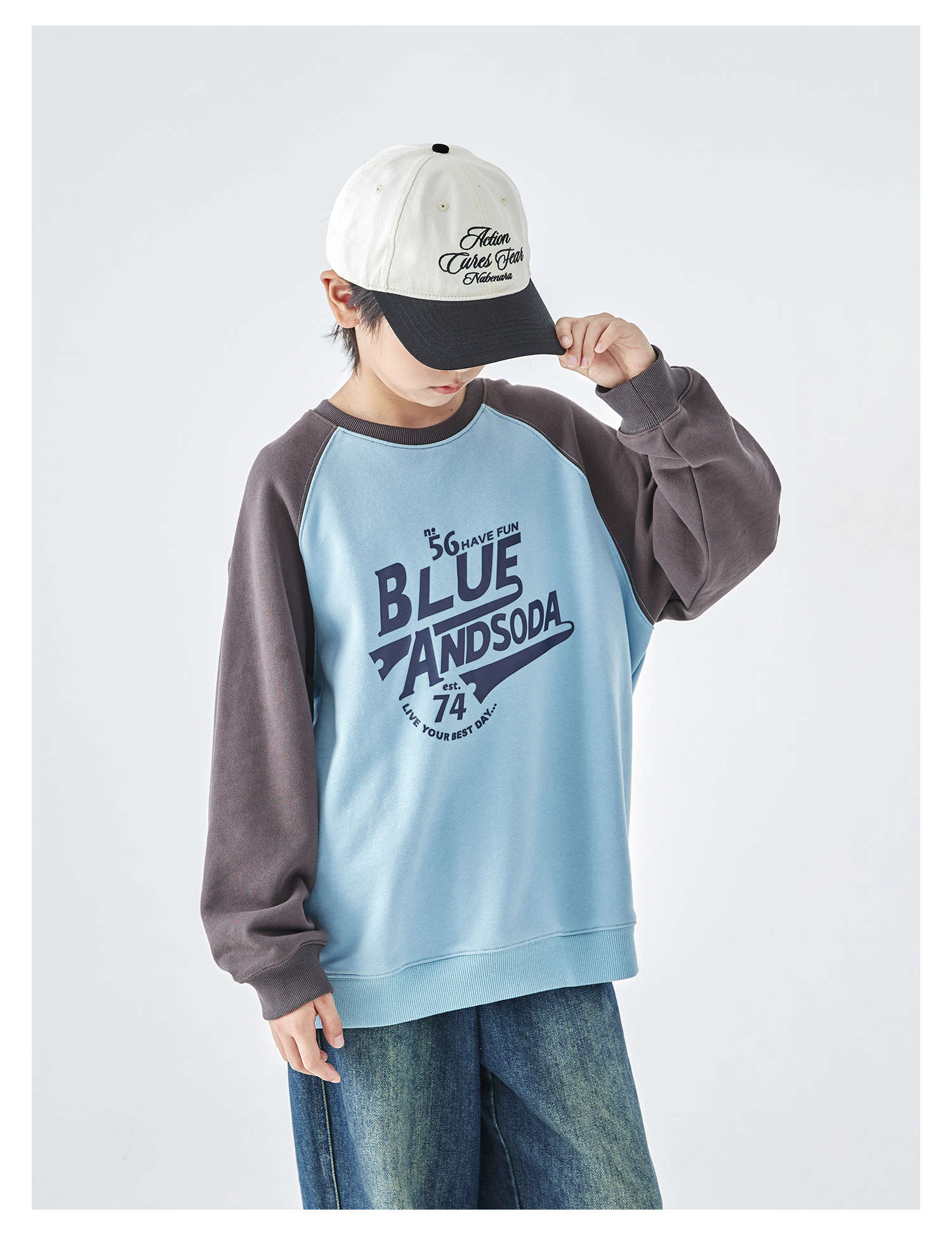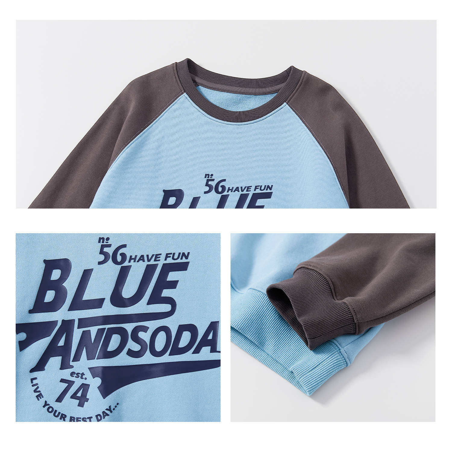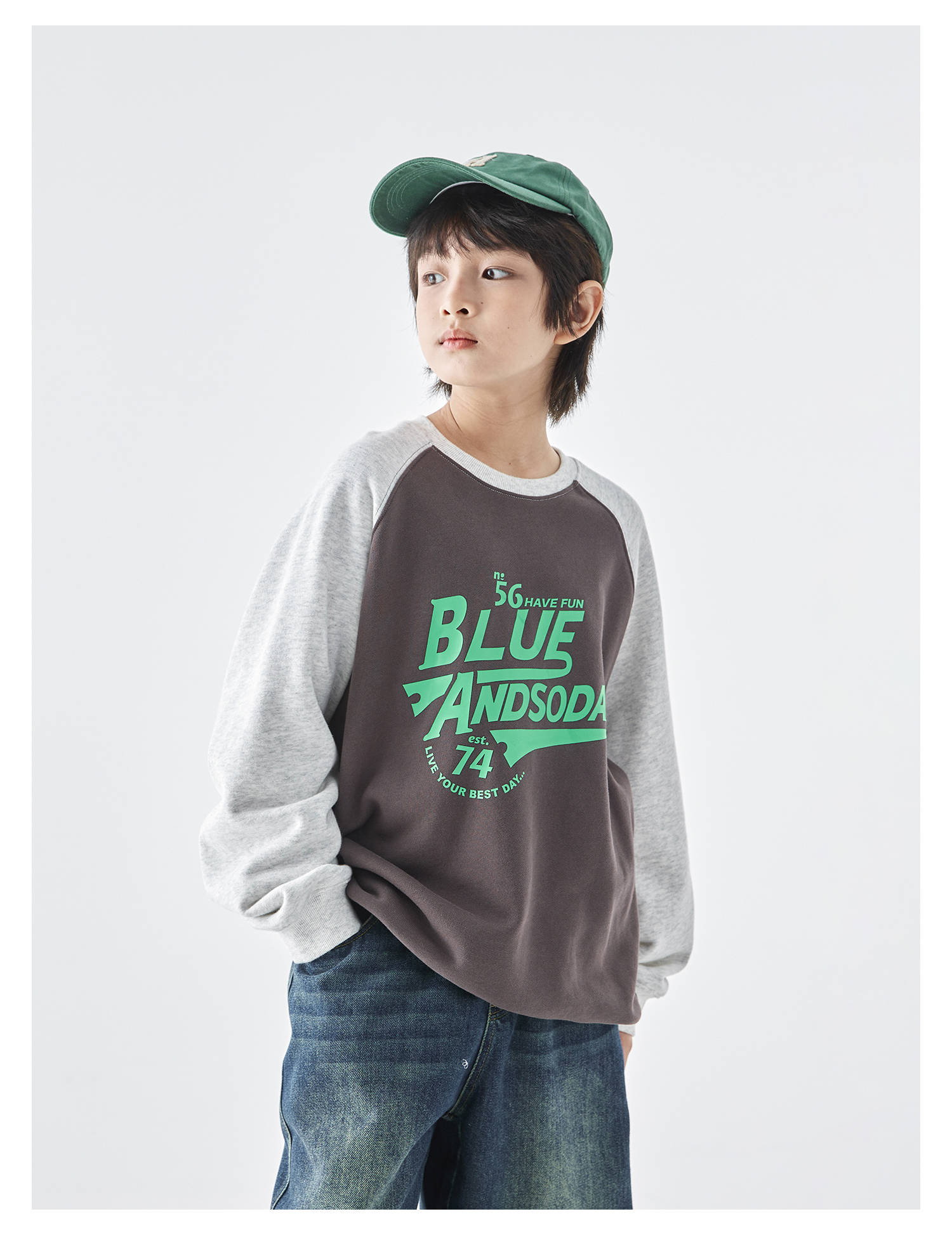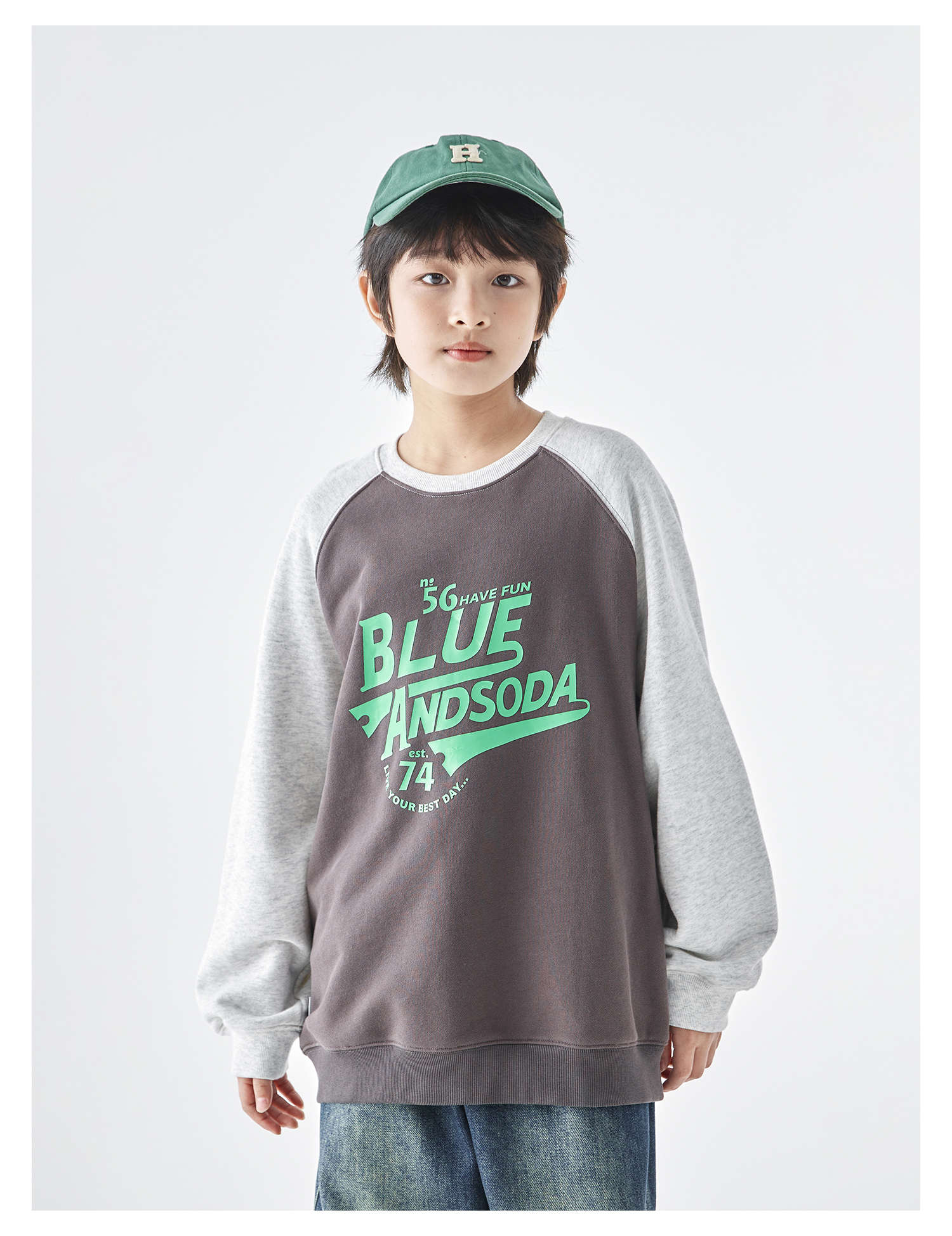 蓝汽水25年秋季新款亲子装中大男童字母插肩卫衣美式复古撞色上衣